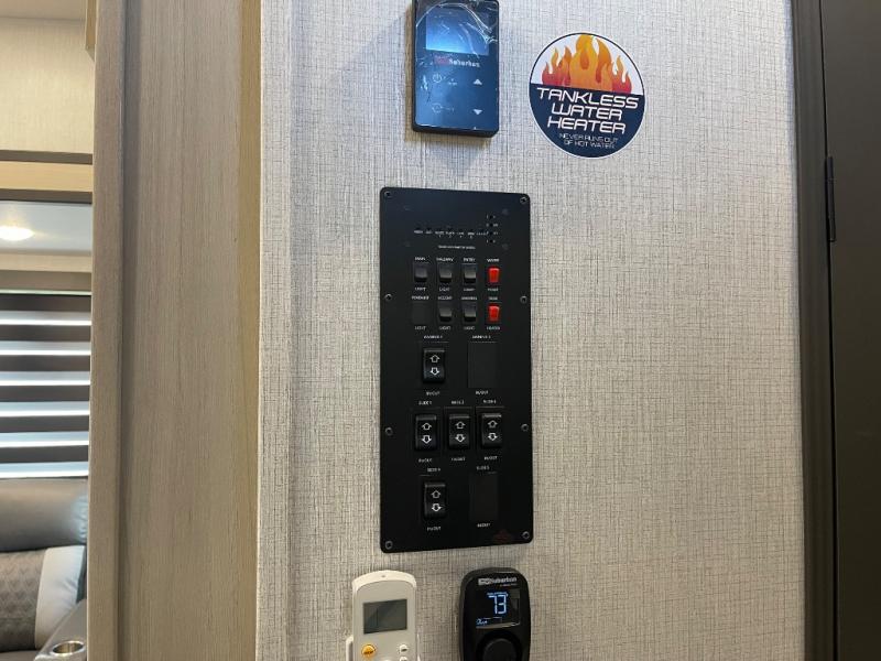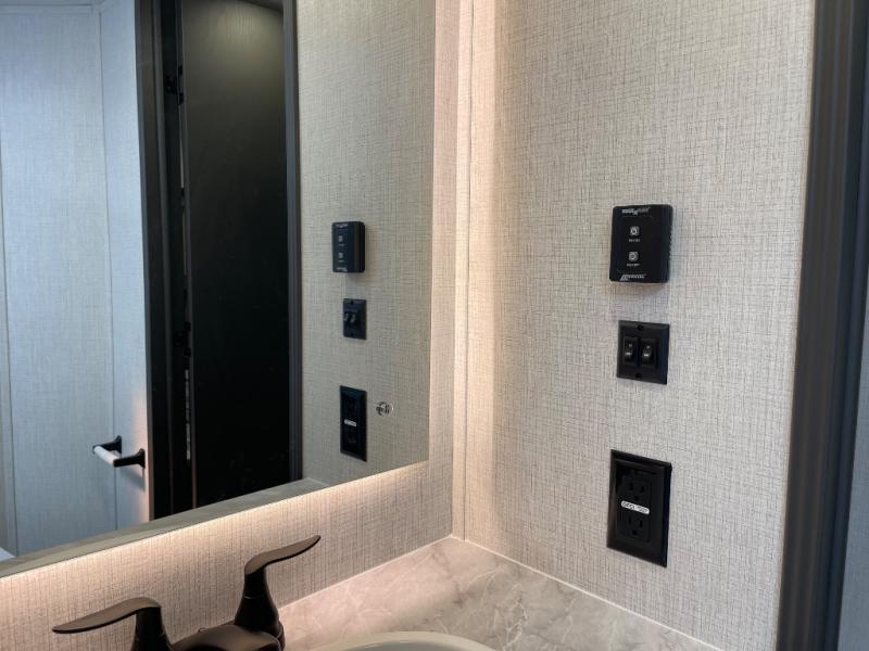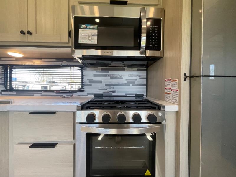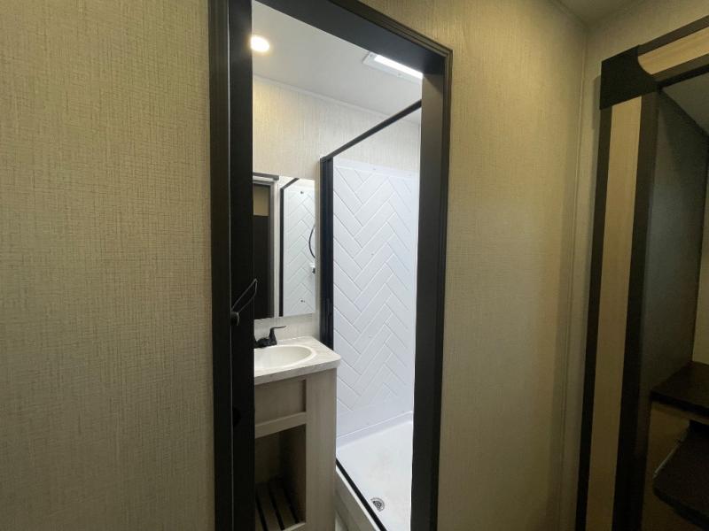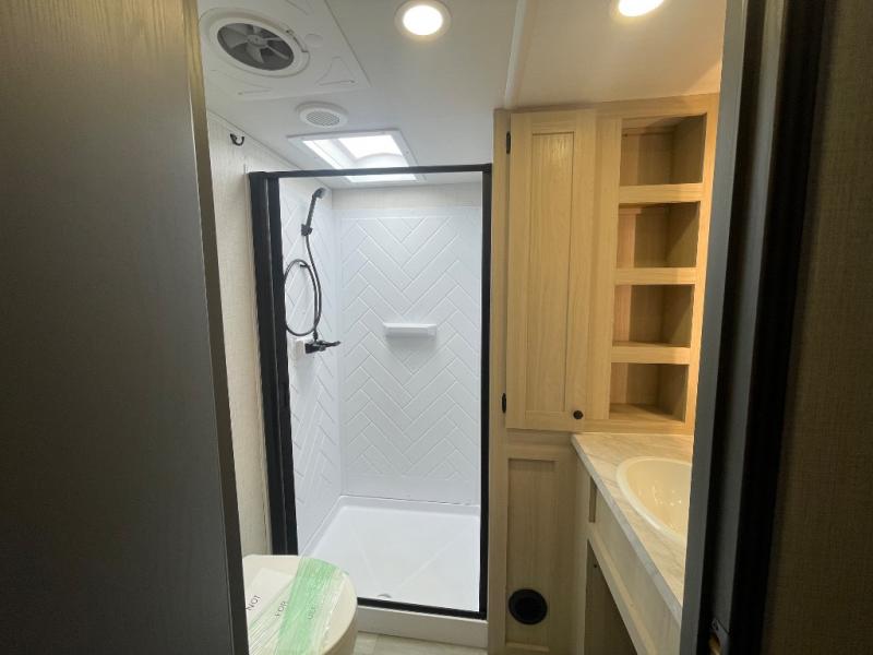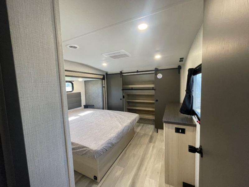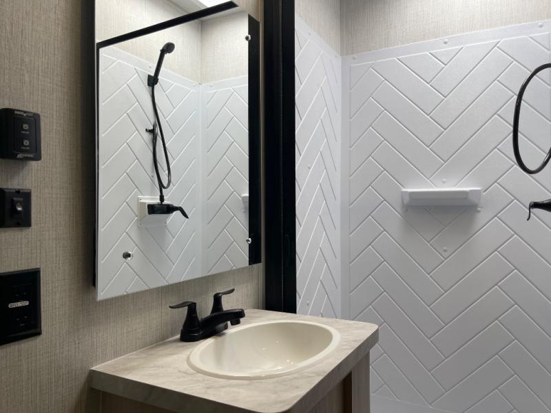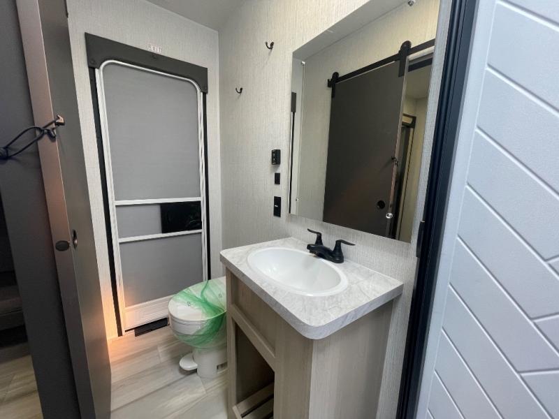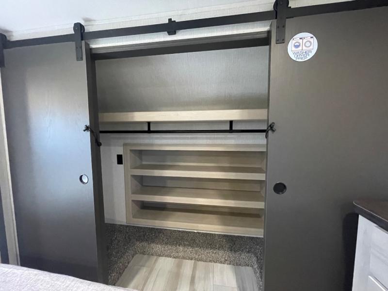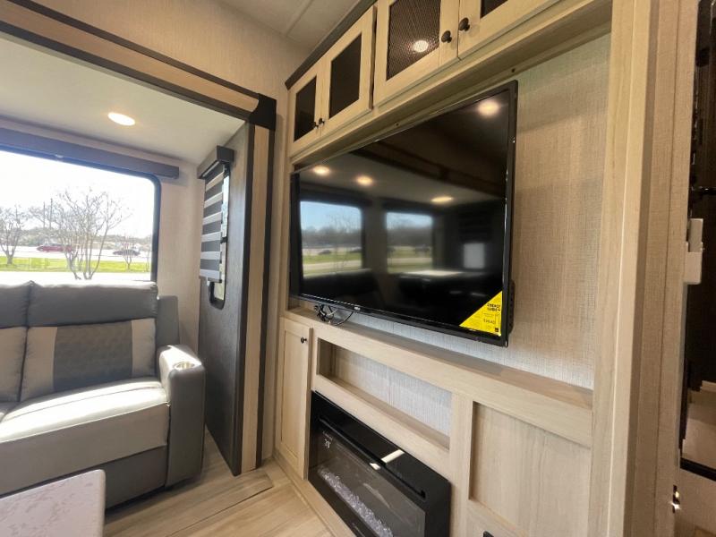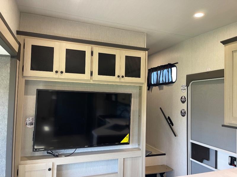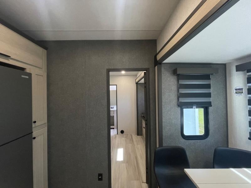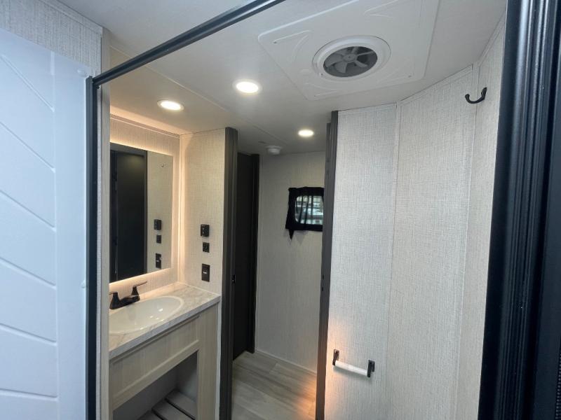 With two full baths, a master bunkhouse/office, and two entry doors, this fifth is a dream! The front bedroom includes a king bed slide out, dresser, and front walk-in wardrobe with washer and dryer prep. And there is a full bath close by for easy access. The rear bunkhouse includes triple bunks, dual opposing slides, a pull-out desktop, and a full rear bath with its own exterior entry door for convenience. In the morning, everyone can meet in the middle kitchen and living room while the chef prepares breakfast with the 21" 2-in-1 oven. There is a hi-top table and chairs for dining, theater seating for relaxing, plus a pantry and 16 cu. ft. 12V refrigerator for food storage.