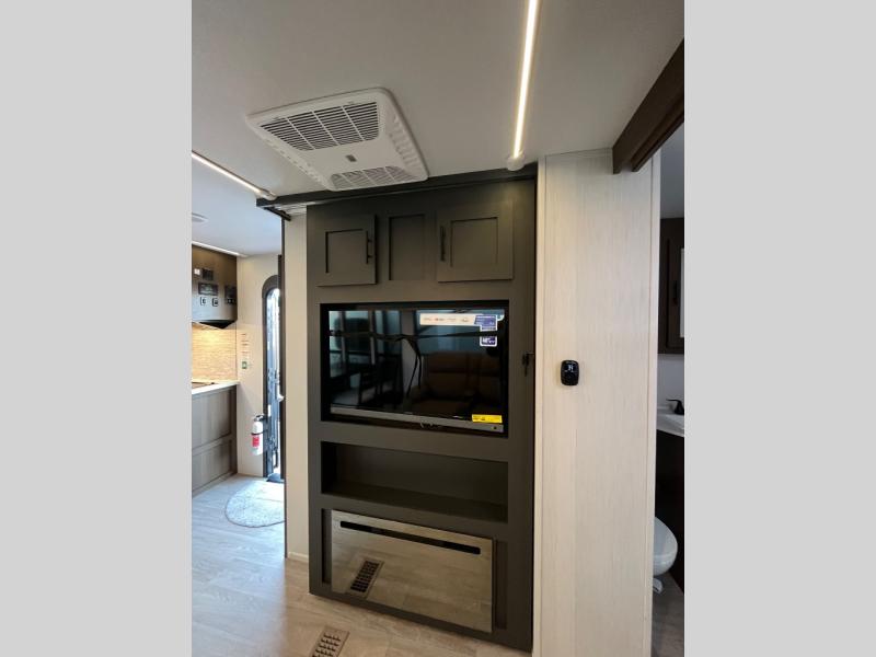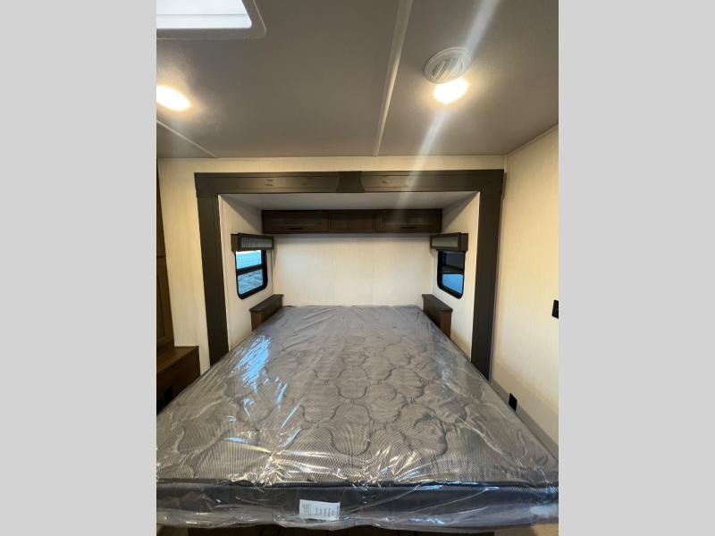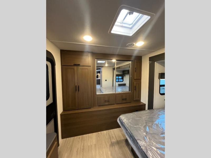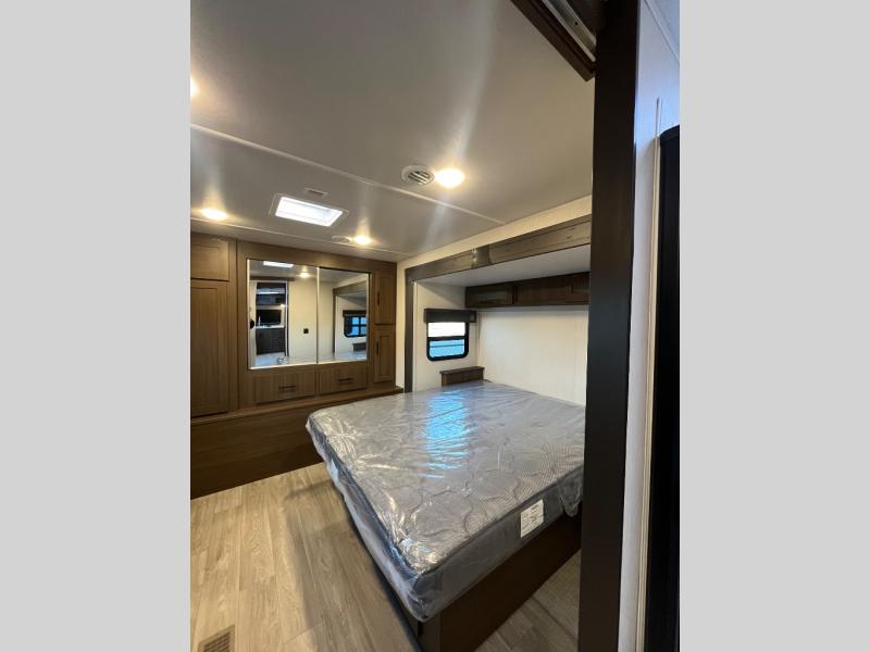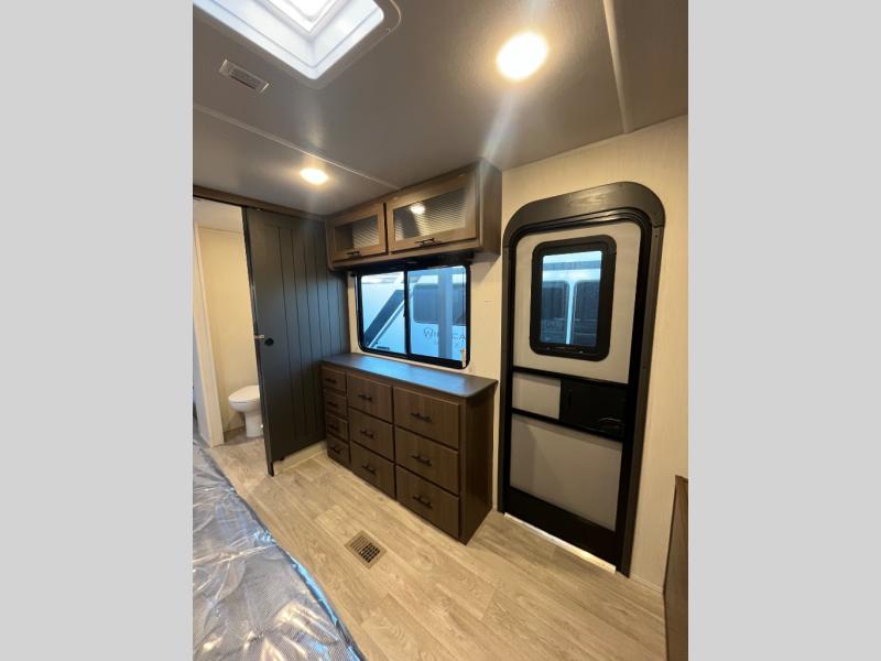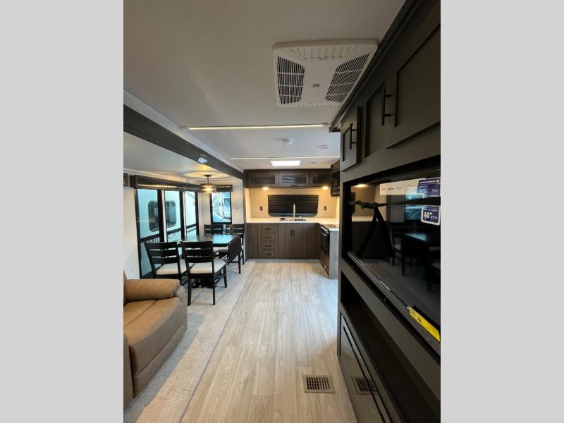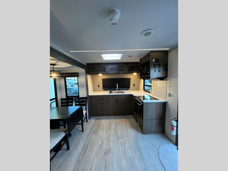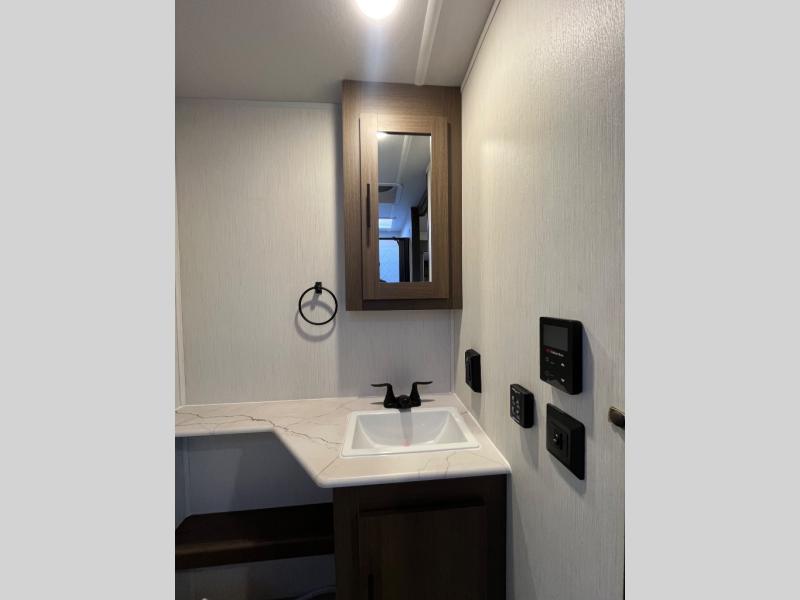 Wherever you decide to camp, you can be sure to have at-home comforts in this double slide out travel trailer. The front kitchen is any chef's dream with its large counter space, 12V refrigerator and a walk-in pantry, and the front windshield will provide great views as you cook. Your crew can relax on the tri-fold hide-a-bed sofa sleeper across from the Smart TV, or play a game at the booth dinette with storage below. The walk-thru bath will create a rear master bedroom you are sure to love. There is a Maxx king bed here, a dresser and a large wardrobe, complete with washer and dryer prep. You'll even find the second entry door in this room for added convenience!