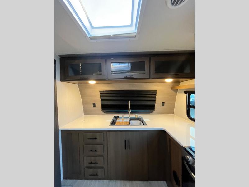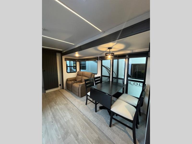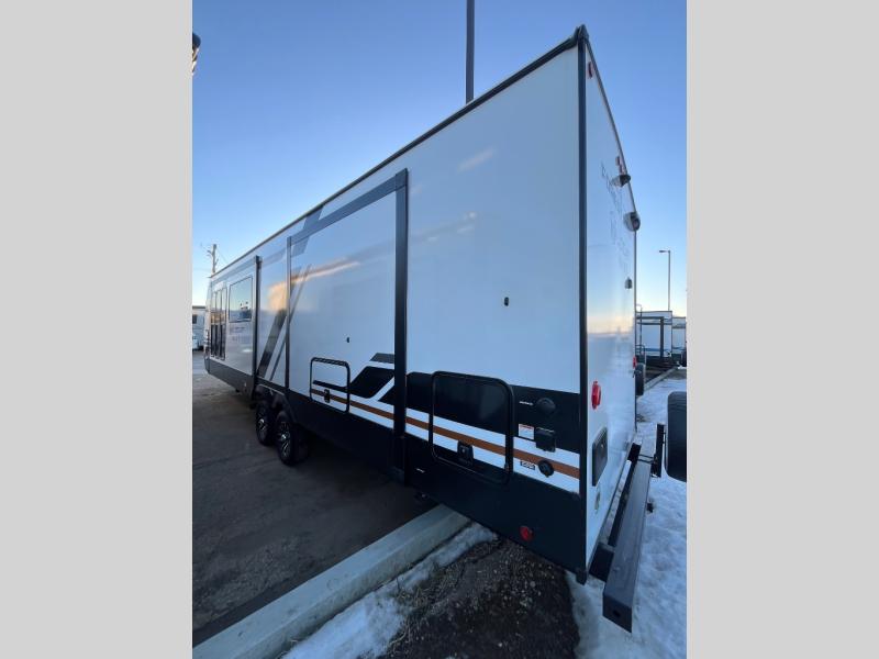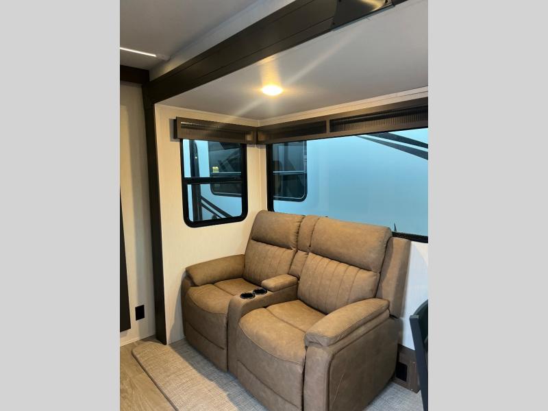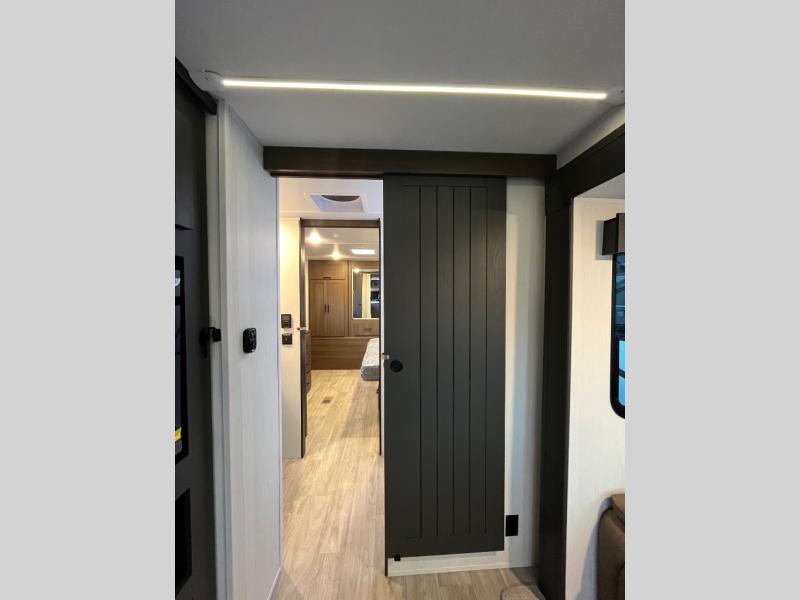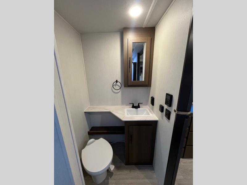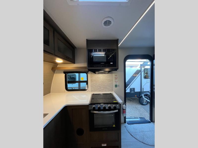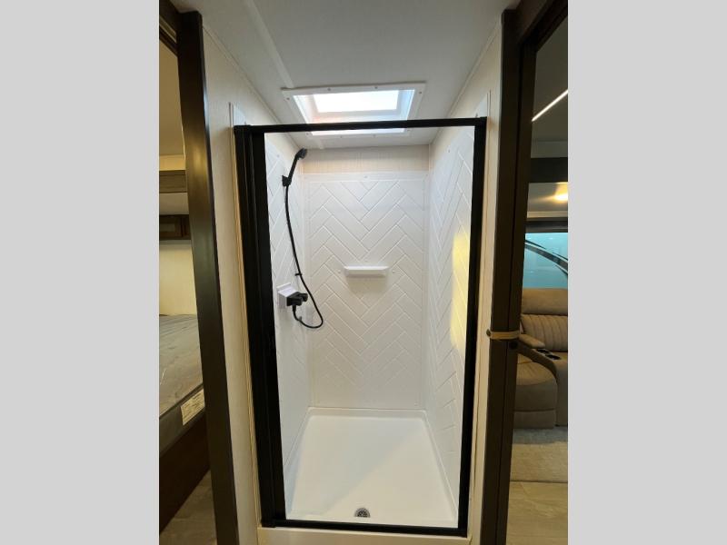 Wherever you decide to camp, you can be sure to have at-home comforts in this double slide out travel trailer. The front kitchen is any chef's dream with its large counter space, 12V refrigerator and a walk-in pantry, and the front windshield will provide great views as you cook. Your crew can relax on the tri-fold hide-a-bed sofa sleeper across from the Smart TV, or play a game at the booth dinette with storage below. The walk-thru bath will create a rear master bedroom you are sure to love. There is a Maxx king bed here, a dresser and a large wardrobe, complete with washer and dryer prep. You'll even find the second entry door in this room for added convenience!