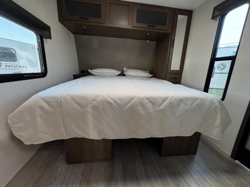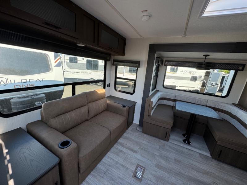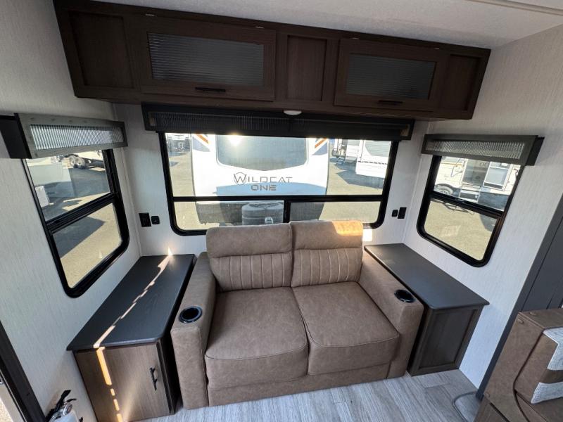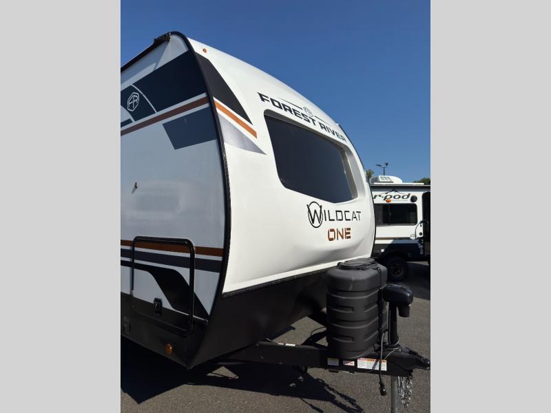 With any Wildcat ONE travel trailer by Forest River in tow, you will find fun and adventure wherever you go! Each model is constructed 2" thick Vacuum-Bonded sidewalls, a Maxx-strength aluminum-framed laminated floor, and double R-7 fiberglass insulation for added protection. These features are included with the Maxx Insulation Package, which also includes slam-latch baggage doors, a fully enclosed underbelly, and more. The Dynamic Technology Package features a 200W expandable roof mounted solar panel with a 30 amp charge controller for off-grid capabilities, backup camera prep, an exterior TV connection, and a frame-mounted receiver hitch to name a few conveniences. A front windshield is found within the Peak Package, along with a power tongue jack, solid surface kitchen countertops, friction hinge entry doors, and an exterior ladder prep.