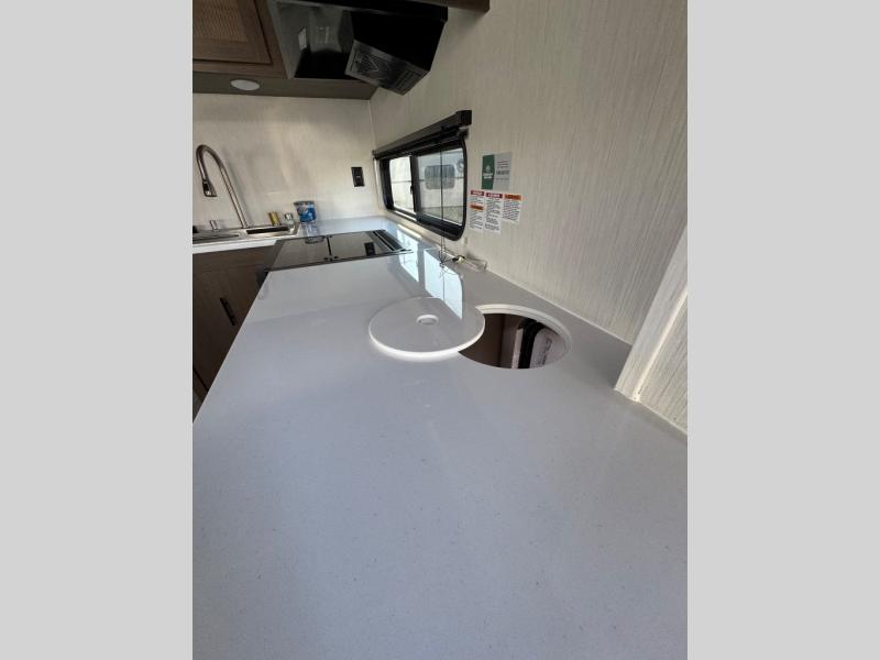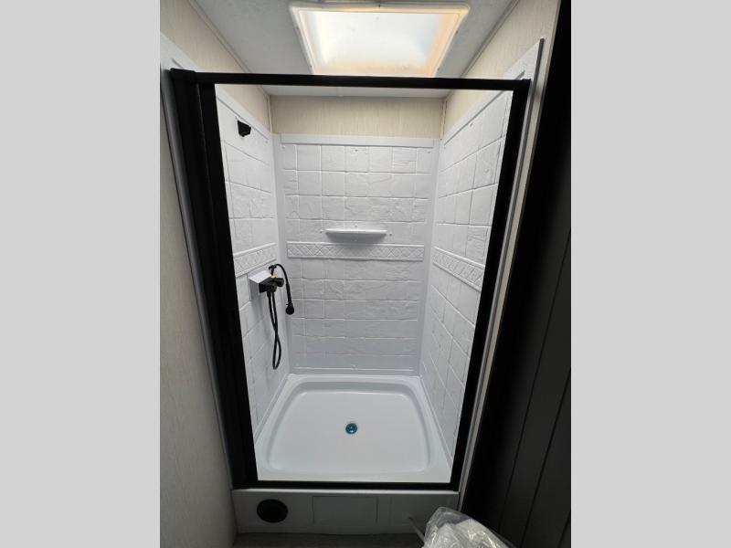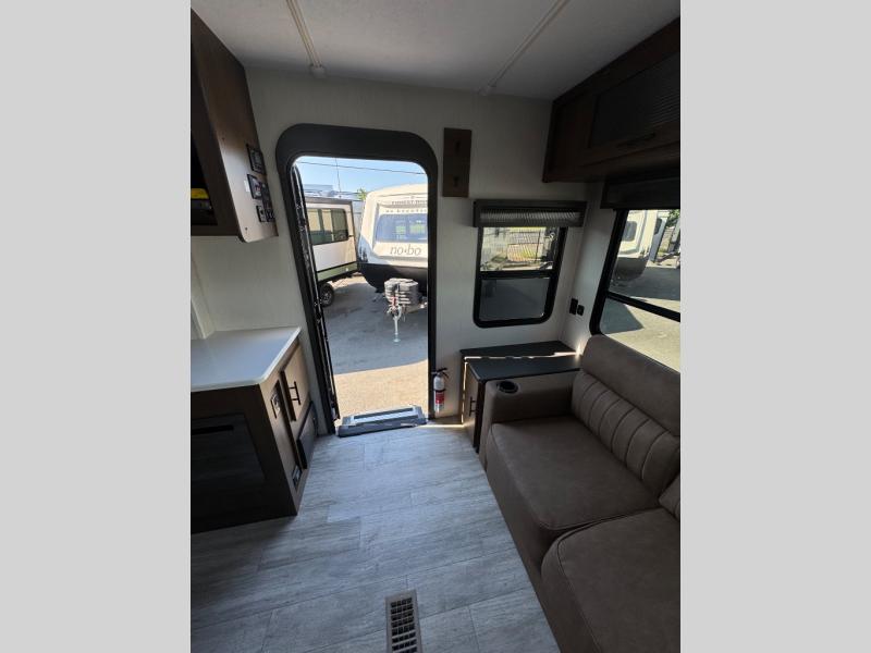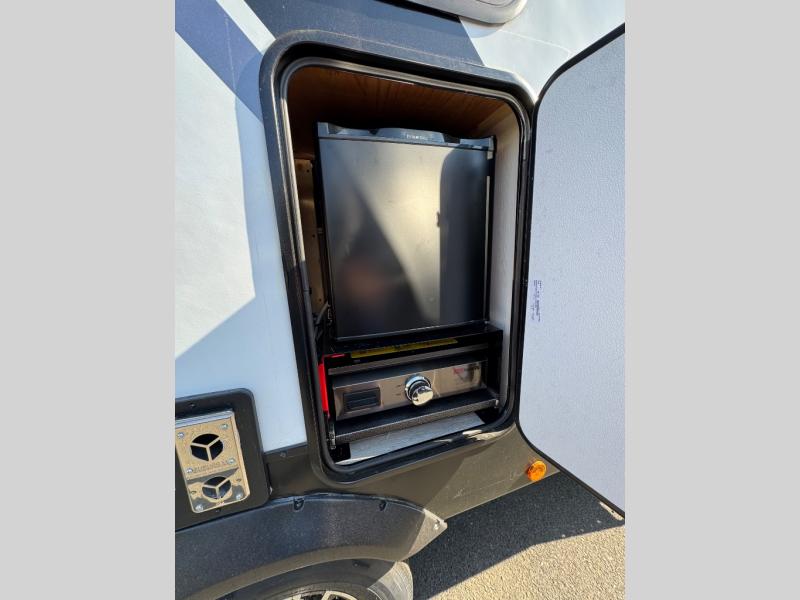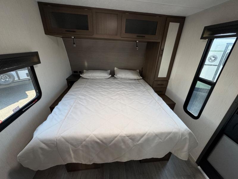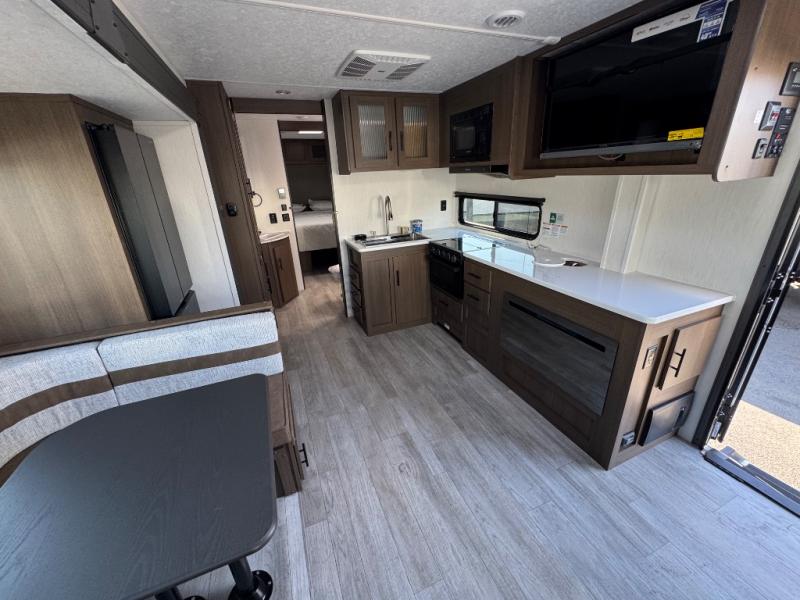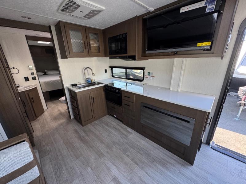 This dual entry travel trailer is perfect for the group of six looking for adventures. The U-shaped dinette slide out will provide more space to relax, and the tri-fold hide-a-bed sofa by the fireplace will give a more at-home feel. You'll appreciate the hutch for storing dishes and more, plus there are multiple storage drawers so nothing gets left behind. This model includes a walk-through bath that will create a front master bedroom you are sure to love. The Maxx king bed includes a nightstand and wardrobe, and you'll enjoy your own exterior entry door if you want to sneak out in the morning to fish. And since there is an indoor kitchen plus an outdoor griddle cooktop, the chef of your group can choose where they want to cook each day!