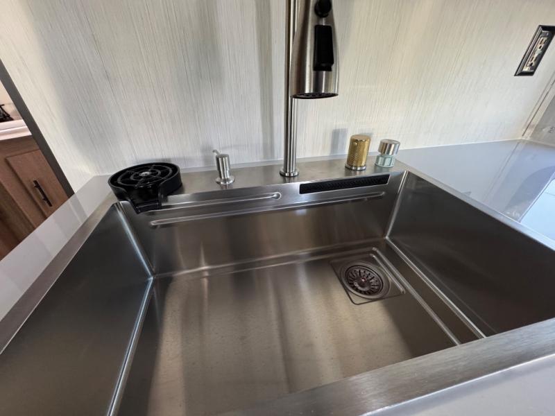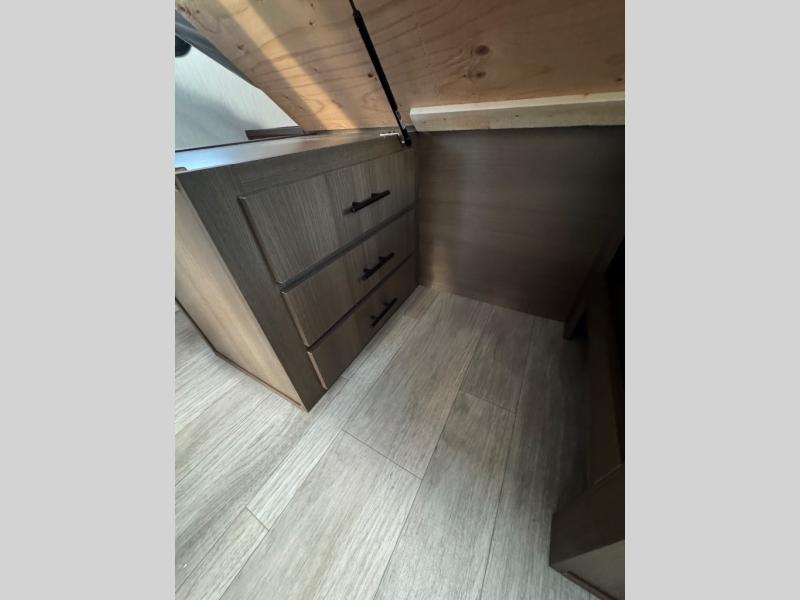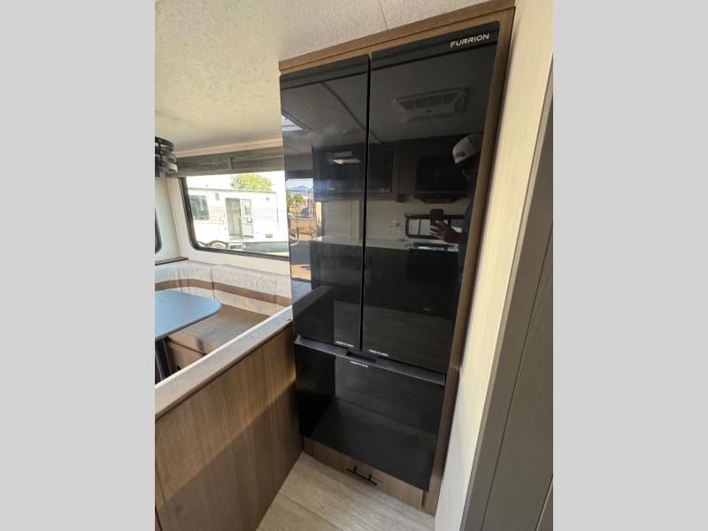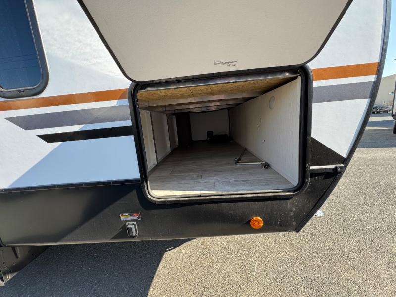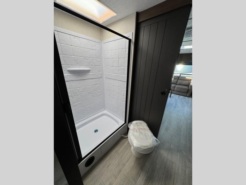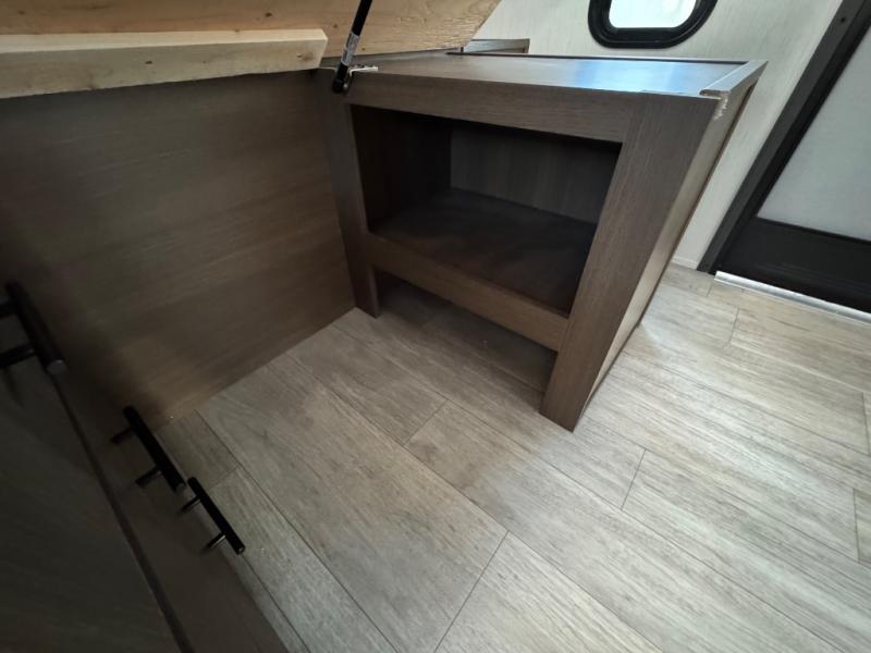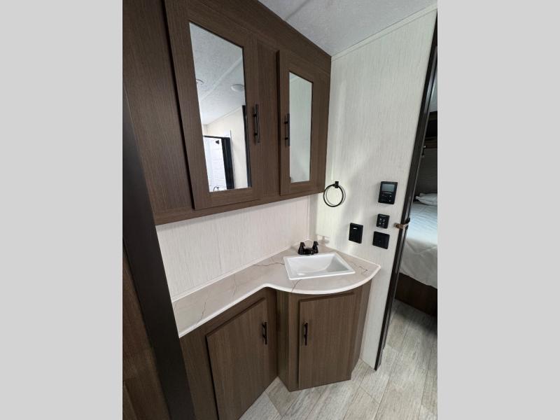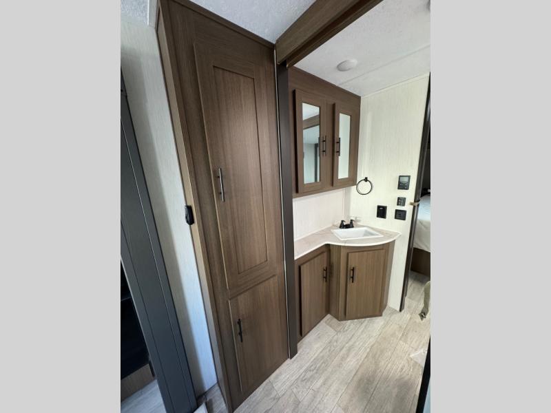 This dual entry travel trailer is perfect for the group of six looking for adventures. The U-shaped dinette slide out will provide more space to relax, and the tri-fold hide-a-bed sofa by the fireplace will give a more at-home feel. You'll appreciate the hutch for storing dishes and more, plus there are multiple storage drawers so nothing gets left behind. This model includes a walk-through bath that will create a front master bedroom you are sure to love. The Maxx king bed includes a nightstand and wardrobe, and you'll enjoy your own exterior entry door if you want to sneak out in the morning to fish. And since there is an indoor kitchen plus an outdoor griddle cooktop, the chef of your group can choose where they want to cook each day!