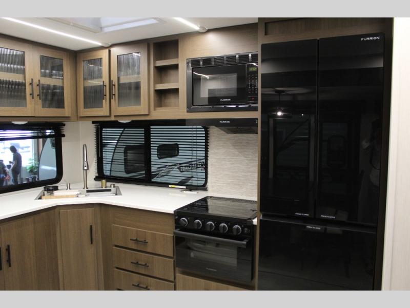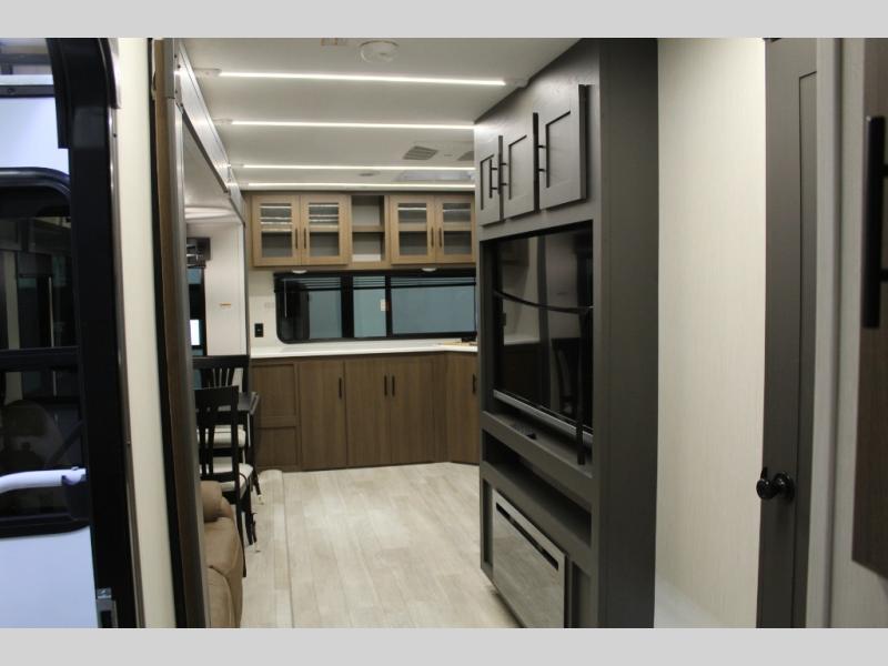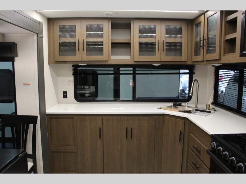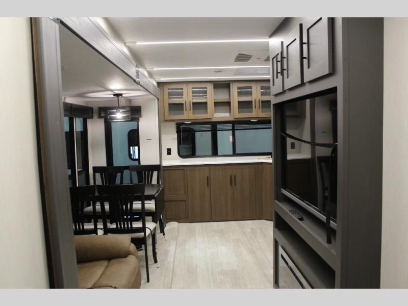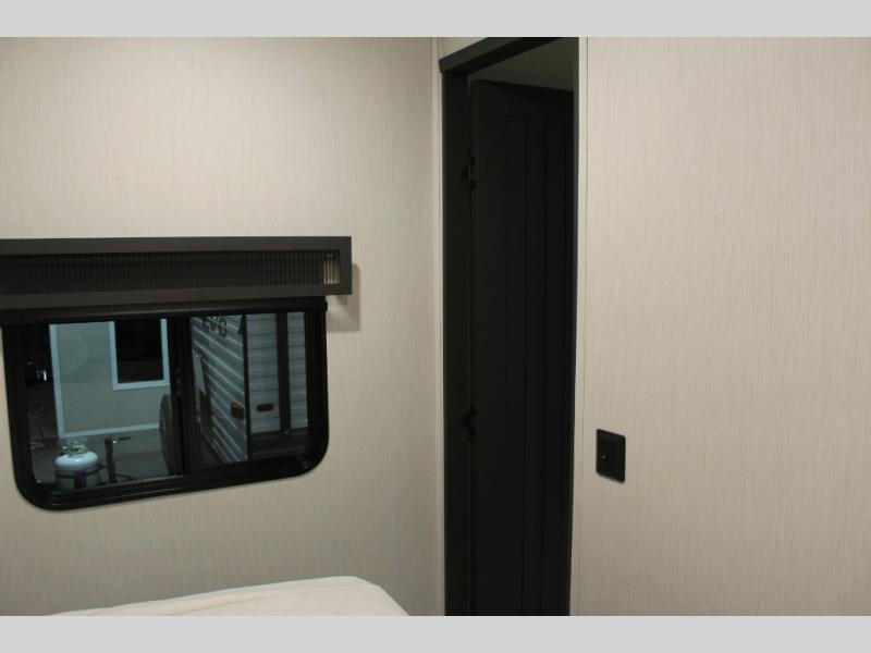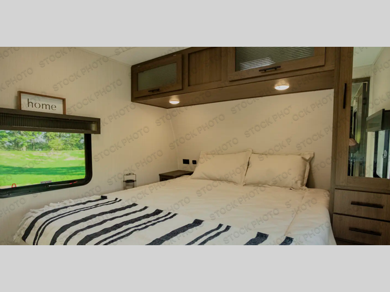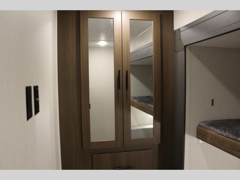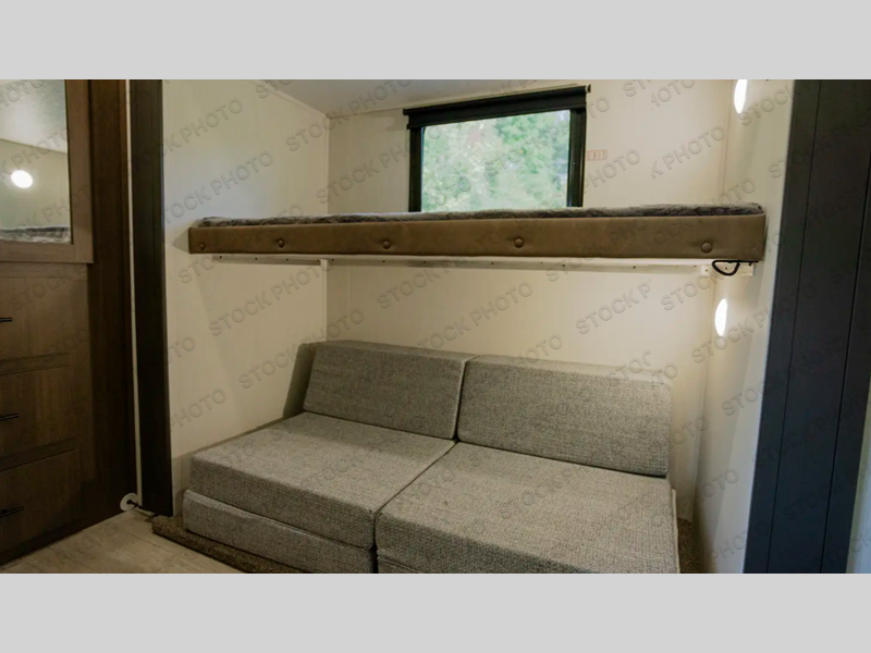 If you enjoy camping with friends and family, but still want your own space at night, this travel trailer is perfect for you! The front private bedroom includes a Maxx king bed, a bedside wardrobe, plus a second wardrobe with two drawers below. Your guest can take the mid-bunkroom that includes Cat-Nap sleepers which is a bunk with fold out mats underneath. There is also a wardrobe with three drawers and a slide out to make this room more spacious. Just outside the bunkroom is the tri-fold hide-a-bed sofa and booth dinette that are in direct view of the smart TV and fireplace. You will also fall in love with the rear kitchen that includes a skylight, plenty of counter space, a large single bowl stainless steel sink, and a 12V refrigerator!