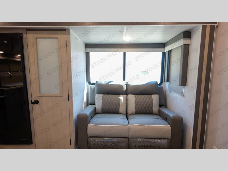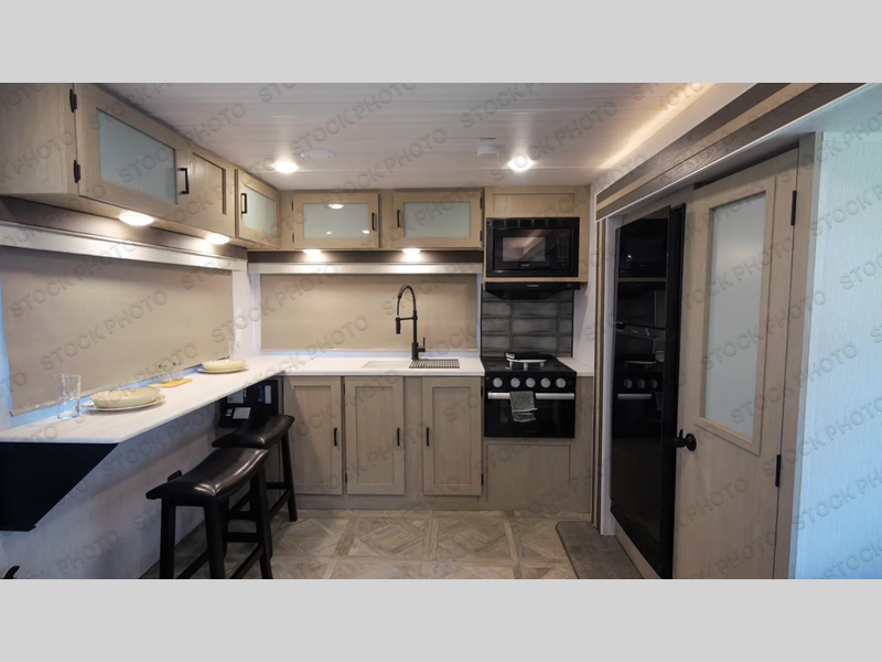 You're going to love cooking in the rear kitchen of this travel trailer! It has everything you need to prepare delicious home cooked meals including a large pantry and oversized fridge, plus there are two bar stools to sit on while you enjoy them. The theater seating is conveniently across from the swiveling entertainment center which has hidden shelves behind it for your games and movies. As you walk-through the bathroom, you will notice a walk-in shower to the left and a toilet and sink to the right. It leads directly into the front private bedroom which has a Versa-Tilt custom king bed to lay your head on at night and wardrobes/nightstands on either side for your items!