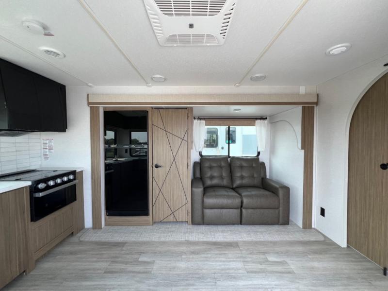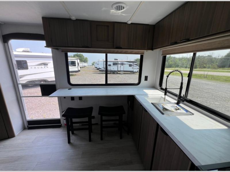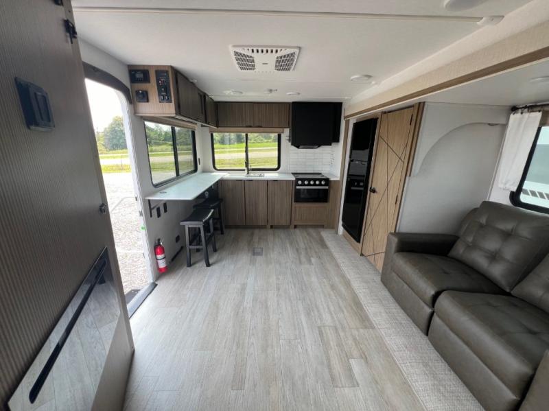 You're going to love cooking in the rear kitchen of this travel trailer! It has everything you need to prepare delicious home cooked meals including a large pantry and oversized fridge, plus there are two bar stools to sit on while you enjoy them. The theater seating is conveniently across from the swiveling entertainment center which has hidden shelves behind it for your games and movies. As you walk-through the bathroom, you will notice a walk-in shower to the left and a toilet and sink to the right. It leads directly into the front private bedroom which has a Versa-Tilt custom king bed to lay your head on at night and wardrobes/nightstands on either side for your items!