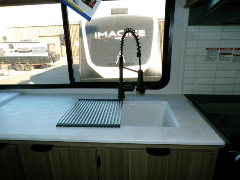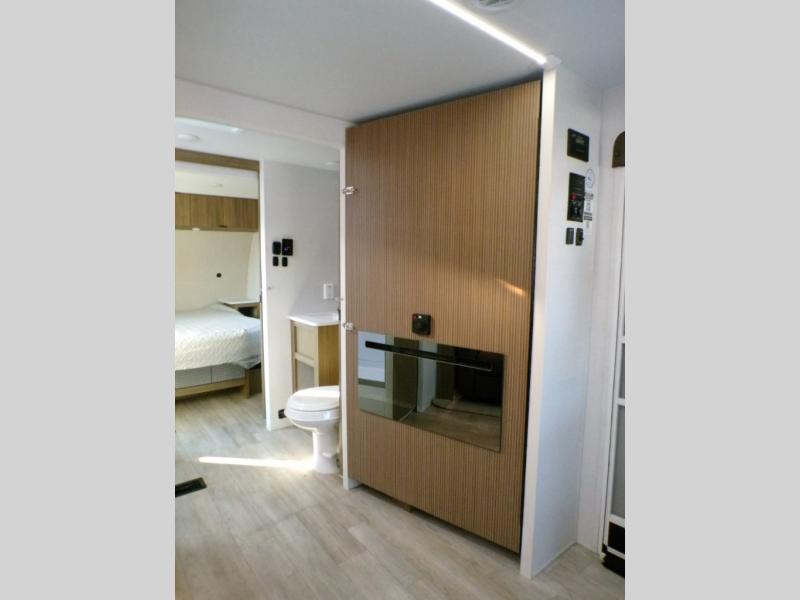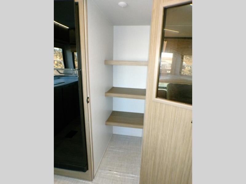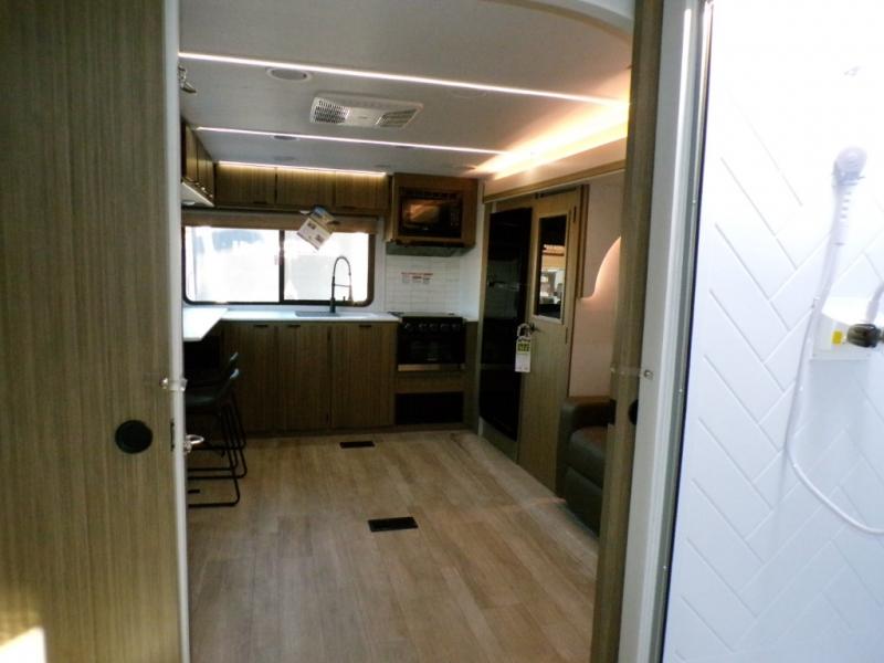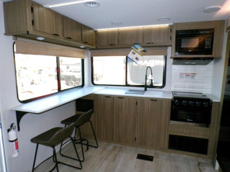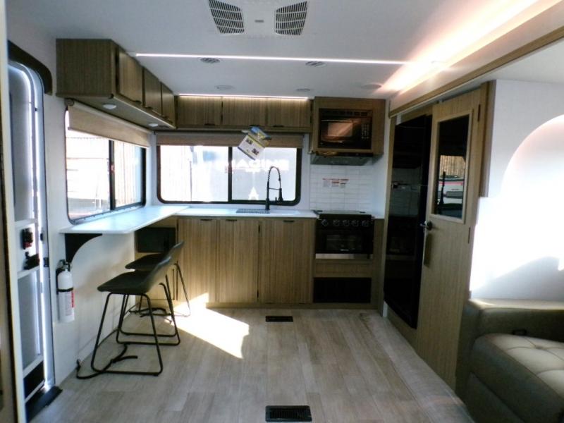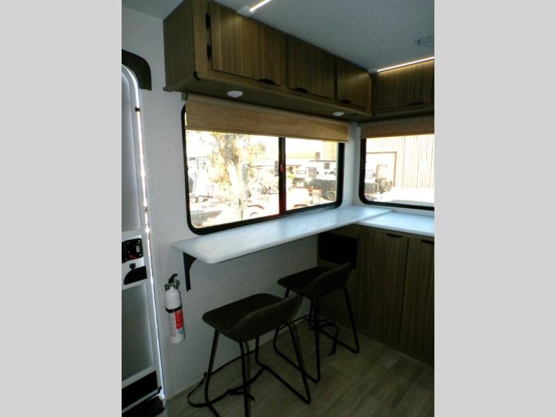 - Rear Kitchen: The thoughtfully designed rear kitchen is fully equipped for cooking, with a spacious pantry and oversized refrigerator. It’s the perfect setup for preparing and enjoying meals on the go, with two bar stools that add a comfortable dining space.