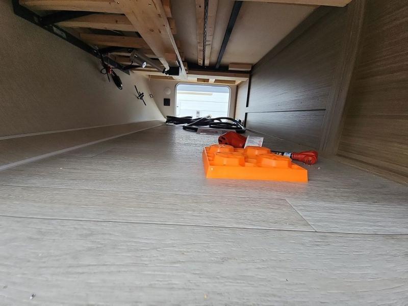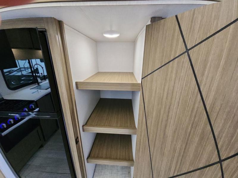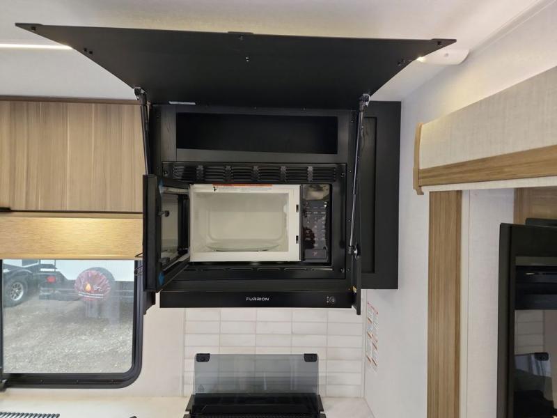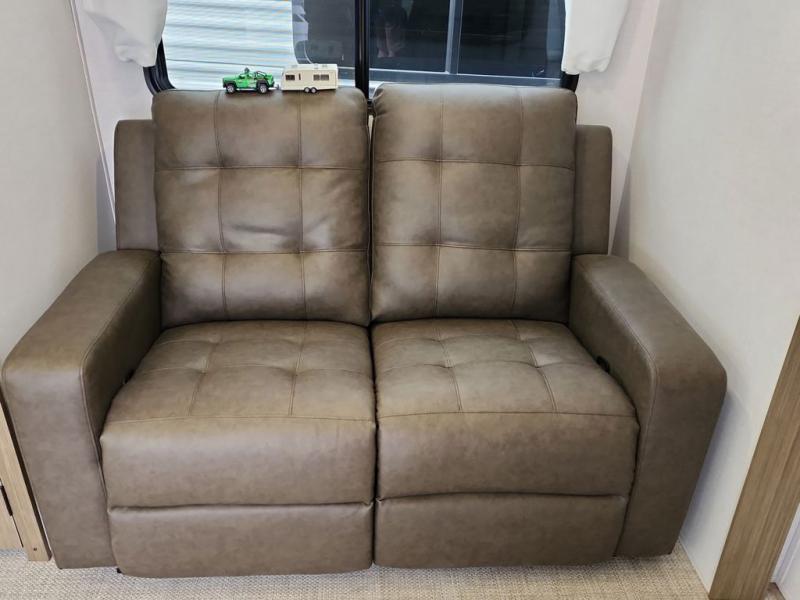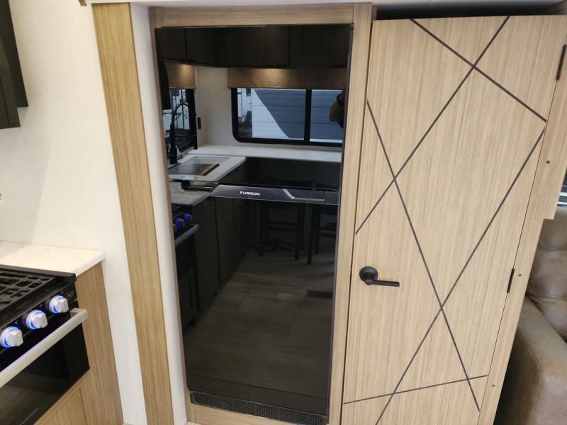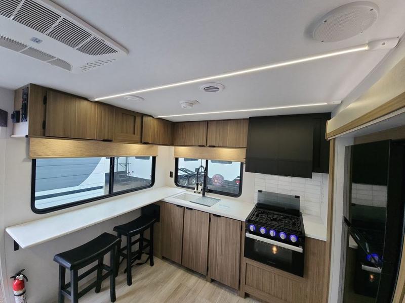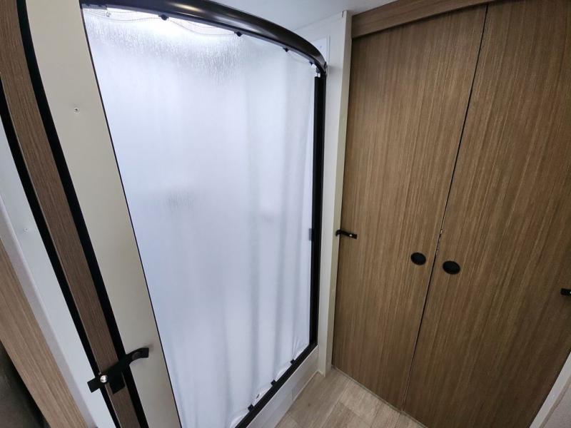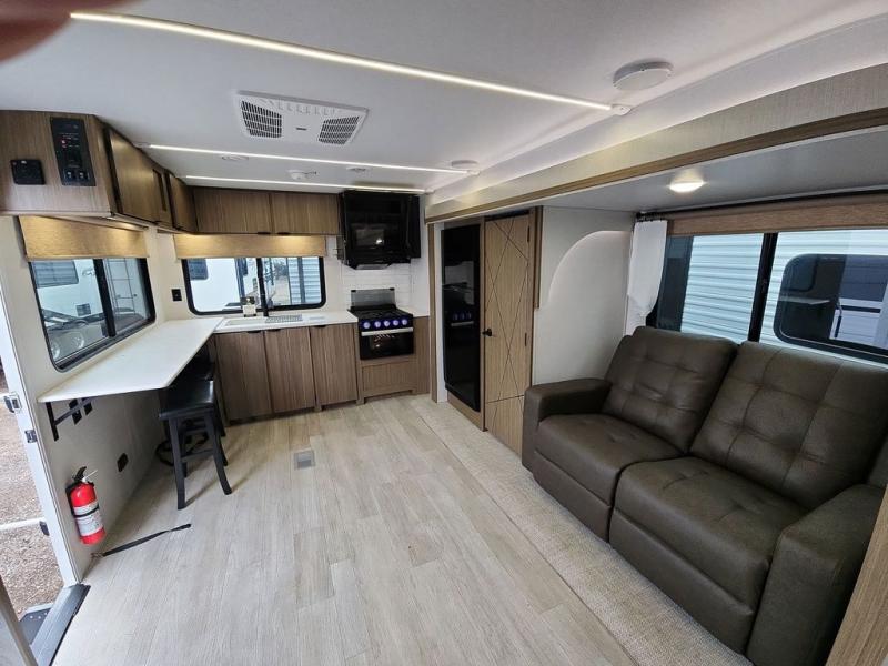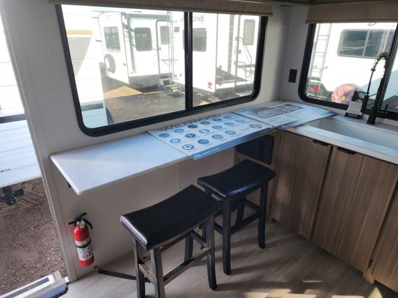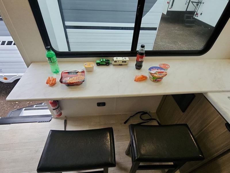 You're going to love cooking in the rear kitchen of this travel trailer! It has everything you need to prepare delicious home cooked meals including a large pantry and oversized fridge, plus there are two bar stools to sit on while you enjoy them. The theater seating is conveniently across from the swiveling entertainment center which has hidden shelves behind it for your games and movies. As you walk through the bathroom, you will notice a walk-in shower to the left and a toilet and sink to the right. It leads directly into the front private bedroom which has a Versa-Tilt custom king bed to lay your head on at night and wardrobes/nightstands on either side for your items!