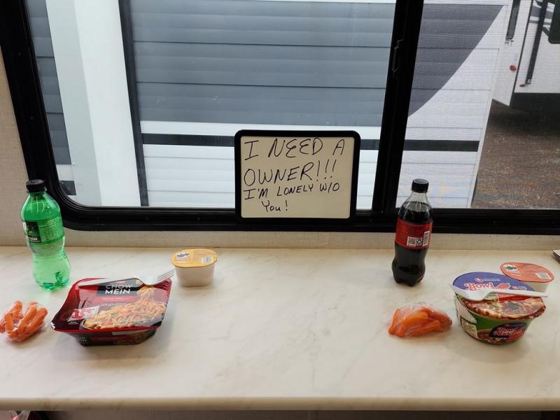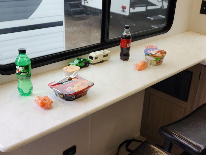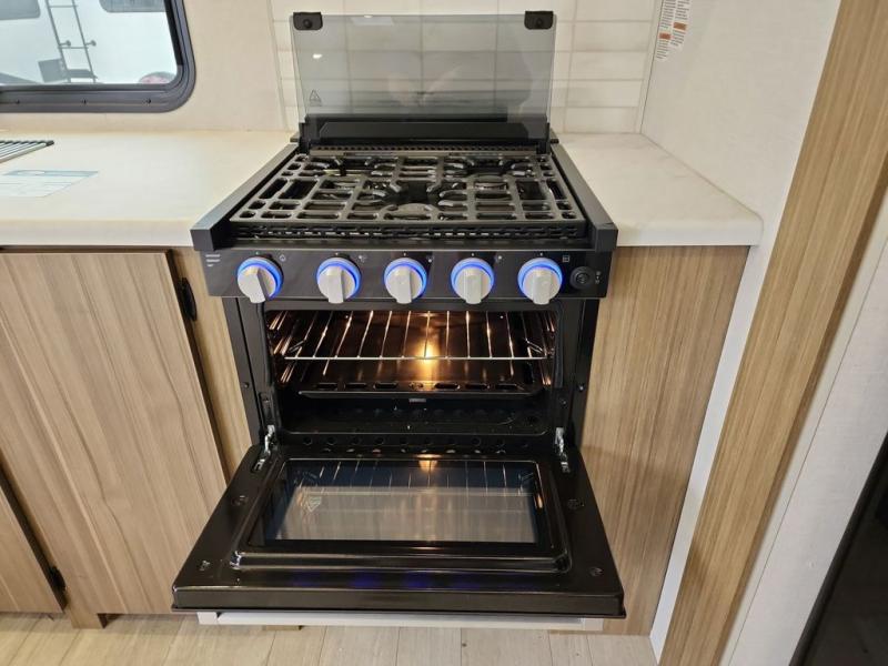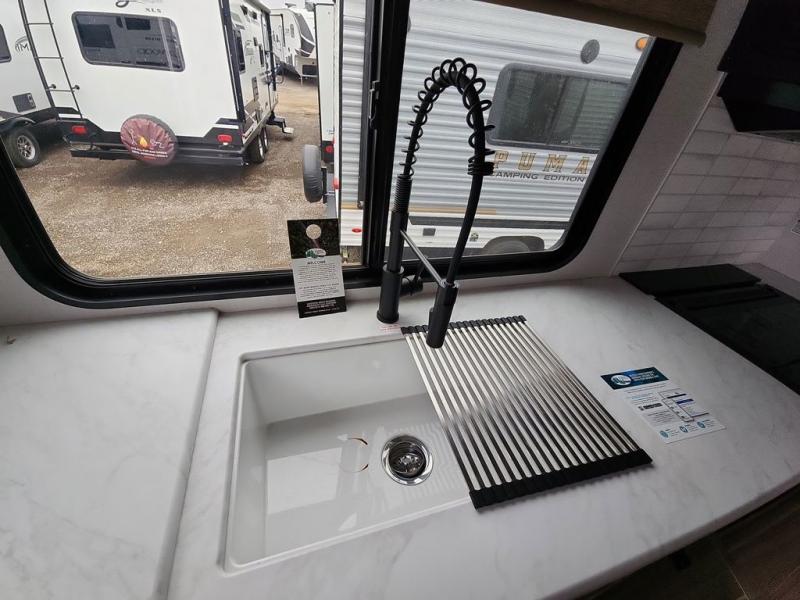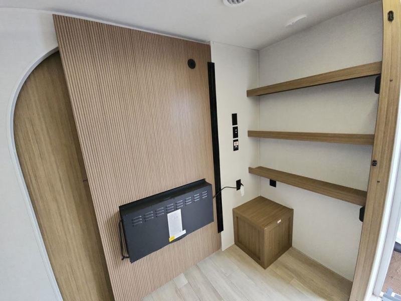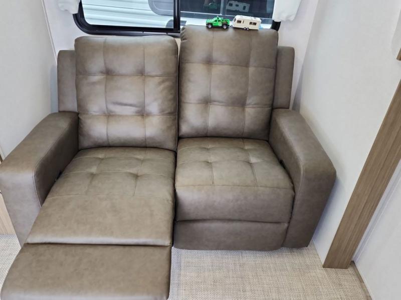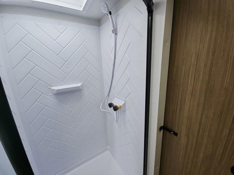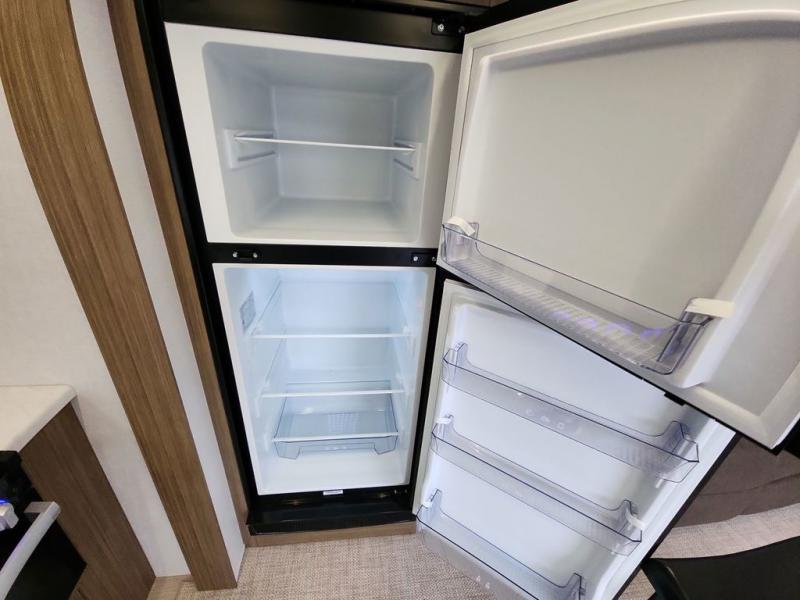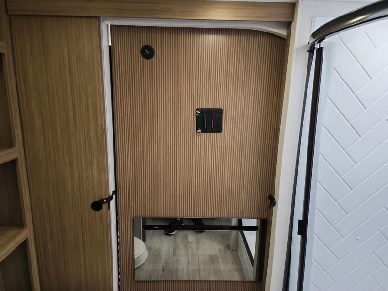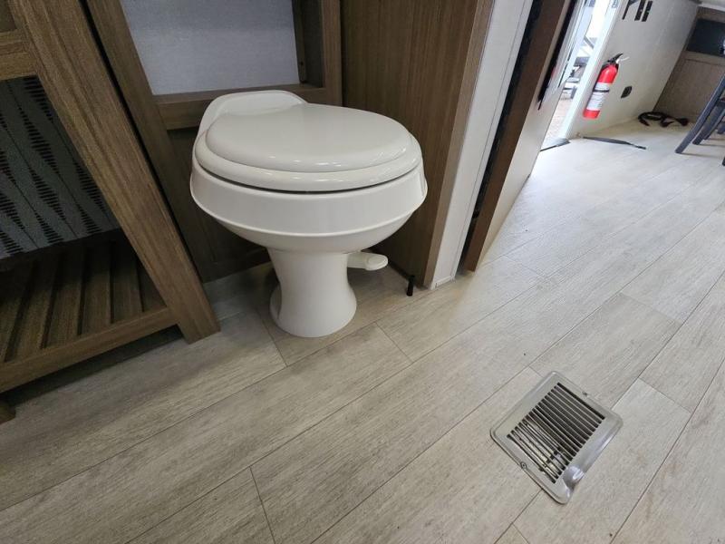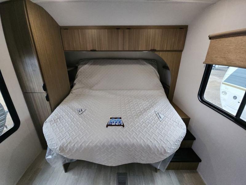 You're going to love cooking in the rear kitchen of this travel trailer! It has everything you need to prepare delicious home cooked meals including a large pantry and oversized fridge, plus there are two bar stools to sit on while you enjoy them. The theater seating is conveniently across from the swiveling entertainment center which has hidden shelves behind it for your games and movies. As you walk through the bathroom, you will notice a walk-in shower to the left and a toilet and sink to the right. It leads directly into the front private bedroom which has a Versa-Tilt custom king bed to lay your head on at night and wardrobes/nightstands on either side for your items!