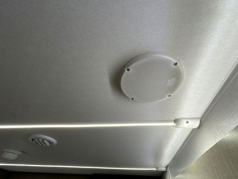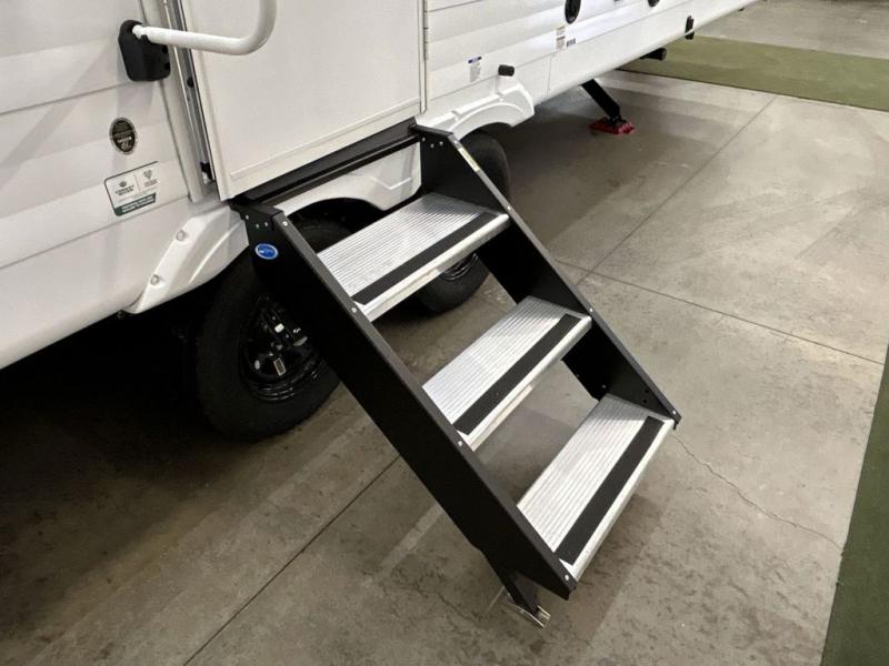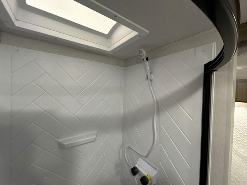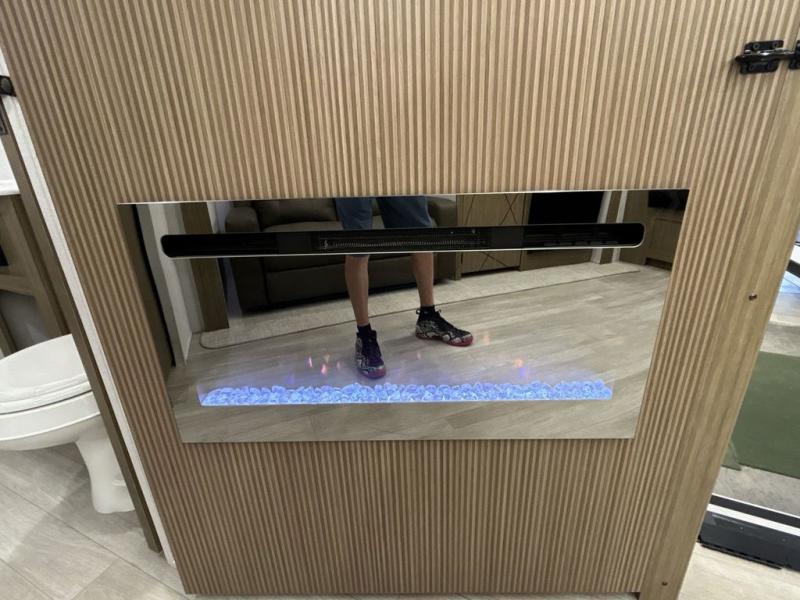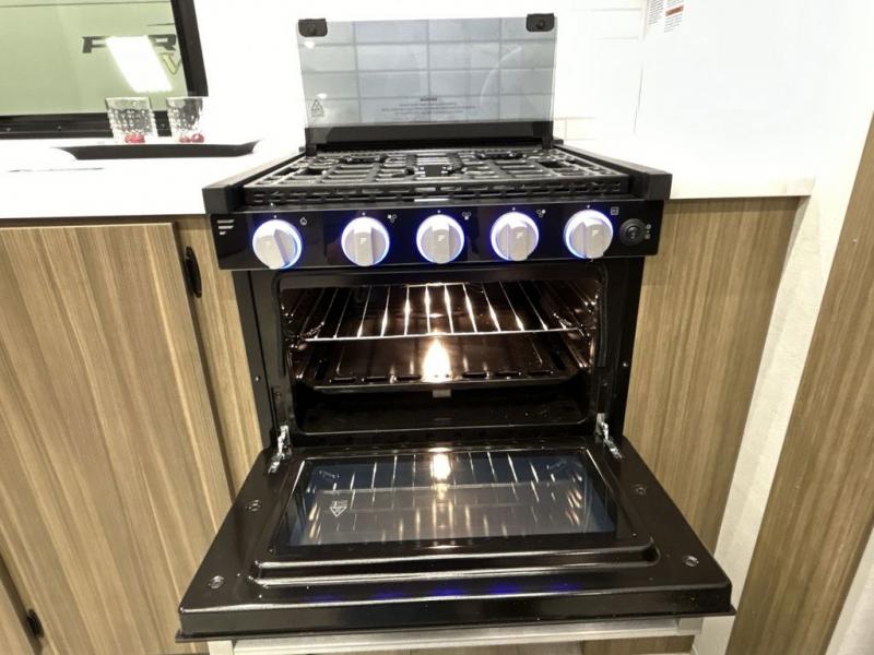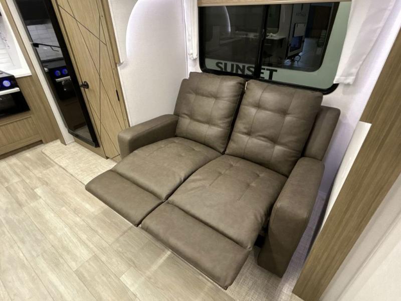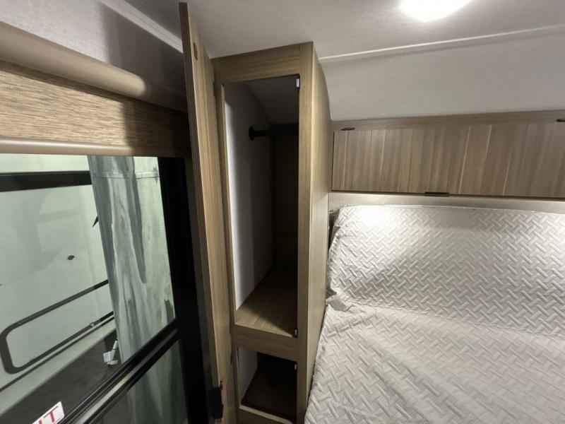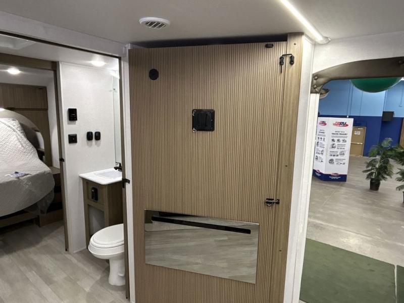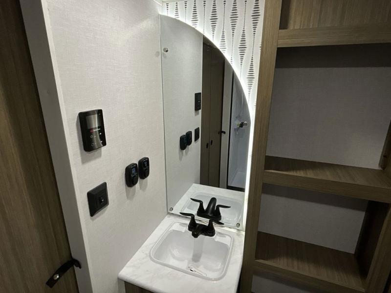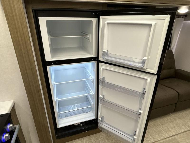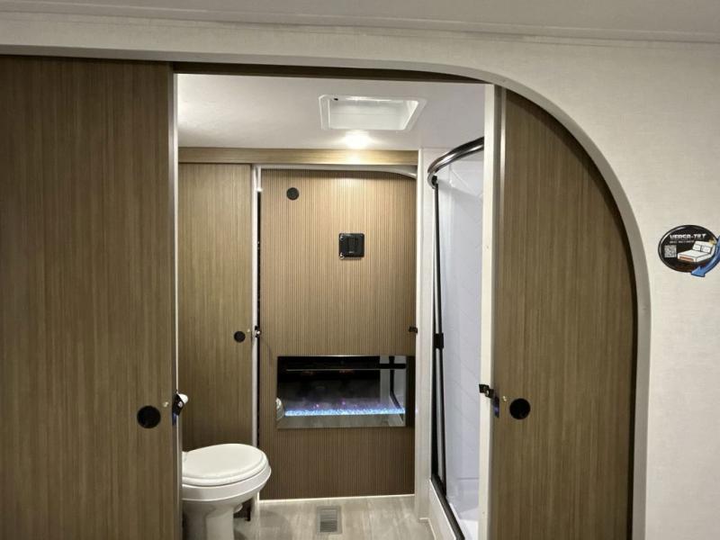 You're going to love cooking in the rear kitchen of this travel trailer! It has everything you need to prepare delicious home cooked meals including a large pantry and oversized fridge, plus there are two bar stools to sit on while you enjoy them. The theater seating is conveniently across from the swiveling entertainment center which has hidden shelves behind it for your games and movies. As you walk through the bathroom, you will notice a walk-in shower to the left and a toilet and sink to the right. It leads directly into the front private bedroom which has a Versa-Tilt custom king bed to lay your head on at night and wardrobes/nightstands on either side for your items!