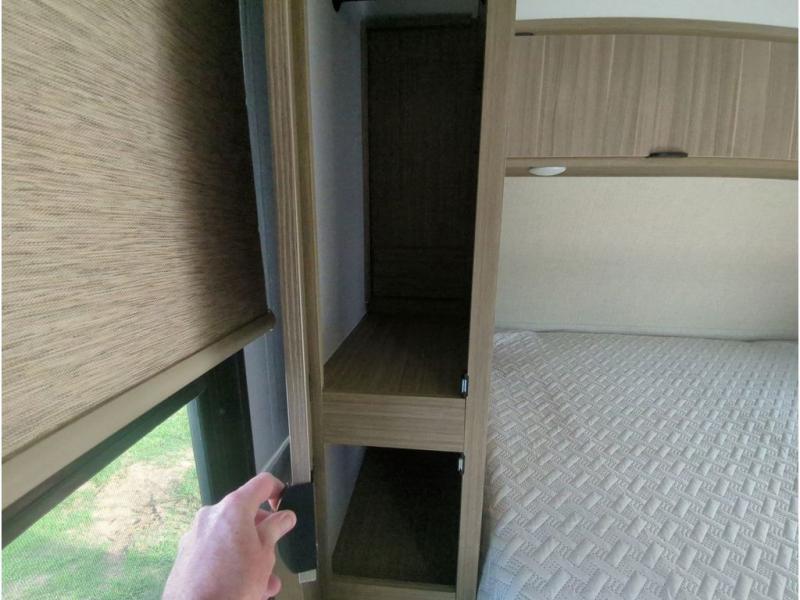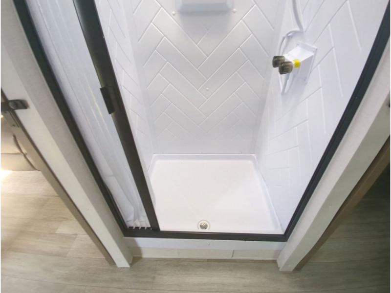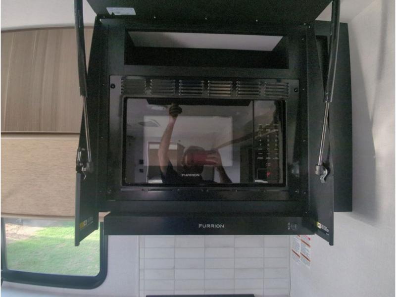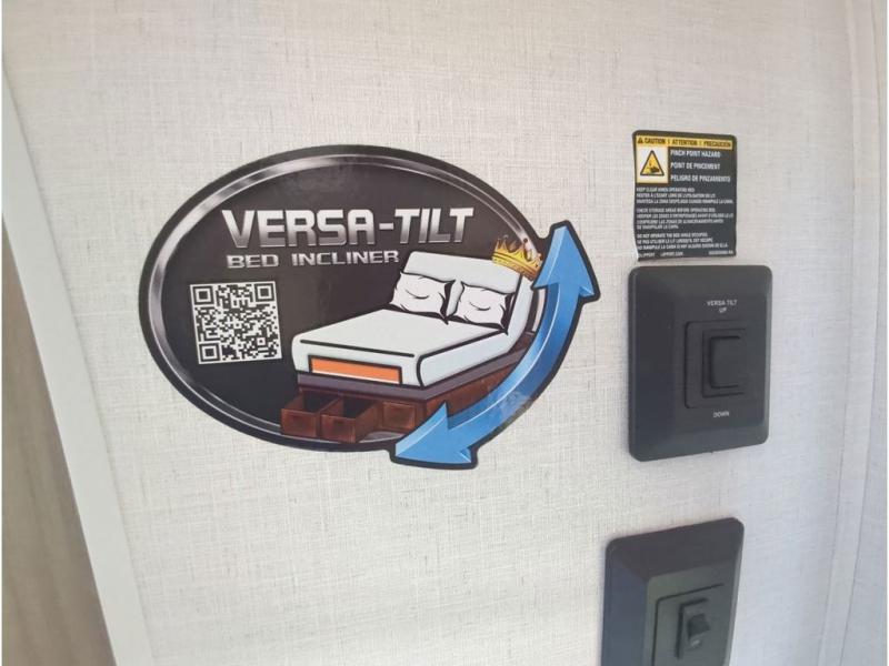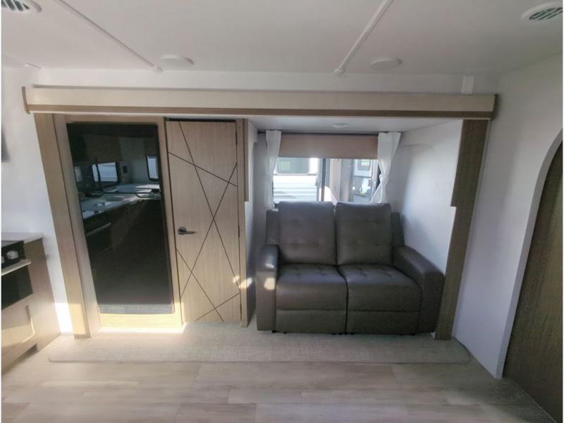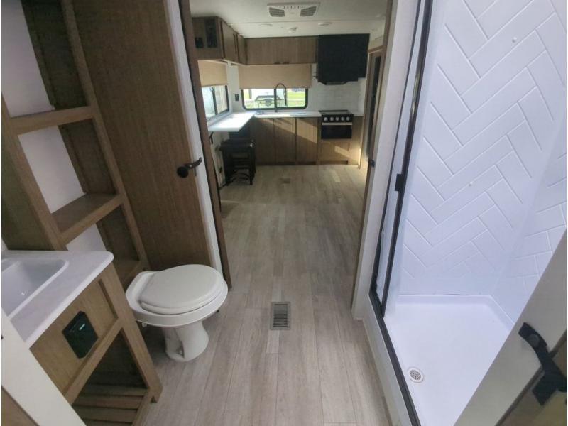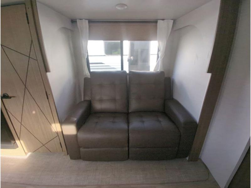 You're going to love cooking in the rear kitchen of this travel trailer! It has everything you need to prepare delicious home cooked meals including a large pantry and oversized fridge, plus there are two bar stools to sit on while you enjoy them. The theater seating is conveniently across from the swiveling entertainment center which has hidden shelves behind it for your games and movies. As you walk through the bathroom, you will notice a walk-in shower to the left and a toilet and sink to the right. It leads directly into the front private bedroom which has a Versa-Tilt custom king bed to lay your head on at night and wardrobes/nightstands on either side for your items!