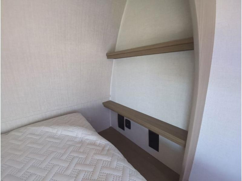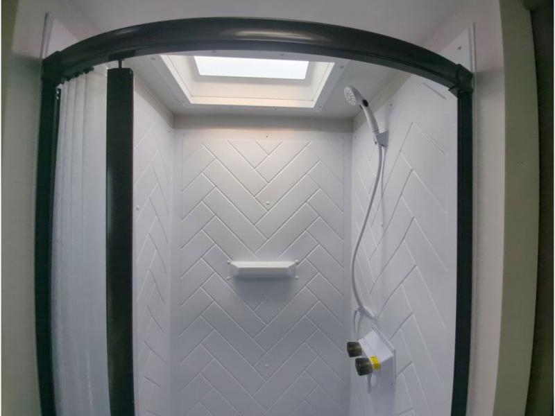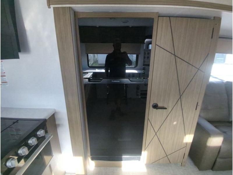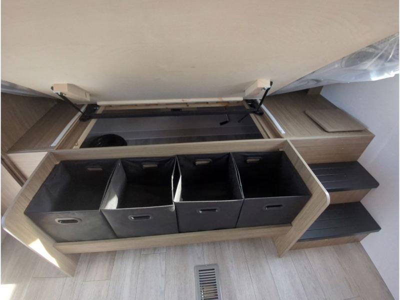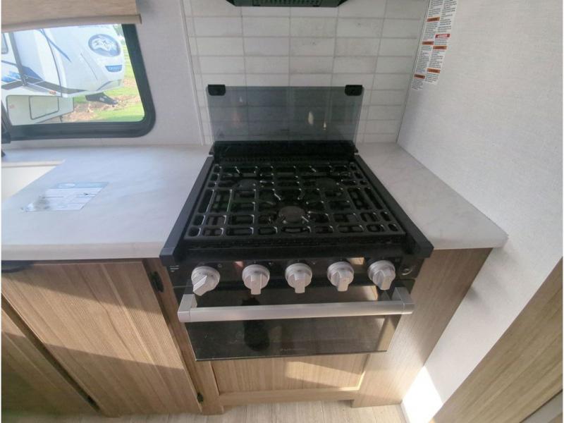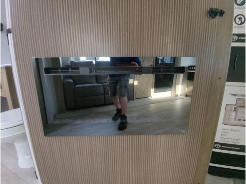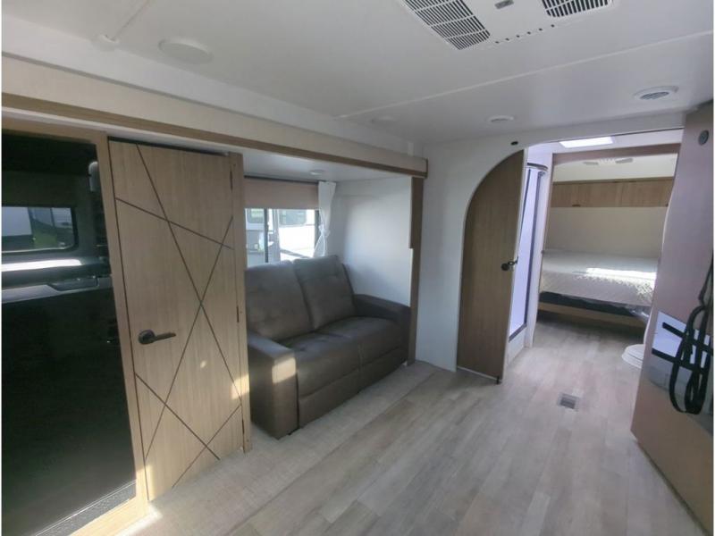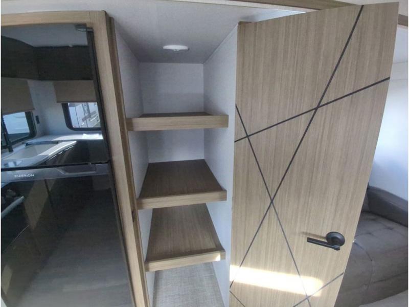 You're going to love cooking in the rear kitchen of this travel trailer! It has everything you need to prepare delicious home cooked meals including a large pantry and oversized fridge, plus there are two bar stools to sit on while you enjoy them. The theater seating is conveniently across from the swiveling entertainment center which has hidden shelves behind it for your games and movies. As you walk through the bathroom, you will notice a walk-in shower to the left and a toilet and sink to the right. It leads directly into the front private bedroom which has a Versa-Tilt custom king bed to lay your head on at night and wardrobes/nightstands on either side for your items!