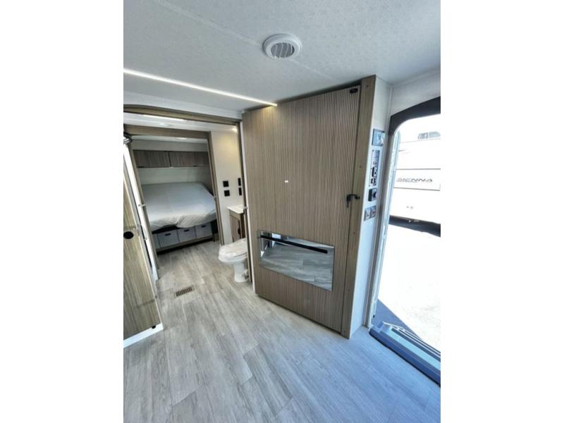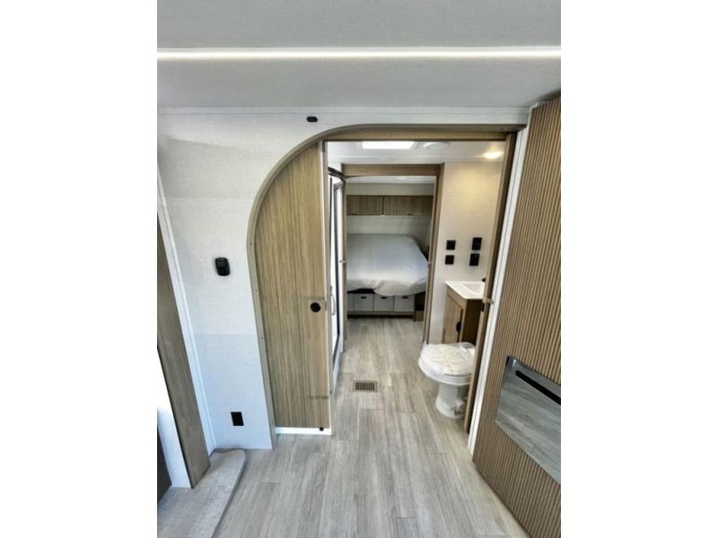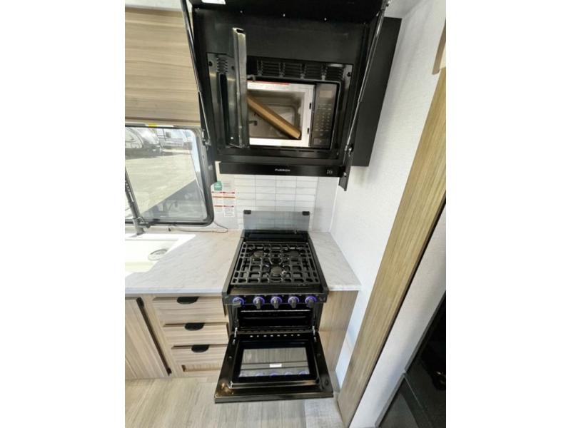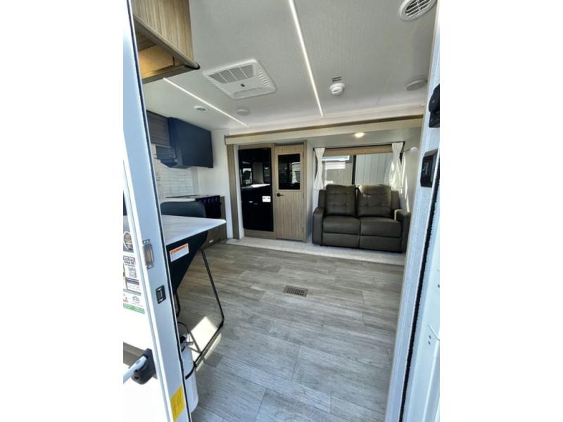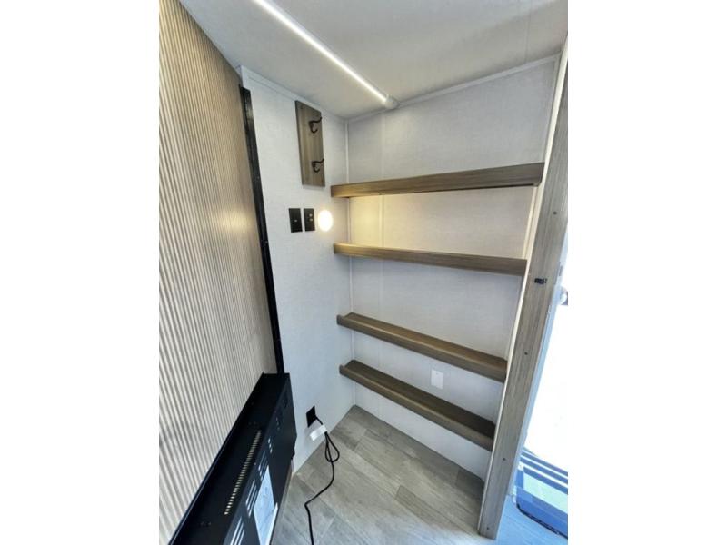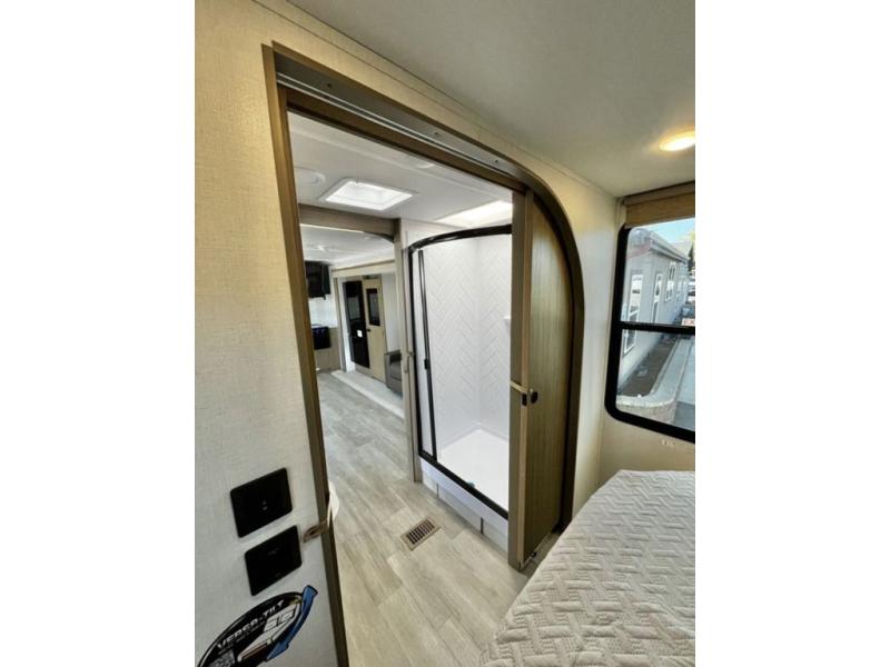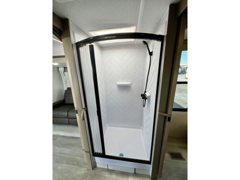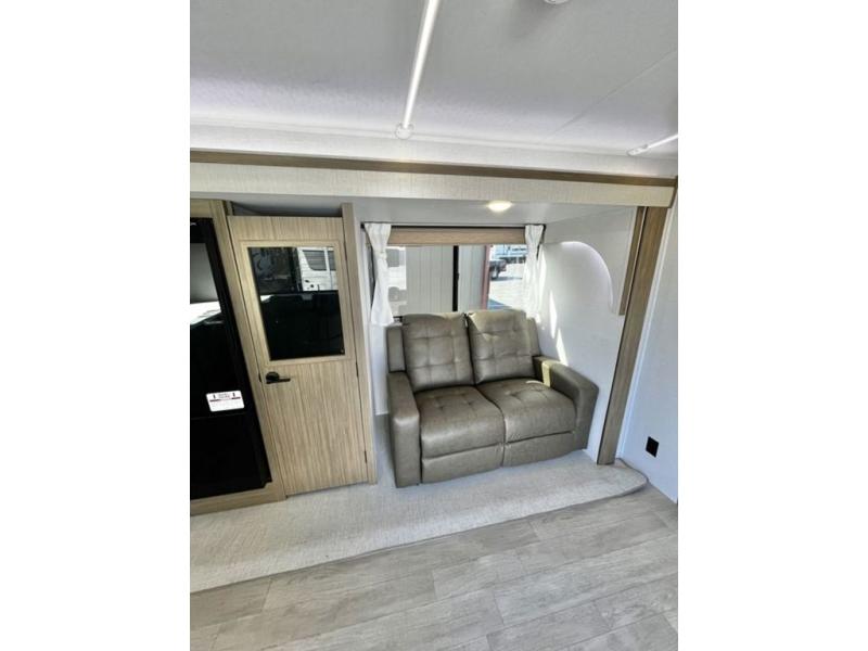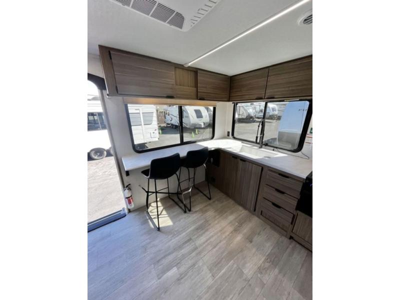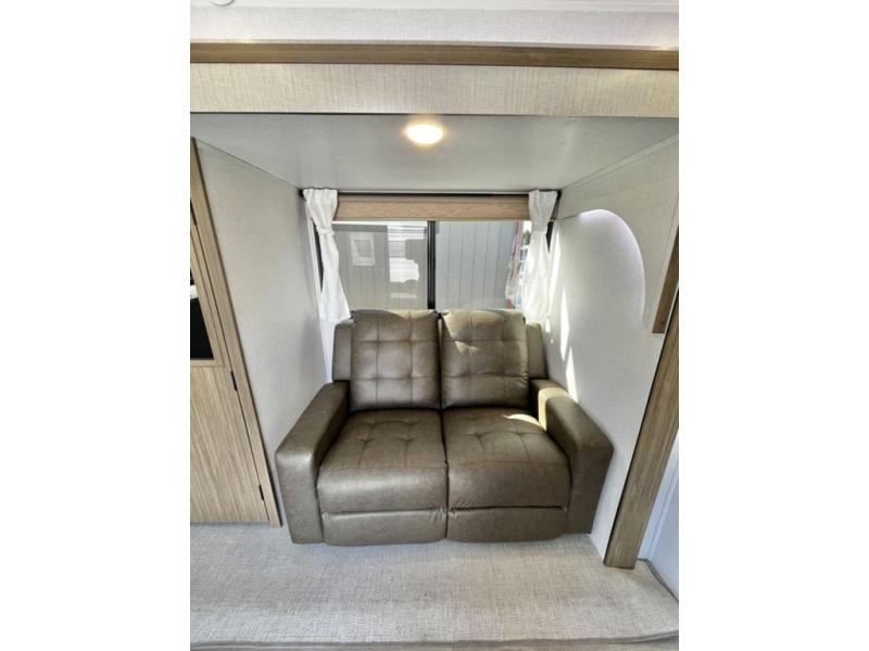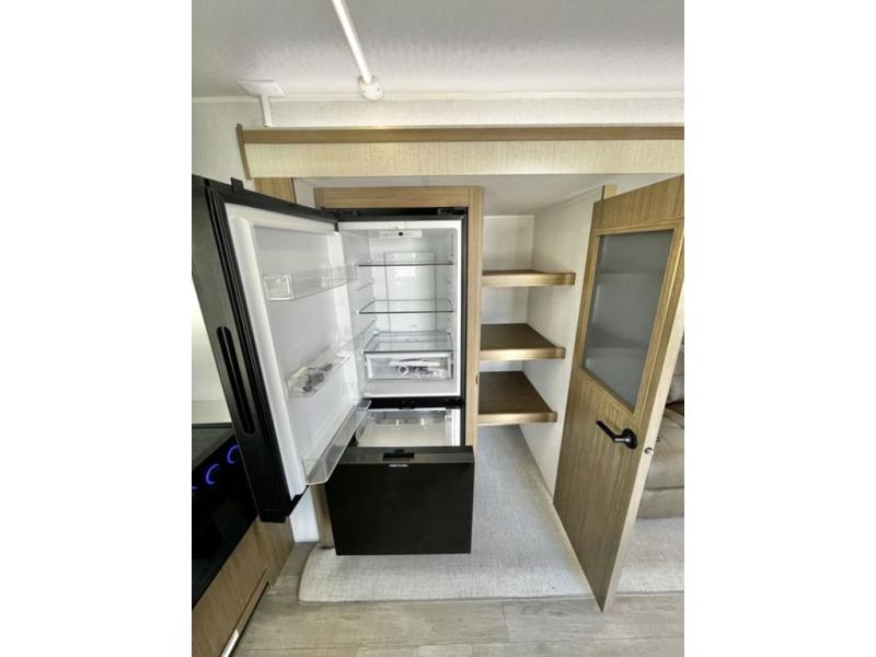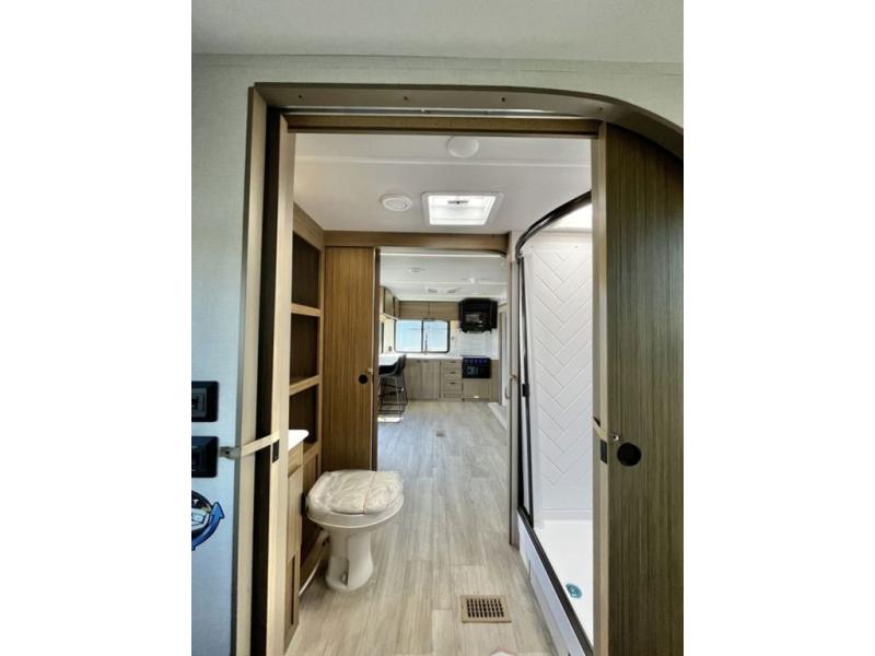 You're going to love cooking in the rear kitchen of this travel trailer! It has everything you need to prepare delicious home cooked meals including a large pantry and oversized fridge, plus there are two bar stools to sit on while you enjoy them. The theater seating is conveniently across from the swiveling entertainment center which has hidden shelves behind it for your games and movies. As you walk through the bathroom, you will notice a walk-in shower to the left and a toilet and sink to the right. It leads directly into the front private bedroom which has a Versa-Tilt custom king bed to lay your head on at night and wardrobes/nightstands on either side for your items!