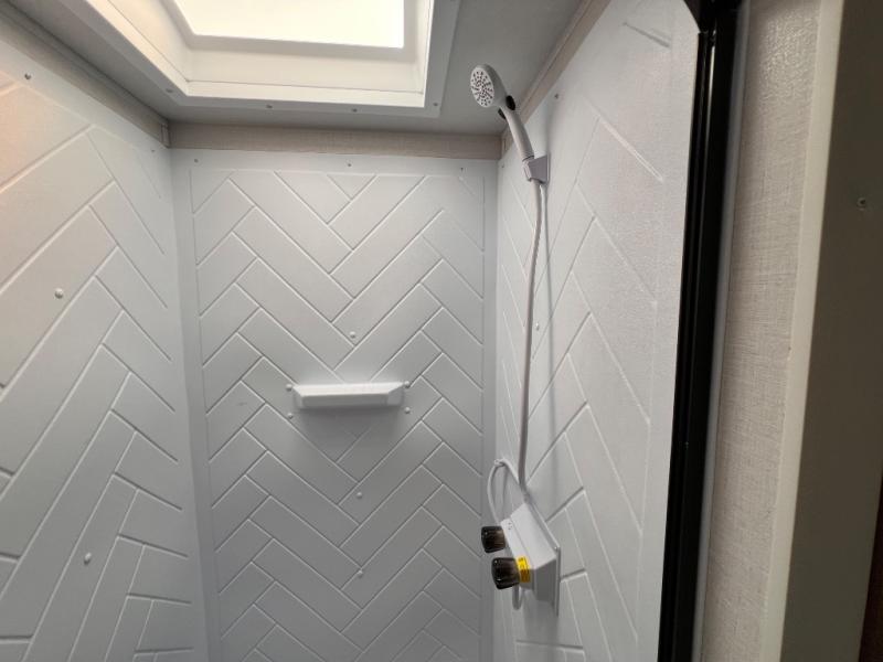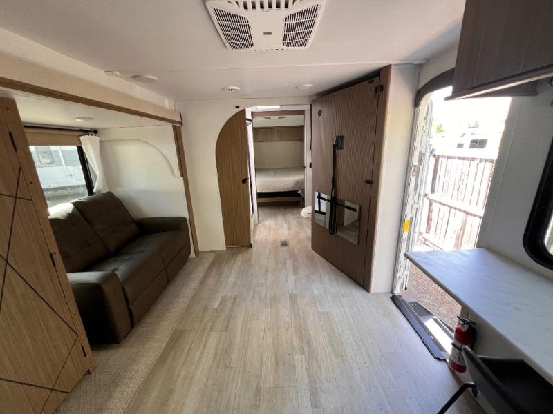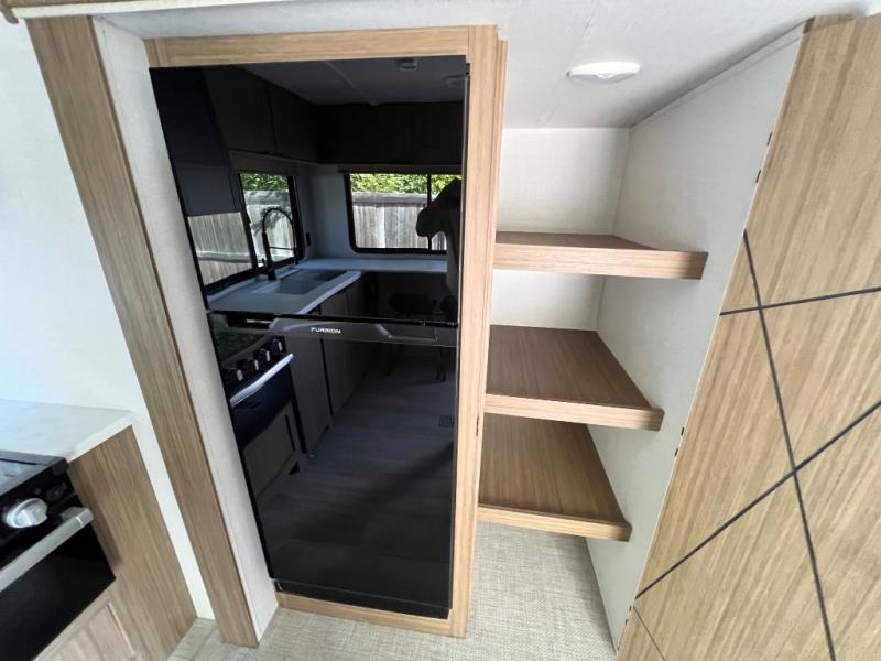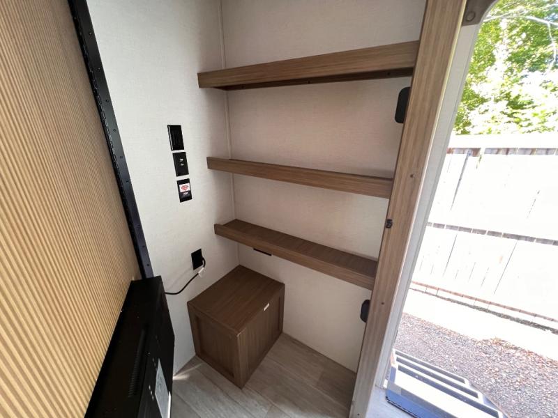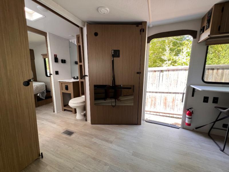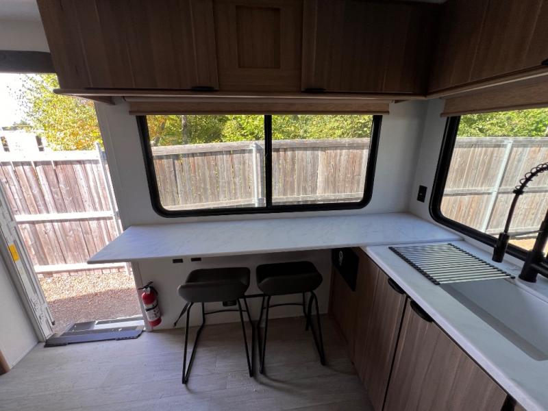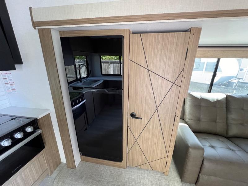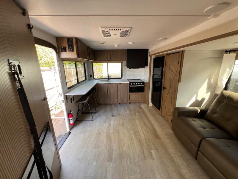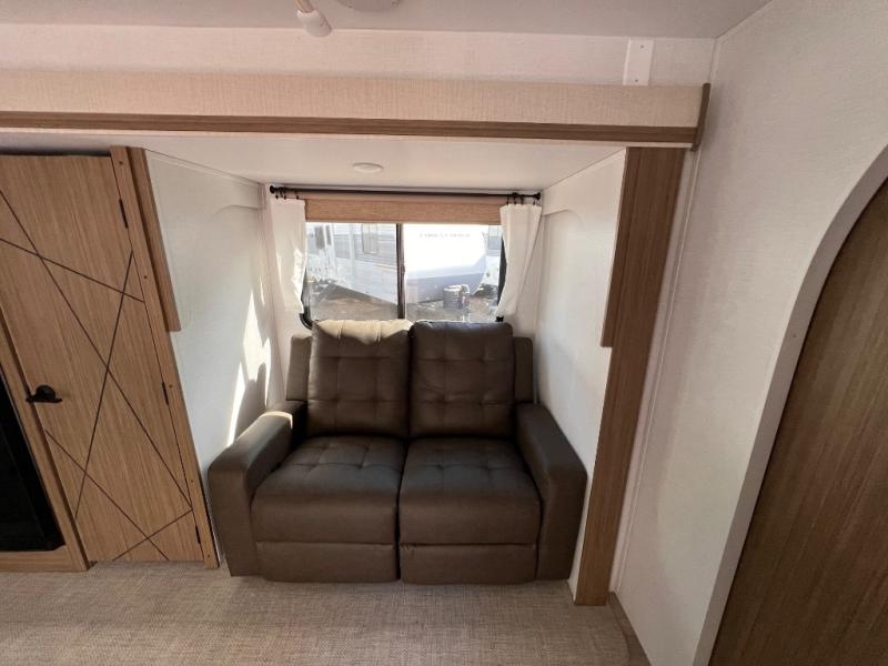 You're going to love cooking in the rear kitchen of this travel trailer! It has everything you need to prepare delicious home cooked meals including a large pantry and oversized fridge, plus there are two bar stools to sit on while you enjoy them. The theater seating is conveniently across from the swiveling entertainment center which has hidden shelves behind it for your games and movies. As you walk through the bathroom, you will notice a walk-in shower to the left and a toilet and sink to the right. It leads directly into the front private bedroom which has a Versa-Tilt custom king bed to lay your head on at night and wardrobes/nightstands on either side for your items!