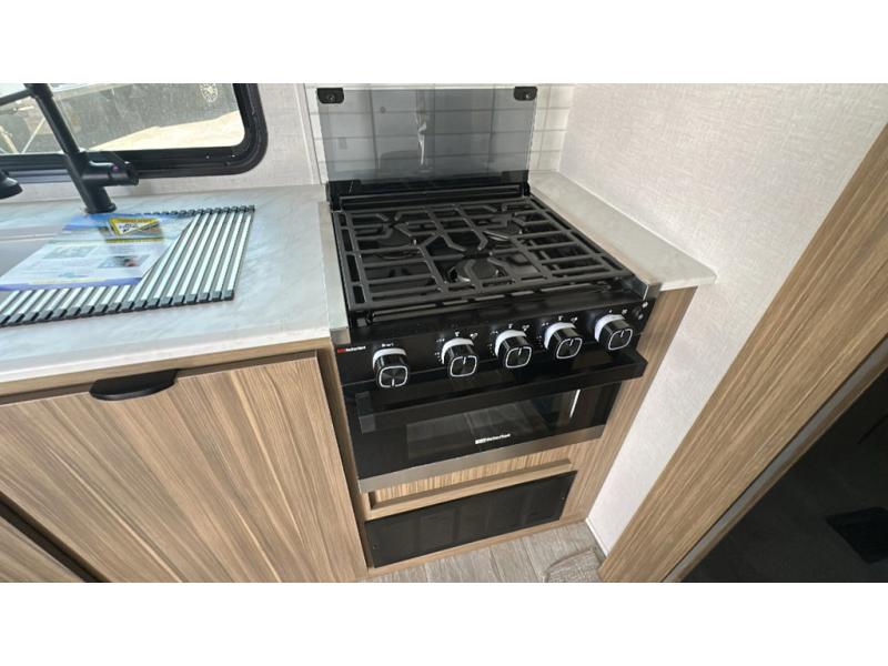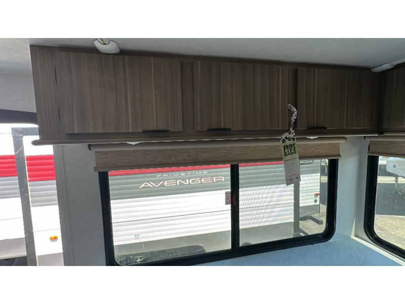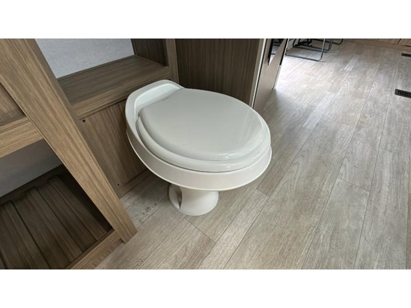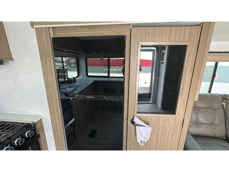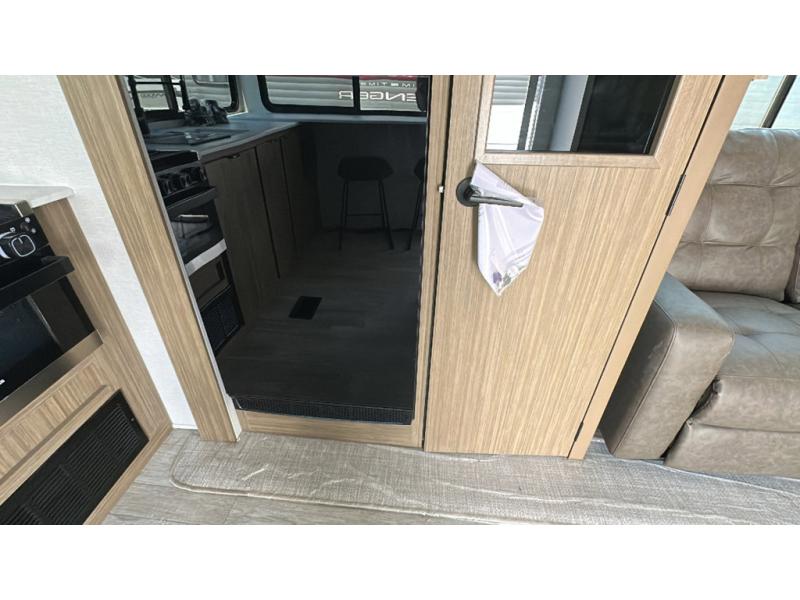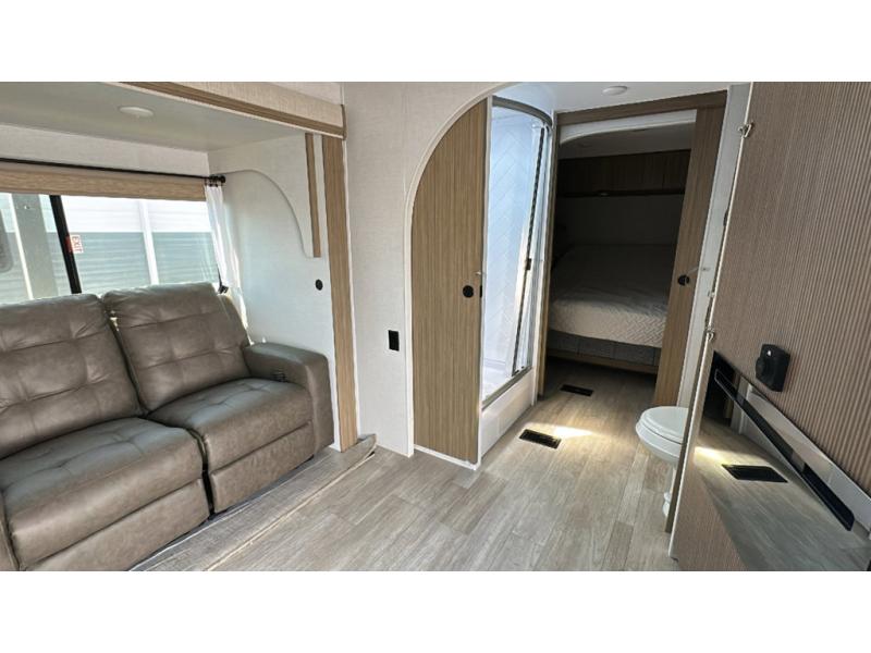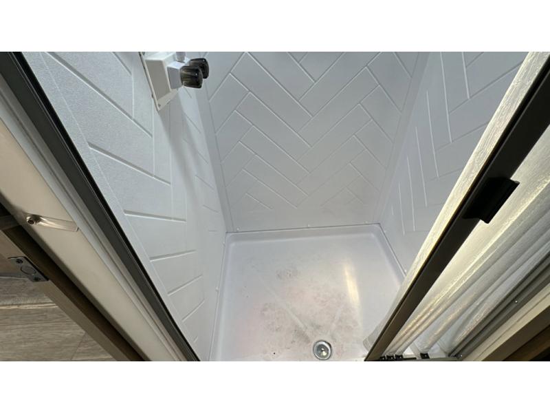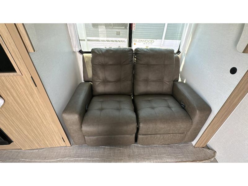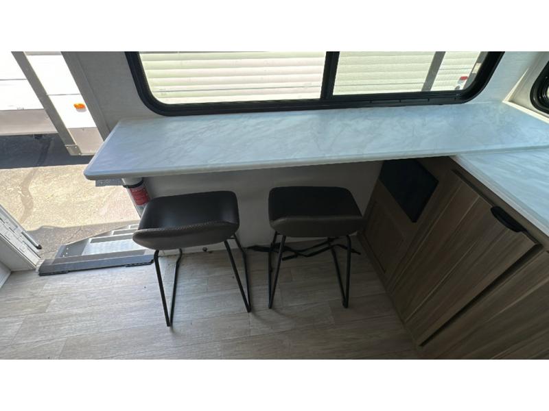 You're going to love cooking in the rear kitchen of this travel trailer! It has everything you need to prepare delicious home cooked meals including a large pantry and oversized fridge, plus there are two bar stools to sit on while you enjoy them. The theater seating is conveniently across from the swiveling entertainment center which has hidden shelves behind it for your games and movies. As you walk through the bathroom, you will notice a walk-in shower to the left and a toilet and sink to the right. It leads directly into the front private bedroom which has a Versa-Tilt custom king bed to lay your head on at night and wardrobes/nightstands on either side for your items!