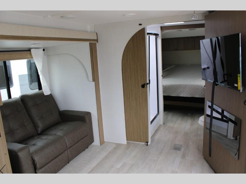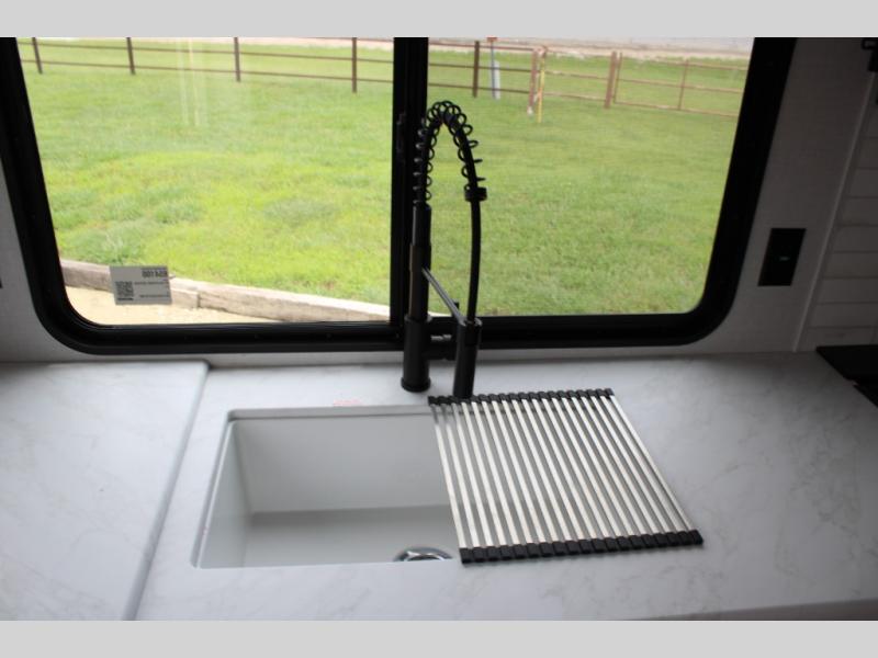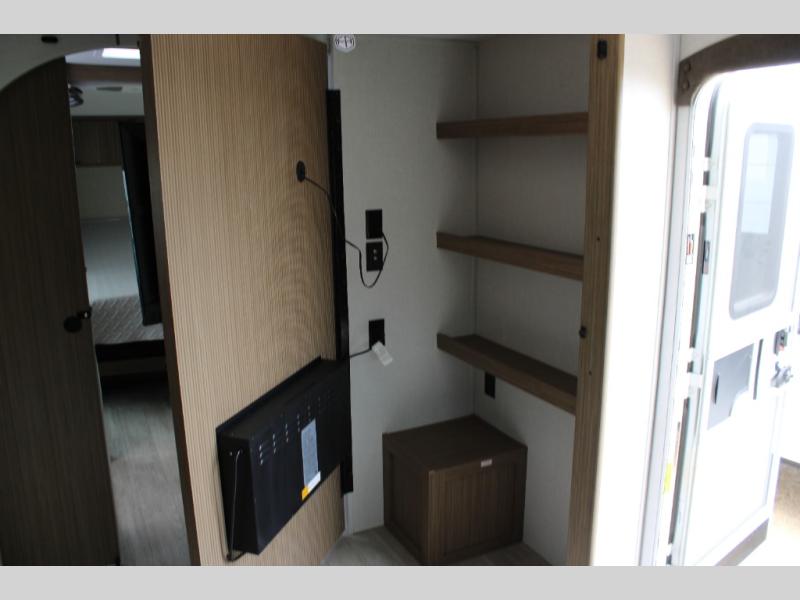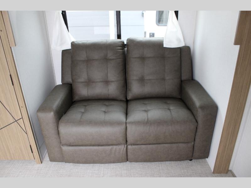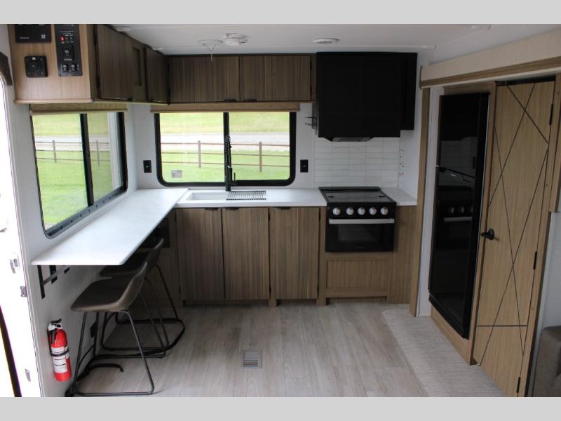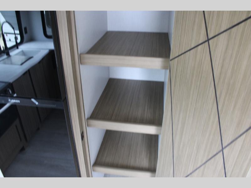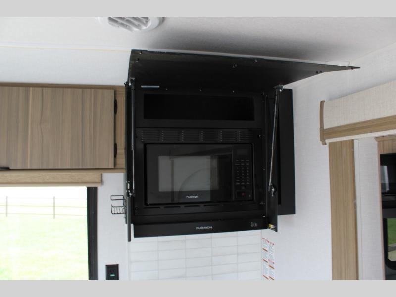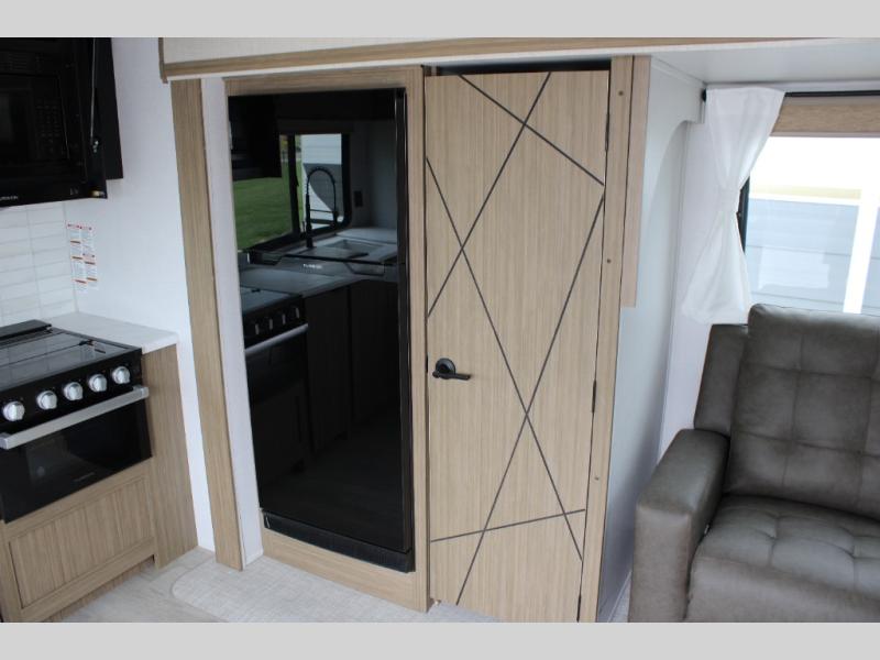 You're going to love cooking in the rear kitchen of this travel trailer! It has everything you need to prepare delicious home cooked meals including a large pantry and oversized fridge, plus there are two bar stools to sit on while you enjoy them. The theater seating is conveniently across from the swiveling entertainment center which has hidden shelves behind it for your games and movies. As you walk through the bathroom, you will notice a walk-in shower to the left and a toilet and sink to the right. It leads directly into the front private bedroom which has a Versa-Tilt custom king bed to lay your head on at night and wardrobes/nightstands on either side for your items!