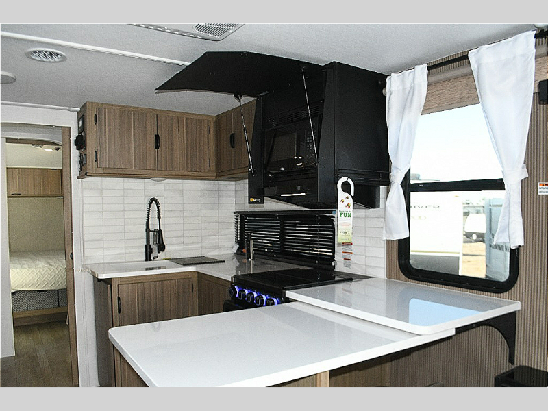 - Fully Equipped Kitchen: The kitchen includes a three-burner cooktop, microwave, oven, and a spacious refrigerator, as well as a sink and ample counter space. It’s everything you need to prepare meals on the road with ease.