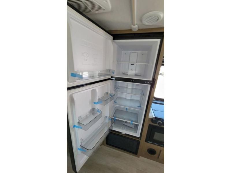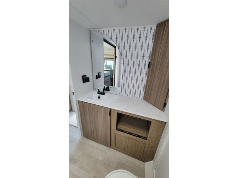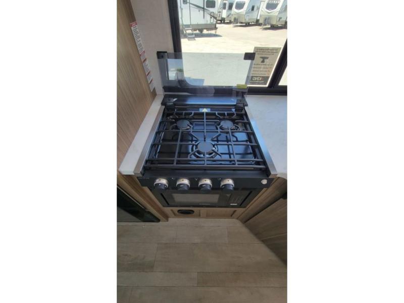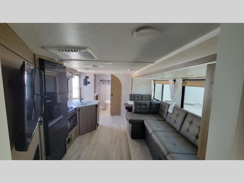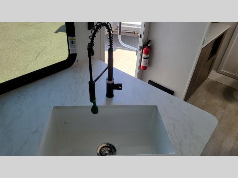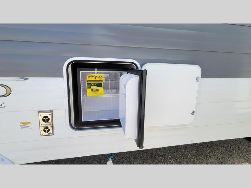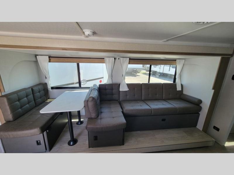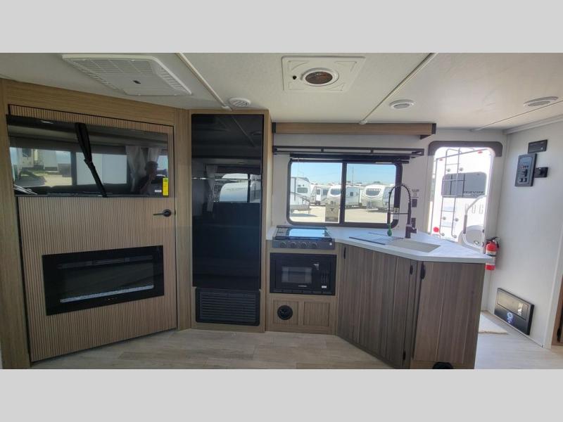 You're sure to make camping memories in this spacious travel trailer! You can sleep four to five people each night thanks to the the custom king bed with Versa Tilt in the front bedroom plus the Versa-Lounge and booth dinette within the large slide out! The full kitchen will let you make meals each day, and you'll appreciate the hidden pantry with shelves behind the fireplace. And don't overlook the full rear bath, complete with a tub/shower and ample counter space for your things.