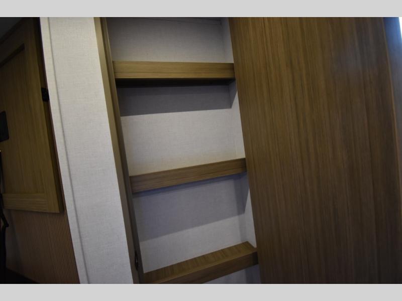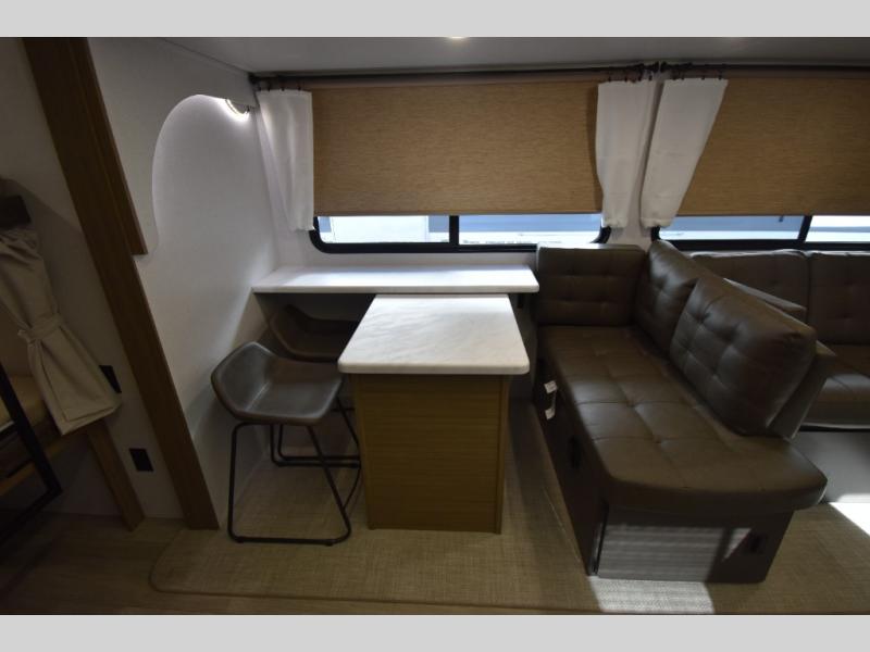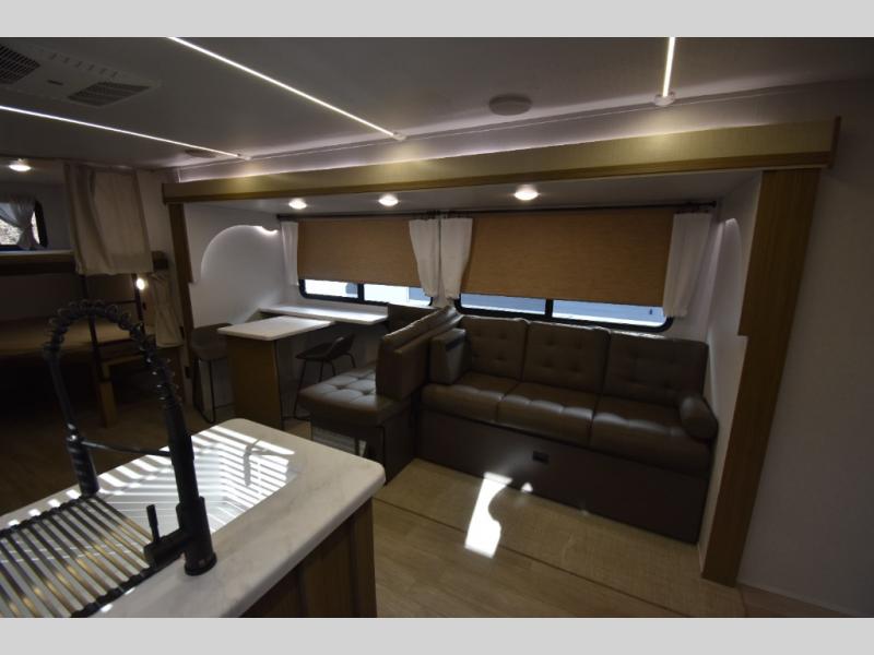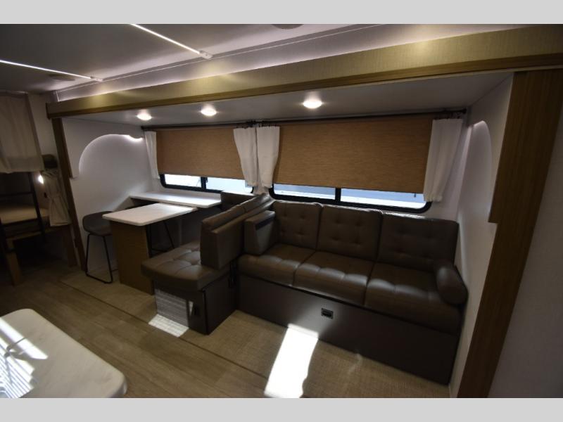 This Wildwood travel trailer is perfect for a larger group and family since it includes double-size bunks for the kids or friends, and a front private bedroom for you to enjoy. You'll find a Versa Lounge in the large slide out which includes a large U-shaped dinette and sofa, and the panoramic windows will provide great views. This model includes two entry doors, one leading into the main living area and another leading into the rear corner bath for convenience. Bring along all of your camping gear in the pass-through storage, and the interior walk-in pantry can hold all the snacks. There is an exterior camp kitchen beneath an 18' power awning with adjustable legs to keep you protected from the hot summer sun or rain. This also provides more outdoor living space for your family to enjoy.