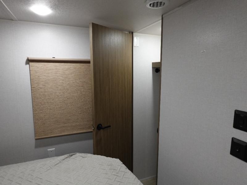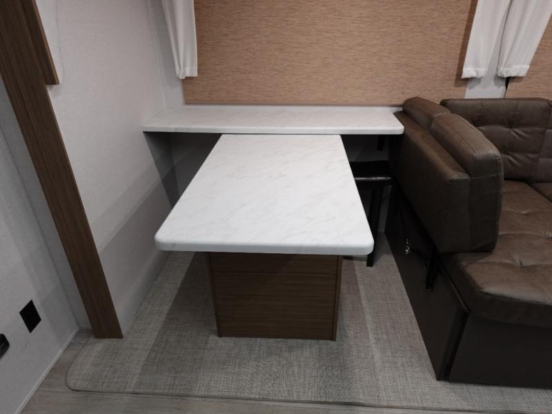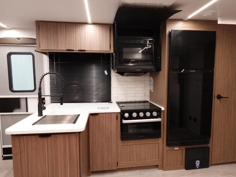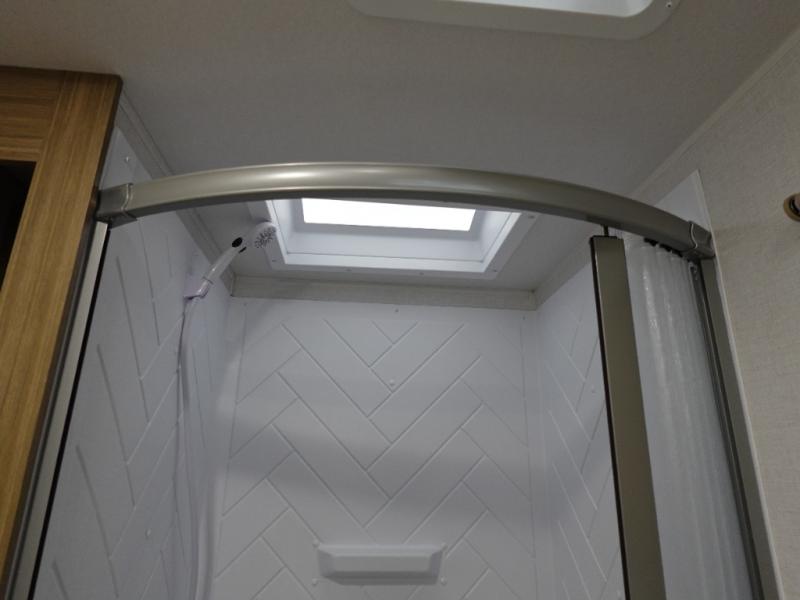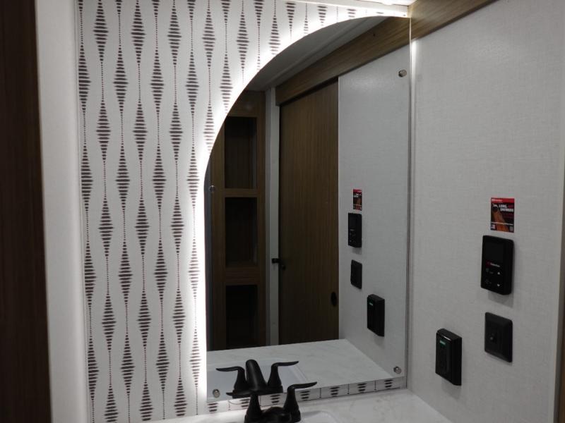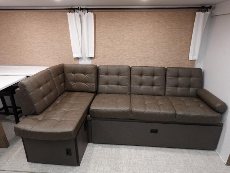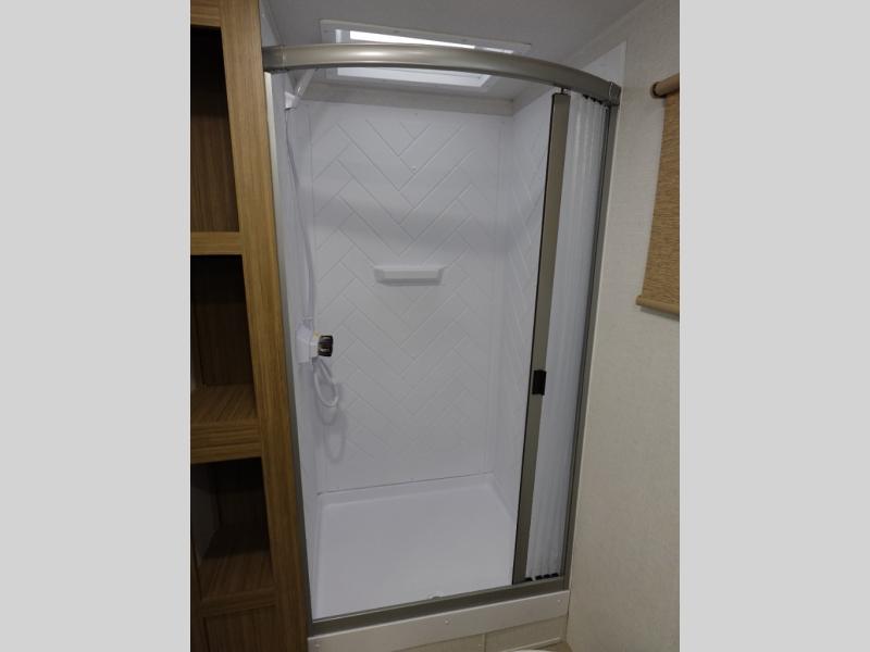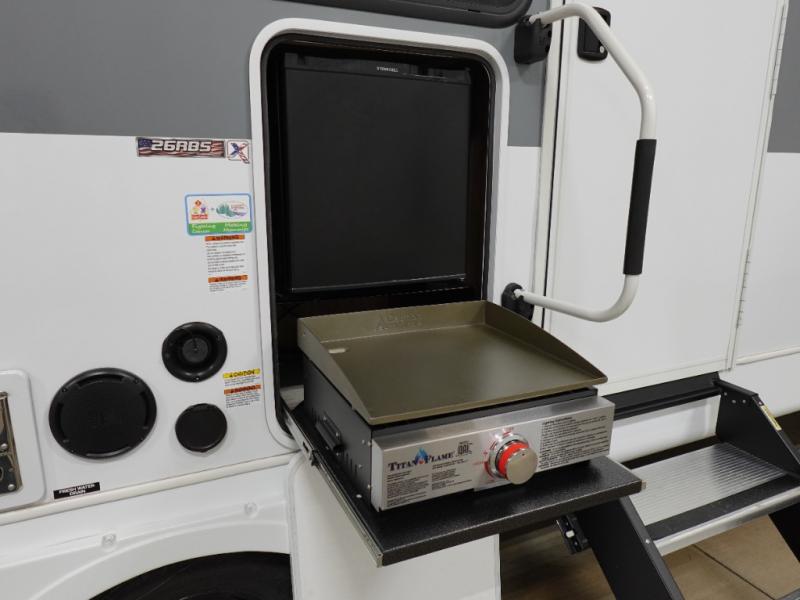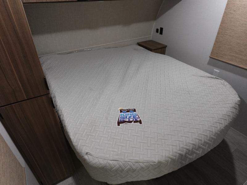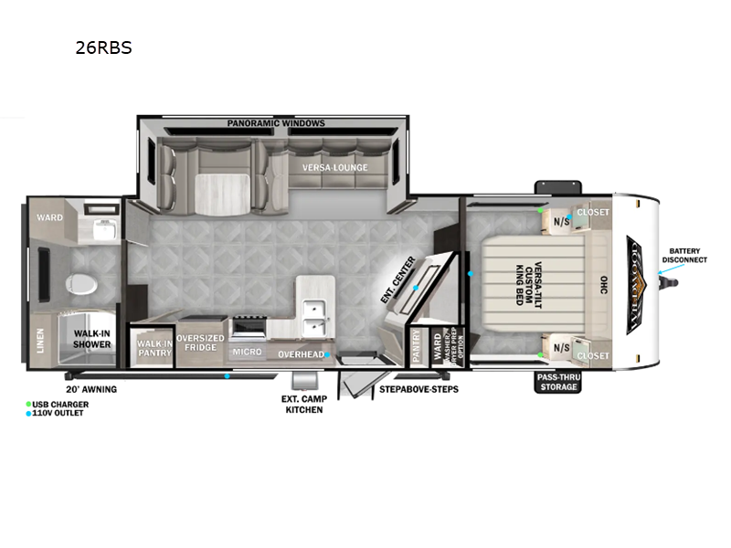 Sleeping for up to six with a custom king bed with Versa-Tilt in the private front bedroom, and a versa-lounge which can be transformed into added sleeping when needed. You will love the added space thanks to the large slide and the view through the large panoramic windows will bring the outdoors inside! Cooking will be easy either indoors our out with an exterior camp kitchen situated under the 20' awning. Inside, two pantries and an oversized fridge will hold all of your food, both dry and canned goods plus perishables will be kept fresh. There is also a walk-in closet as well as two nightstands and two upper shirt closets for your clothing and other personal belongings. A nice sized walk-in shower in the back of this unit, plus linen cabinet and extra wardrobe will keep everyone feeling clean and refreshed. On the outside of this unit, you will find more storage in the front pass-through compartment which is great for outdoor games and gear.
