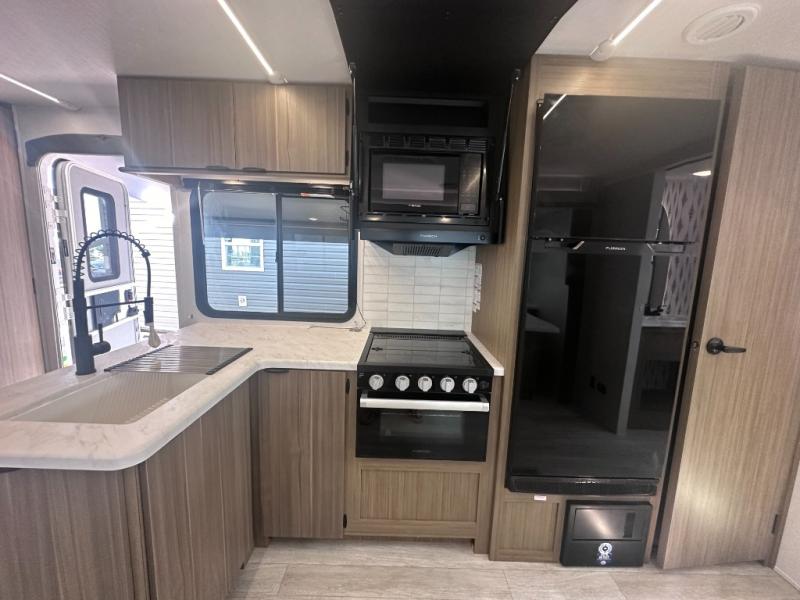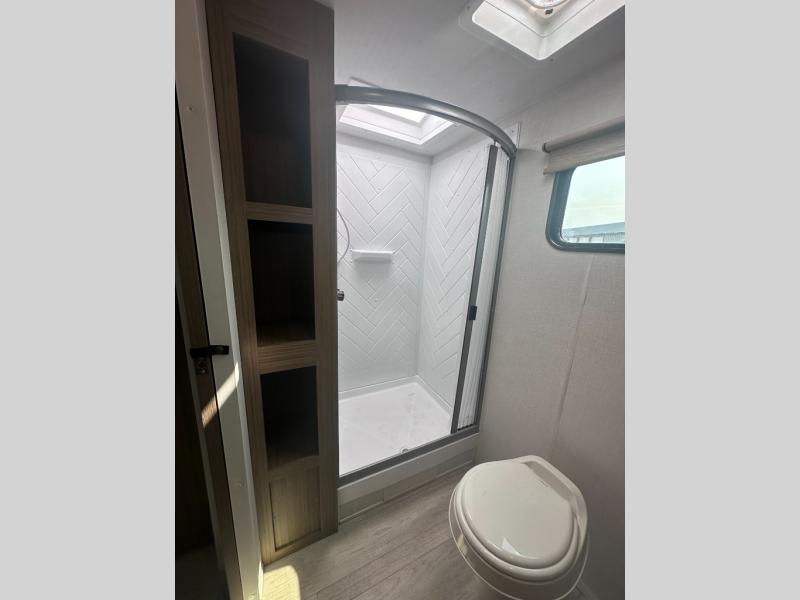 Sleeping for up to six with a custom king bed in the private front bedroom, and a versa-lounge and U-shaped dinette which can both be transformed into added sleeping when needed. You will love the added space thanks to the large slide and the view through the large panoramic windows will bring the outdoors inside! Cooking will be easy either indoors our out with an exterior camp kitchen situated under the 20' awning. Inside, two pantries and an oversized fridge will hold all of your food, both dry and canned goods plus perishables will be kept fresh. The front private bedroom is where you will find the custom king-sized Versa Tilt bed. There is also a walk-in closet as well as two nightstands and two upper shirt closets for your clothing and other personal belongings. A nice sized walk-in shower in the back of this unit, plus linen cabinet and extra wardrobe will keep everyone feeling clean and refreshed. On the outside of this unit, you will find more storage in the front pass-through compartment which is great for outdoor games and gear.