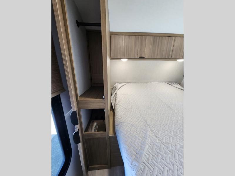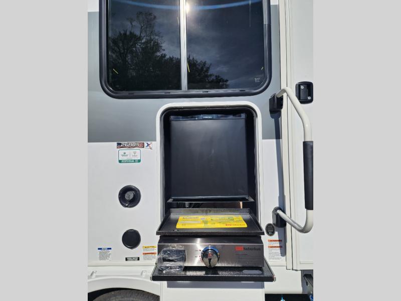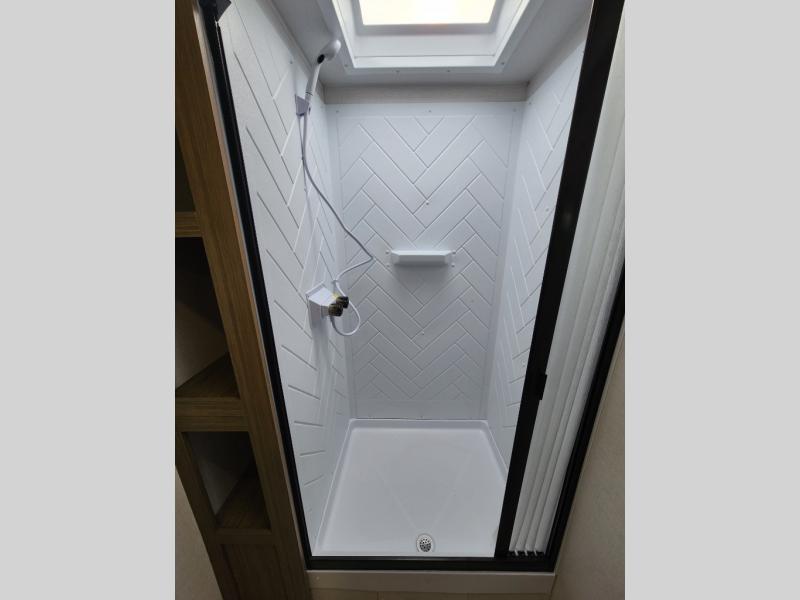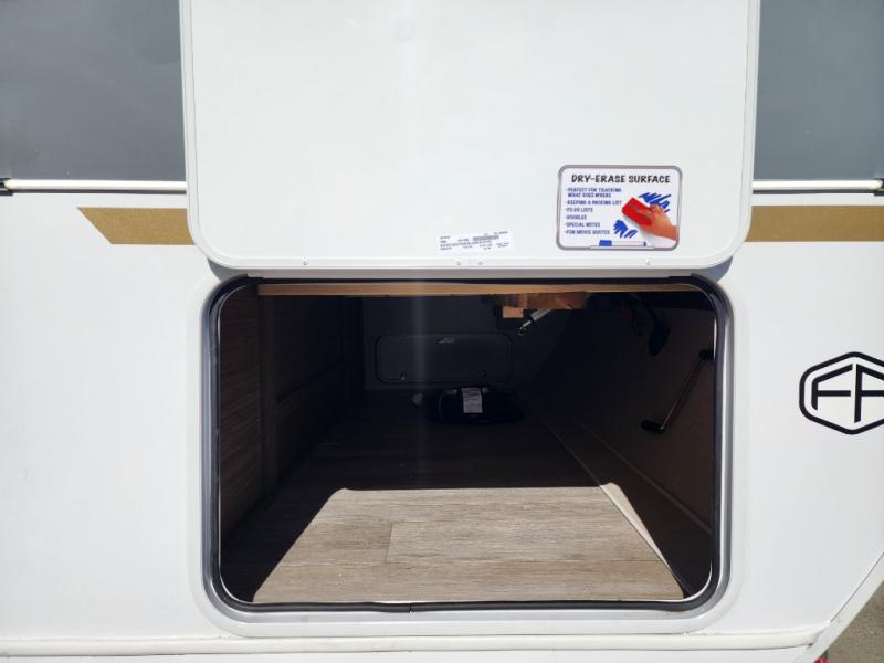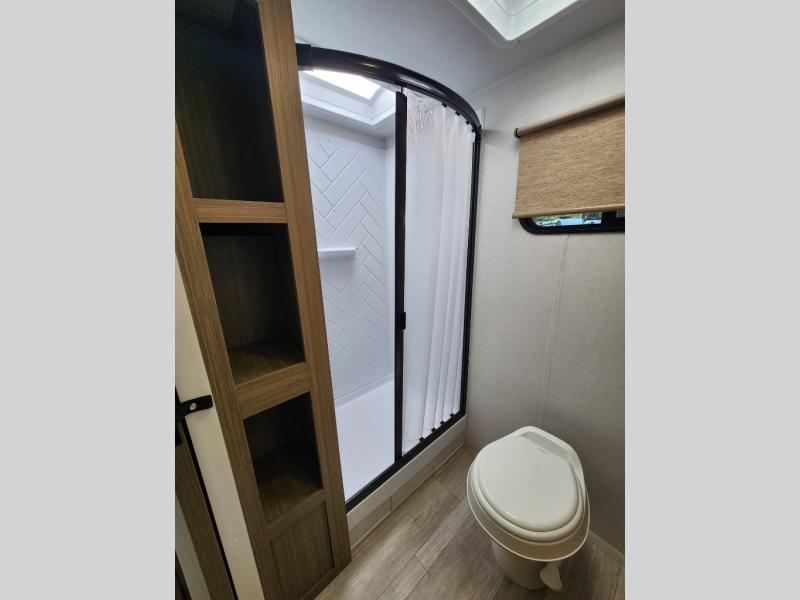 Sleeping for up to six with a custom king bed with Versa-Tilt in the private front bedroom, and a versa-lounge within the large slide out. There is also a Versa Flex table here where you can dine and work while at the campground. Cooking will be easy either indoors our out with an exterior camp kitchen situated under the 20' awning. Inside, two pantries and an oversized refrigerator will hold all of your food, both dry and canned goods plus perishables will be kept fresh. A nice sized walk-in shower in the back of this unit, plus linen cabinet and extra wardrobe will keep everyone feeling clean and refreshed. On the outside of this unit, you will find more storage in the front pass-through compartment which is great for outdoor games and gear.