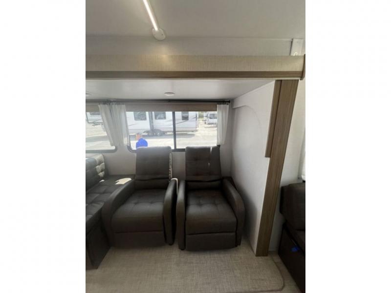 Pack up the kids and bring the dog along for a fun family vacation in this double-slide Wildwood travel trailer. This unit features a rear living area with a sofa and an entertainment center with a fireplace for a cozy evening. There is also a Versa Flex table and dual lounge chairs for more seating and work space. The kitchen island provides more counter space, and you will love having a pantry for canned goods or snacks. Up front, you'll find a Versa-Tilt custom king bed for a great night's rest, along with dual closets and a wardrobe with a washer/dryer prep option!