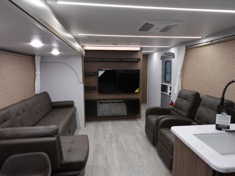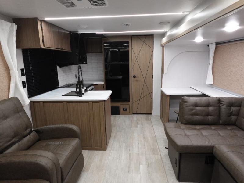 This Wildwood travel trailer is perfect for your family looking for a new adventure. You will enjoy the rear kitchen that includes an oversized refrigerator and cooktop. The Versa-Lounge will provide comfortable seating and sleeping space, and the Versa Flex table gives you a space to dine and work if needed. This unit also includes two lounge chairs so you'll feel right at home! You'll love the full bath in this unit, and the custom king bed with Versa-Tilt in the private bedroom is perfect for a good night's rest.