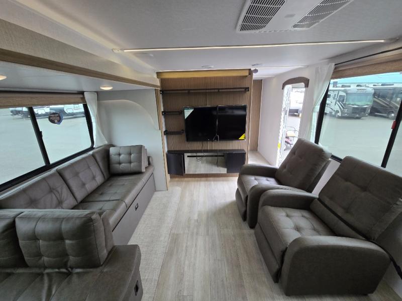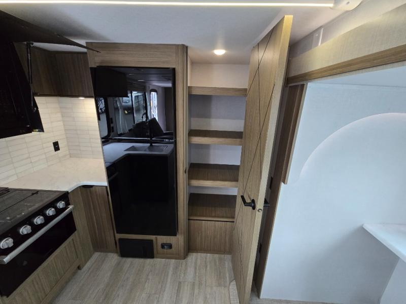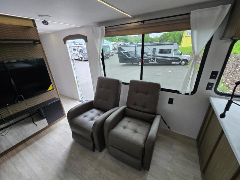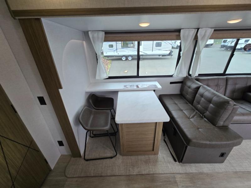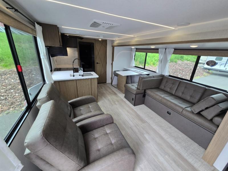 This Wildwood travel trailer is perfect for your family looking for a new adventure. You will enjoy the rear kitchen that includes an oversized refrigerator and cooktop. The Versa-Lounge will provide comfortable seating and sleeping space, and the Versa Flex table gives you a space to dine and work if needed. This unit also includes two lounge chairs so you'll feel right at home! You'll love the full bath in this unit, and the custom king bed with Versa-Tilt in the private bedroom is perfect for a good night's rest.