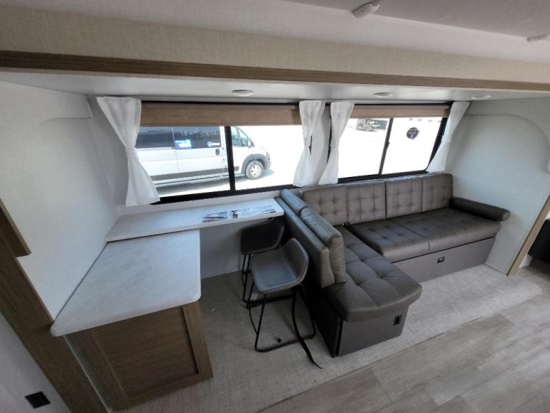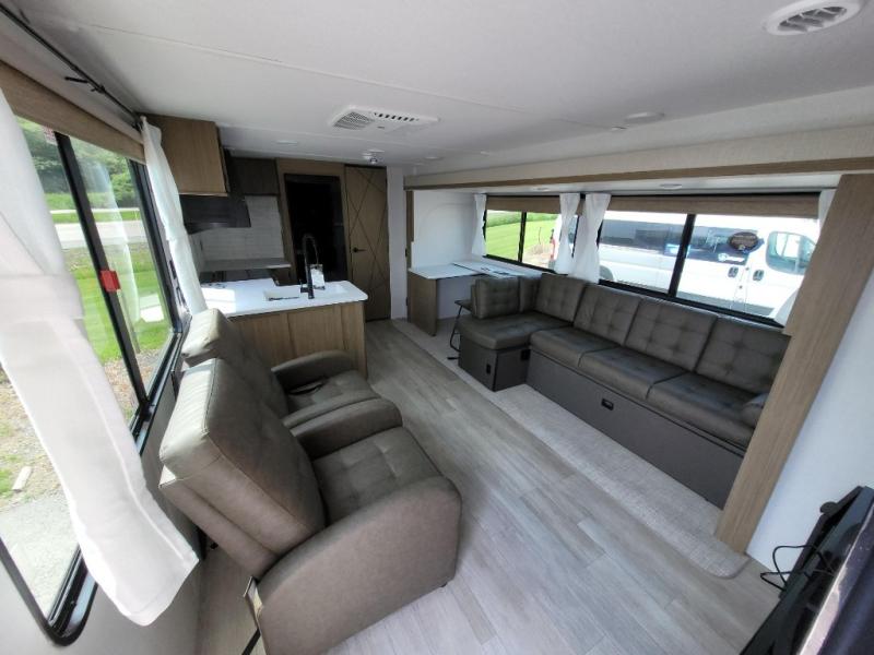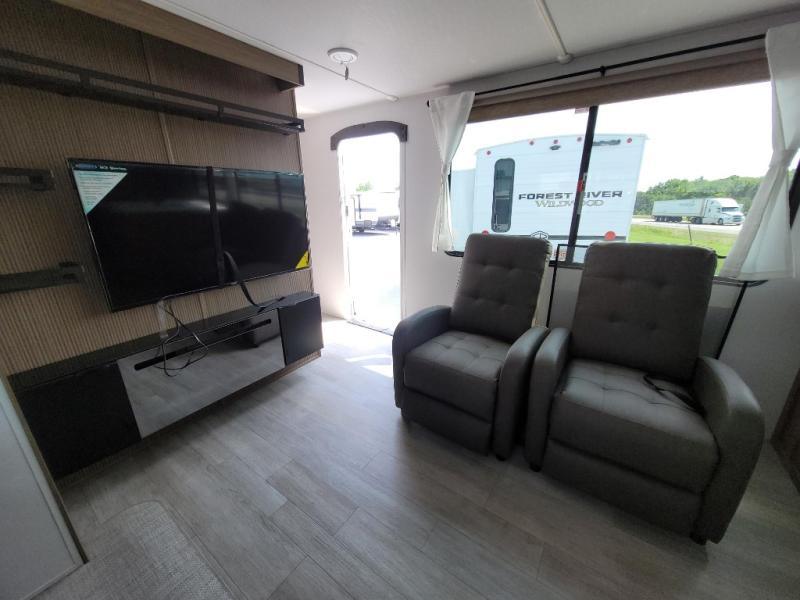 This Wildwood travel trailer is perfect for your family looking for a new adventure. You will enjoy the rear kitchen that includes an oversized refrigerator and cooktop. The Versa-Lounge will provide comfortable seating and sleeping space, and the Versa Flex table gives you a space to dine and work if needed. This unit also includes two lounge chairs so you'll feel right at home! You'll love the full bath in this unit, and the custom king bed with Versa-Tilt in the private bedroom is perfect for a good night's rest.
