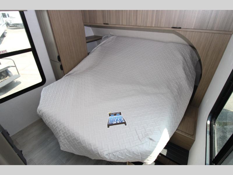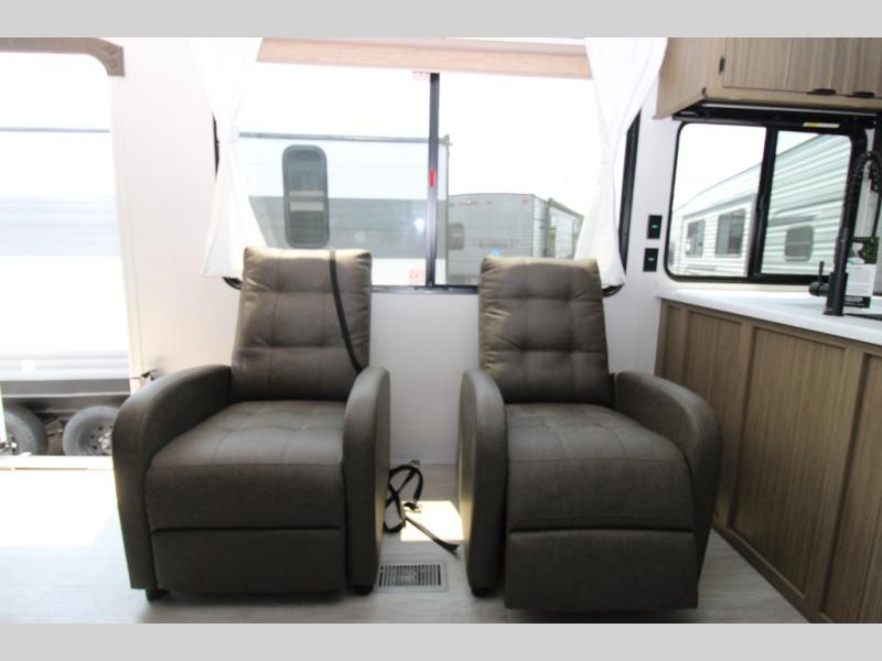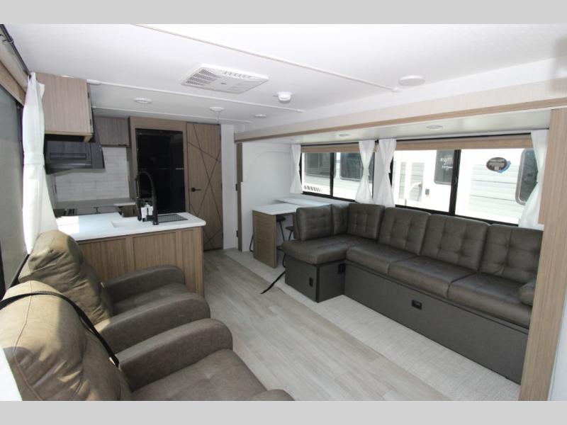 This Wildwood travel trailer is perfect for your family looking for a new adventure. You will enjoy the rear kitchen that includes an oversized refrigerator and cooktop. The Versa-Lounge will provide comfortable seating and sleeping space, and the Versa Flex table gives you a space to dine and work if needed. This unit also includes two lounge chairs so you'll feel right at home! You'll love the full bath in this unit, and the custom king bed with Versa-Tilt in the private bedroom is perfect for a good night's rest.