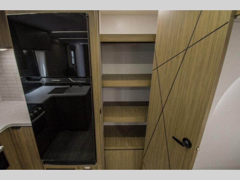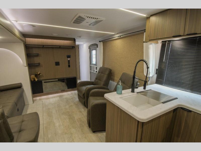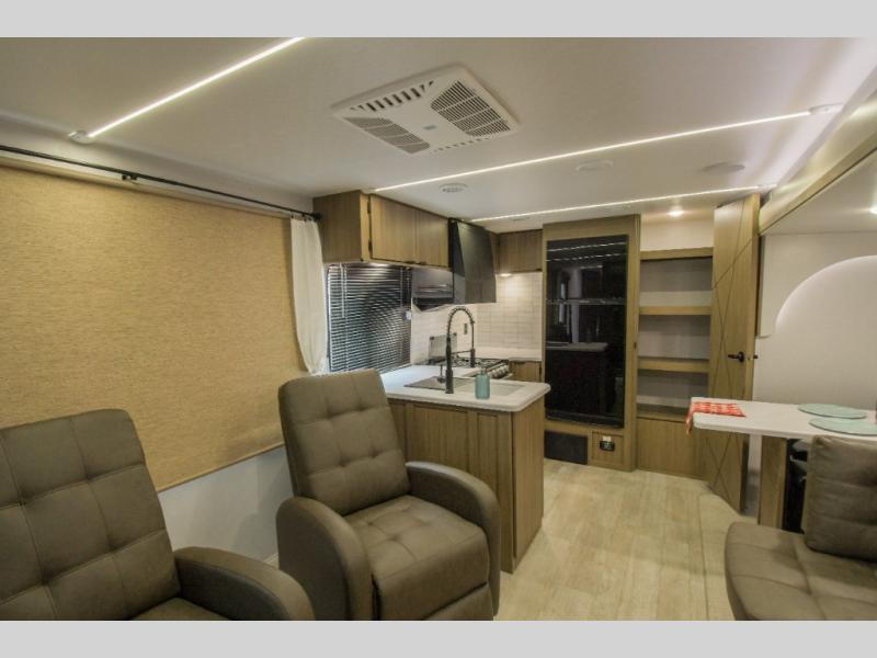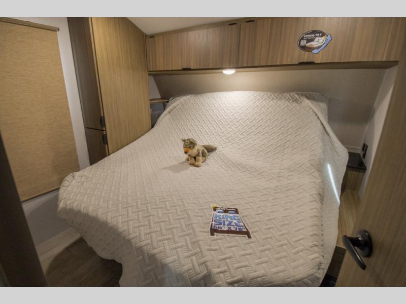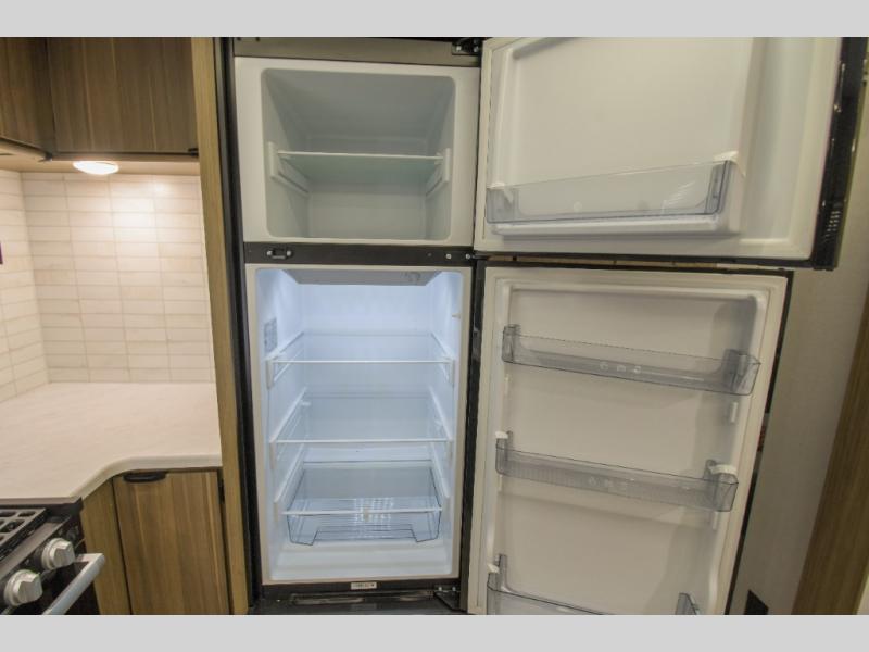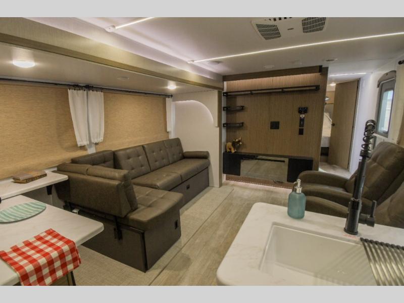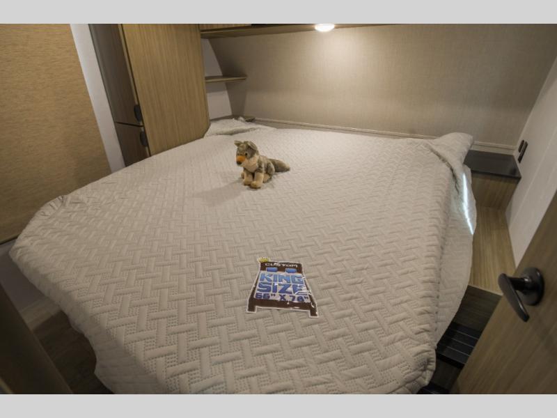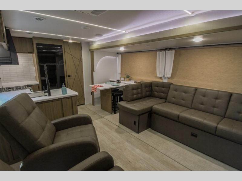 This Wildwood Platinum travel trailer is perfect for your family of five looking for a new adventure. You will enjoy the rear kitchen that includes an oversized refrigerator and a three-burner cooktop. The booth dinette within the slide out is perfect for enjoying meals, and when you're through, you can relax on the sofa. Both of these pieces of furniture are a part of the Versa Lounge which allows you to customize their function by moving the middle section to create a larger sofa or a larger dinette. This unit also includes two lounge chairs, so you'll feel right at home! You'll love the full bath in this unit, and the custom king bed in the private bedroom is perfect for a good night's rest.