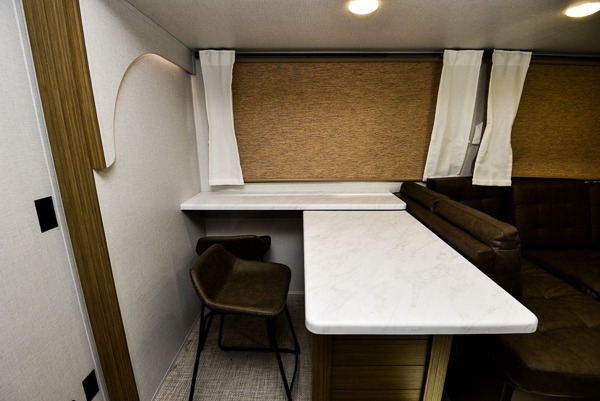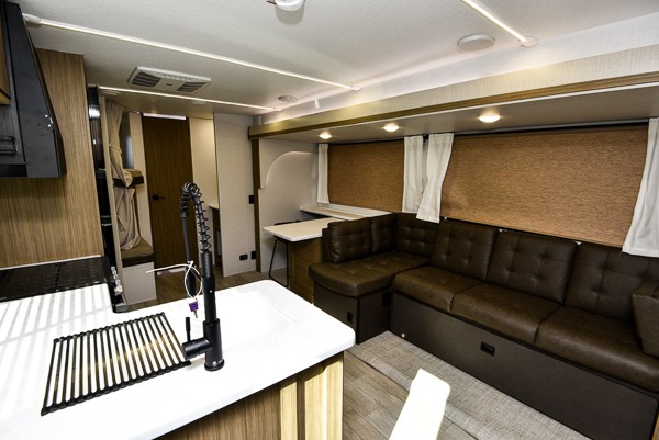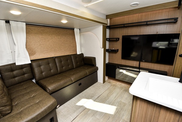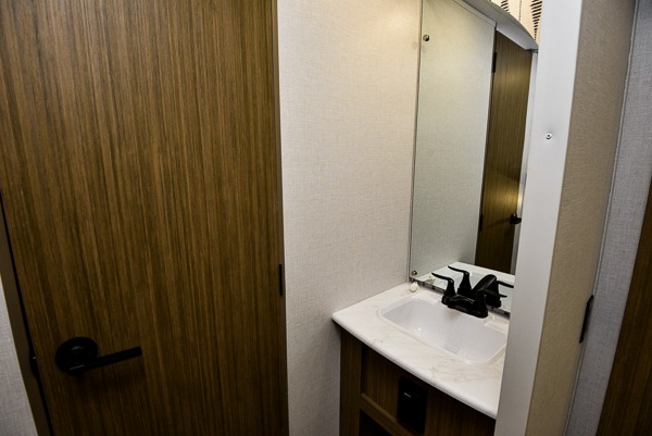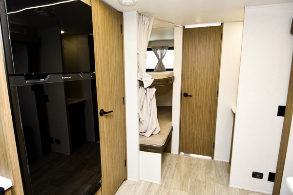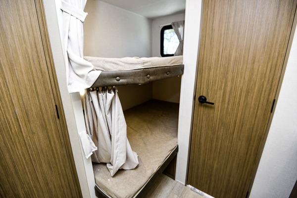 What I liked most: Good amount of exterior storage with larger area in the rear of RV. Power Jacks. Room to walk around master bed. Place for shoes when you walk in. Two double bunks. Surround type speakers in living area. Storage under couch. End cap storage. Bathroom sink separate from toilet area.