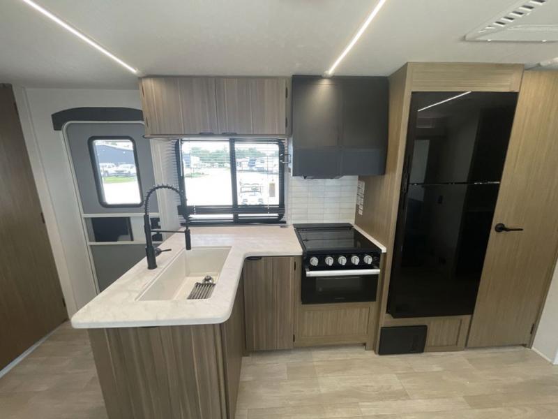 Hurry back to the campsite with this Wildwood travel trailer! With plenty of conveniences all throughout, this model gives you room and amenities to sleep eight people comfortably. You can choose from the custom king bed with Versa Tilt up front in the private bedroom, the set of double-size bunks in the back, of the Versa-Lounge in the main living area. Plus, cooking for everyone will be a breeze in the fully-equipped kitchen or optional exterior kitchen!