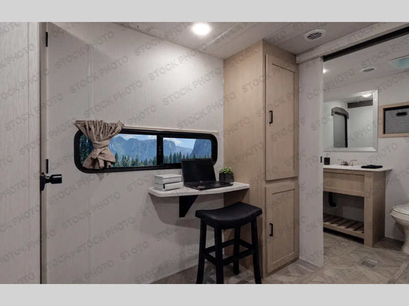 Grab your honey or your best camping friend for fun weekends in this travel trailer. There are two slide outs providing you with more space to relax, plus a front kitchen with ample counter space. The bar top with stools will provide a place to dine each morning, and the theater seat will be perfect for relaxing in the evenings. The middle master bedroom includes a king bed, a desk with TV prep above where you can work away from home if needed, and even a closet with washer and dryer prep if you plan to go RVing full-time! This model also includes a spacious full rear bath with its own exterior entry door, a walk-in shower, a linen closet for clean towels, and recessed storage for necessities. Don't overlook the exterior with its camp kitchen, 20' awning, and Versa garage for luggage, fishing poles, and more!