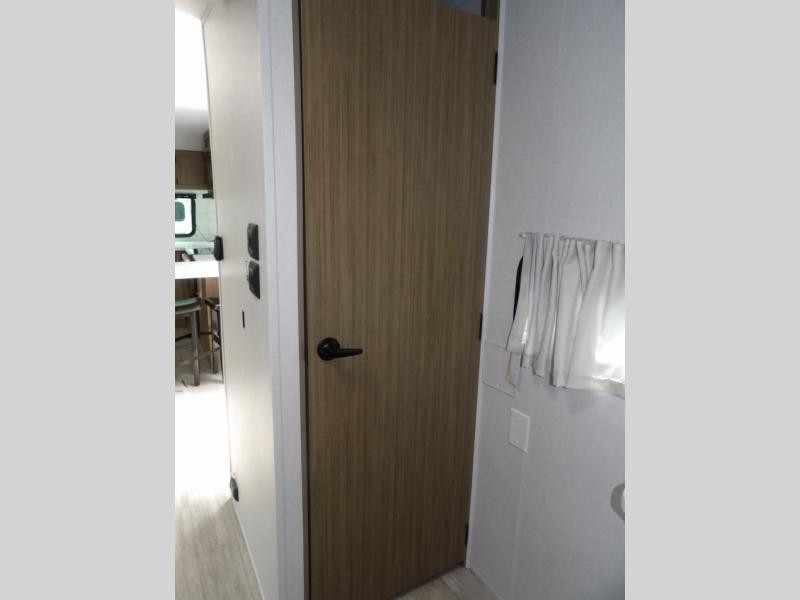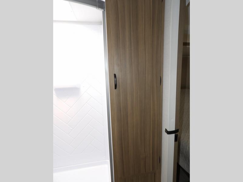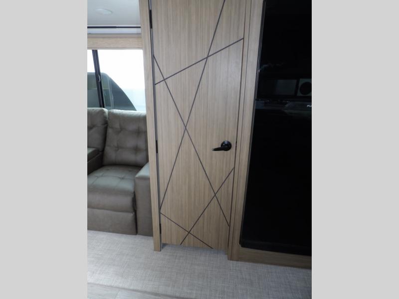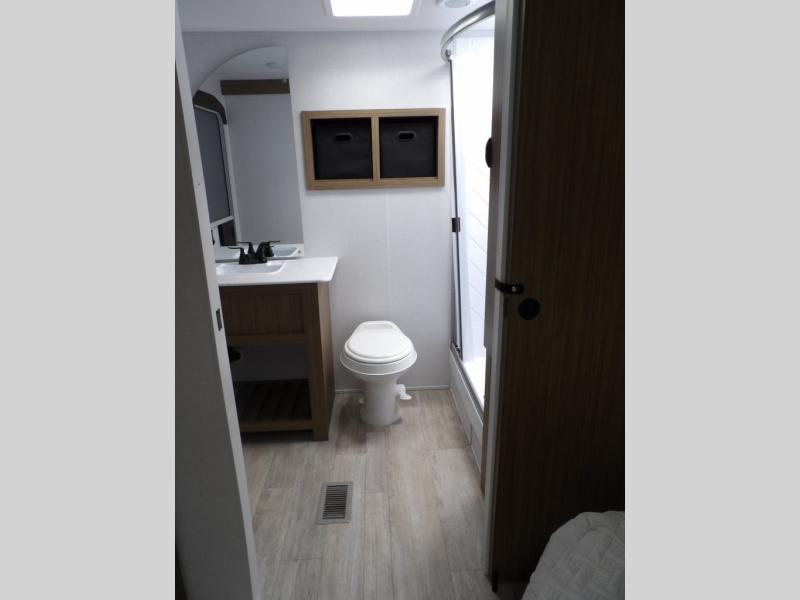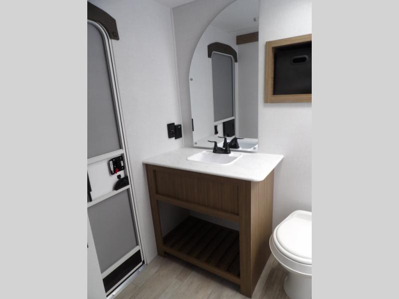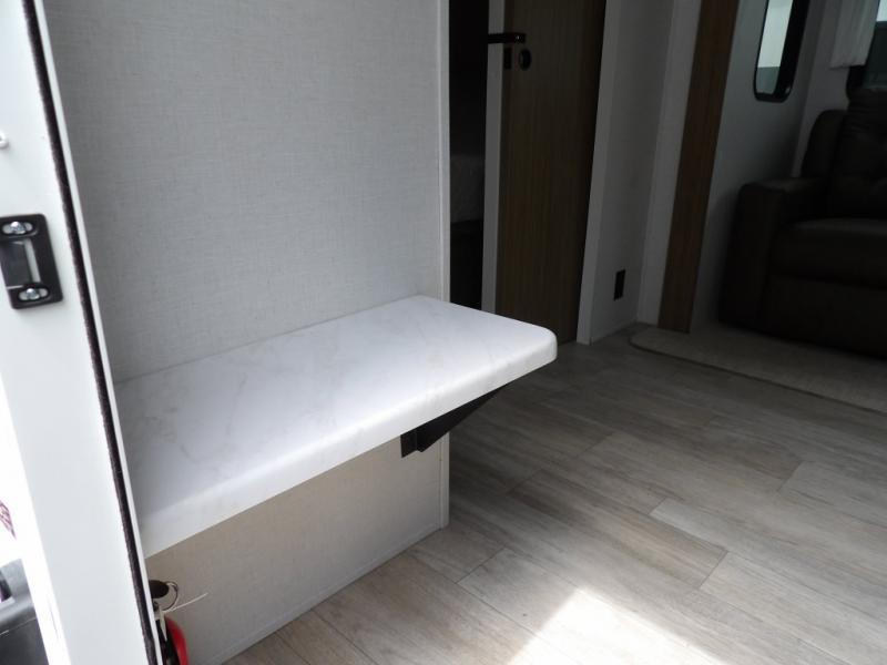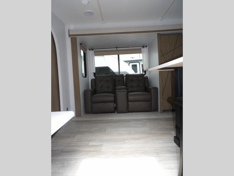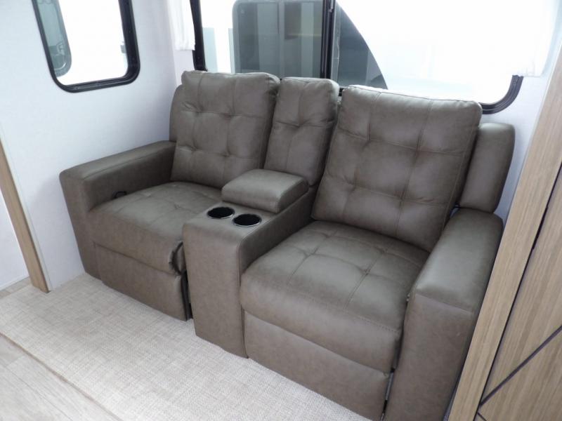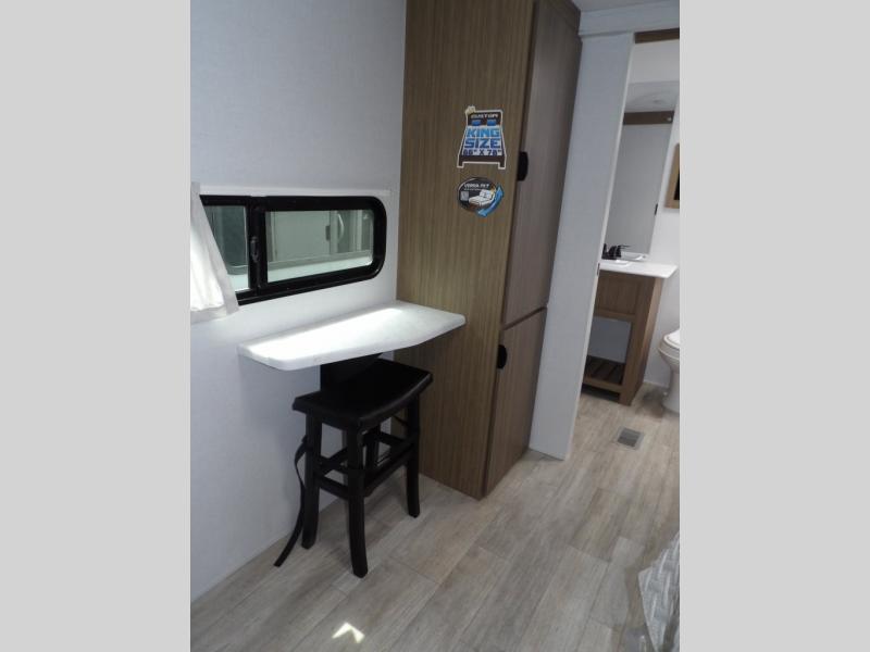 Grab your honey or your best camping friend for fun weekends in this travel trailer. There are two slide outs providing you with more space to relax, plus a front kitchen with ample counter space. The bar top with stools will provide a place to dine each morning, and the theater seat will be perfect for relaxing in the evenings. The middle master bedroom includes a custom king bed with Versa Tilt, a desk with TV prep above where you can work away from home if needed, and even a closet with washer and dryer prep if you plan to go RVing full-time! This model also includes a spacious full rear bath with its own exterior entry door, a walk-in shower, a linen closet for clean towels, and recessed storage for necessities. Don't overlook the exterior with its camp kitchen, 20' awning, and Versa garage for luggage, fishing poles, and more!