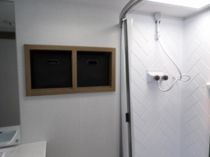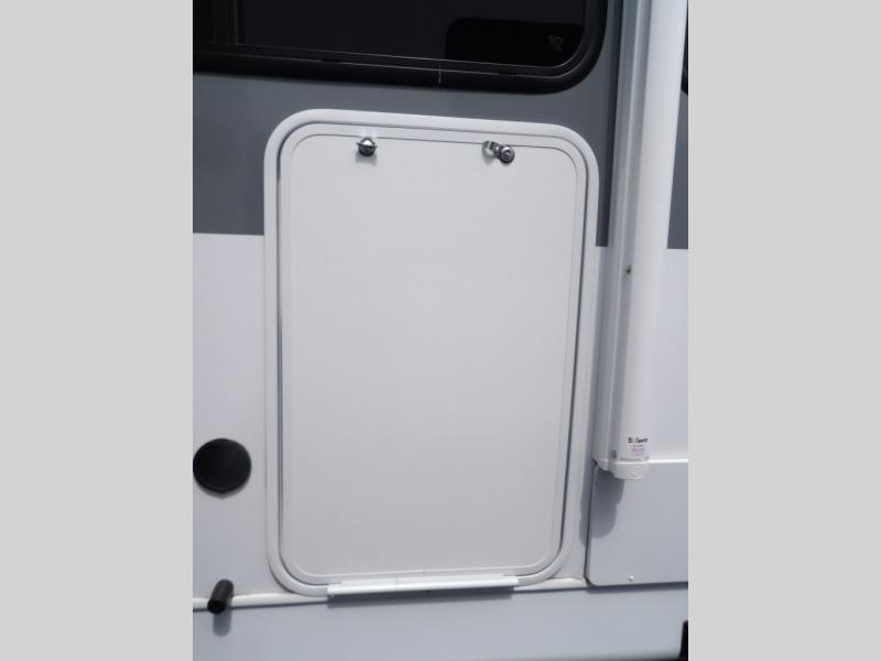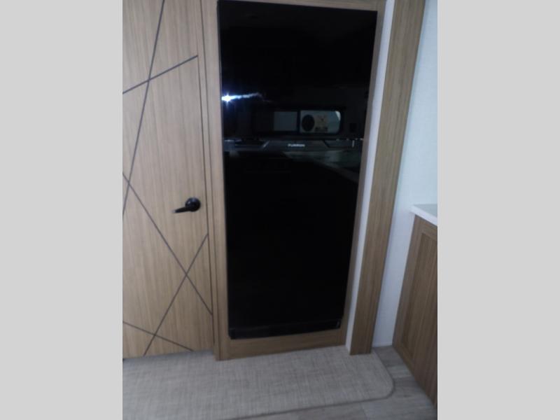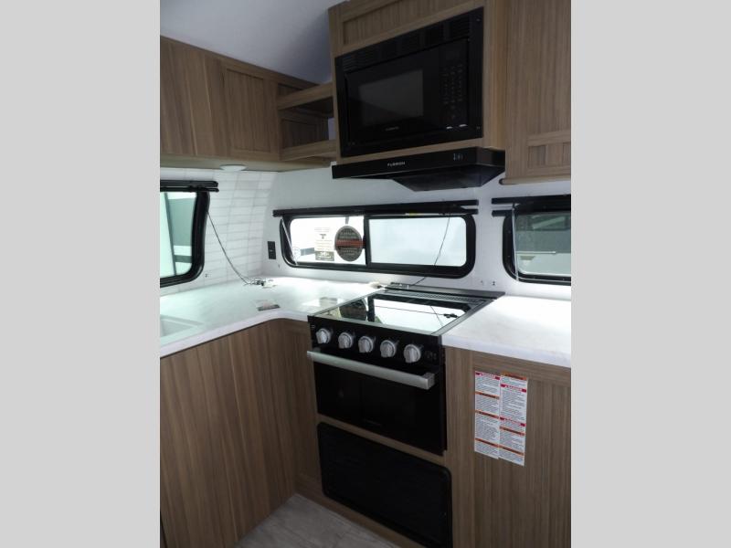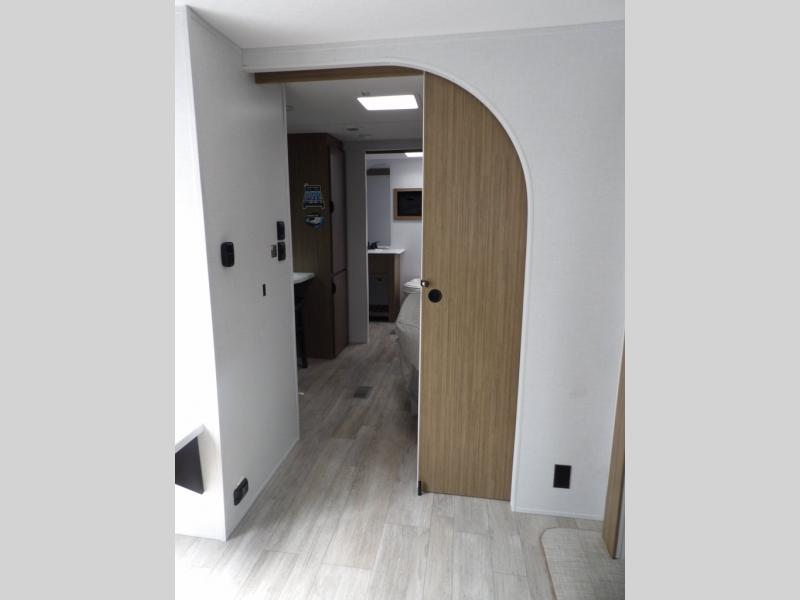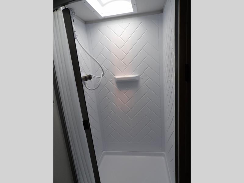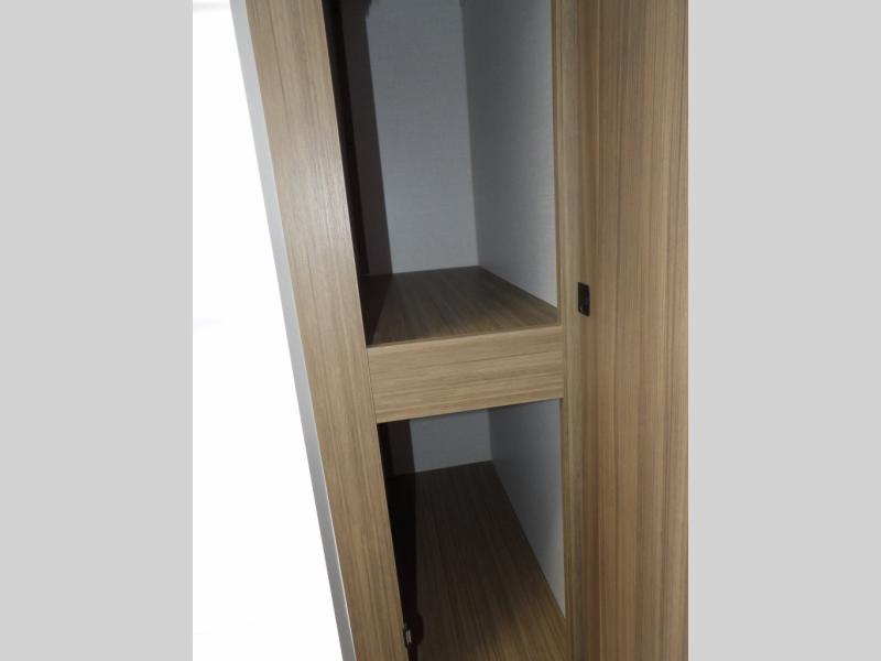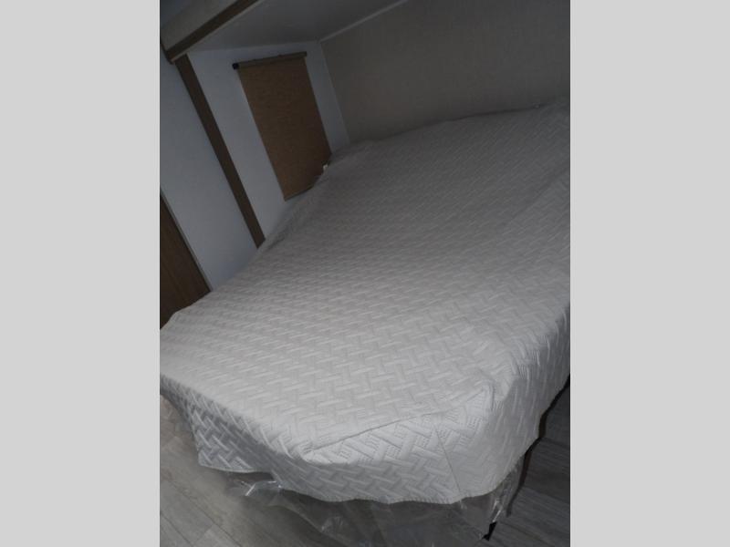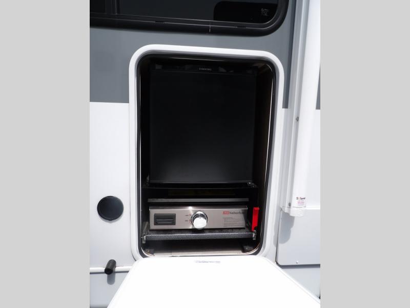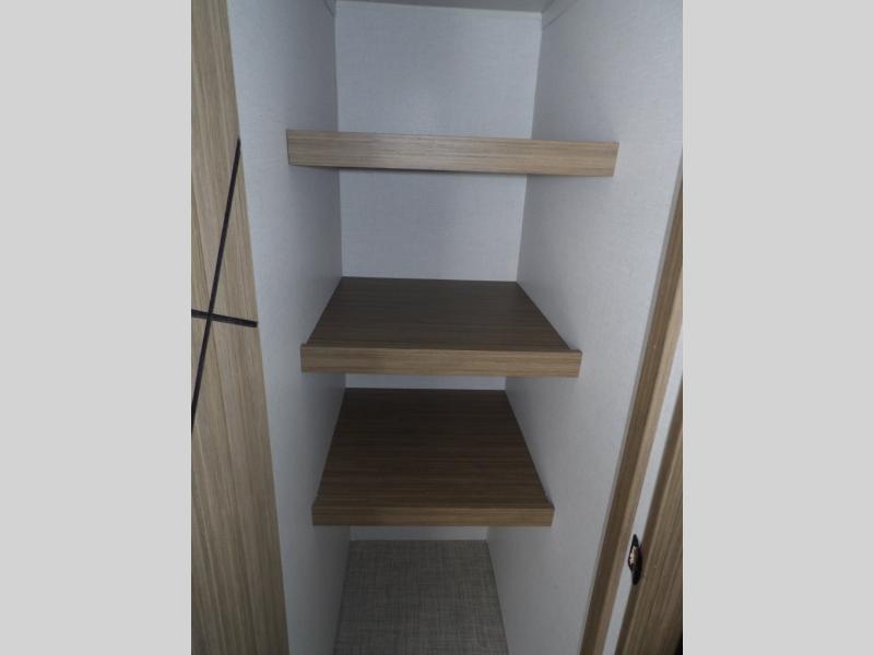 Grab your honey or your best camping friend for fun weekends in this travel trailer. There are two slide outs providing you with more space to relax, plus a front kitchen with ample counter space. The bar top with stools will provide a place to dine each morning, and the theater seat will be perfect for relaxing in the evenings. The middle master bedroom includes a custom king bed with Versa Tilt, a desk with TV prep above where you can work away from home if needed, and even a closet with washer and dryer prep if you plan to go RVing full-time! This model also includes a spacious full rear bath with its own exterior entry door, a walk-in shower, a linen closet for clean towels, and recessed storage for necessities. Don't overlook the exterior with its camp kitchen, 20' awning, and Versa garage for luggage, fishing poles, and more!