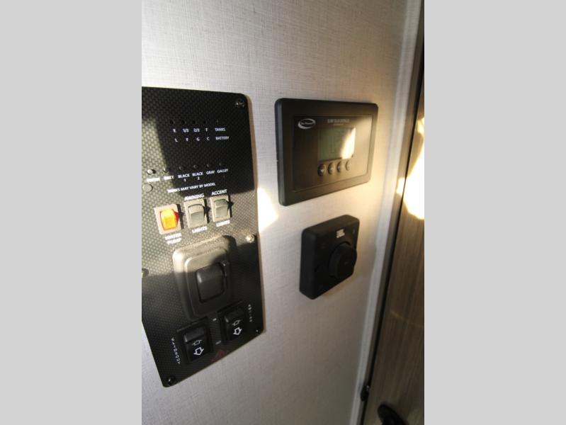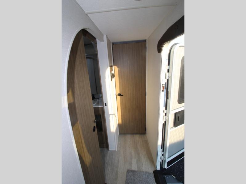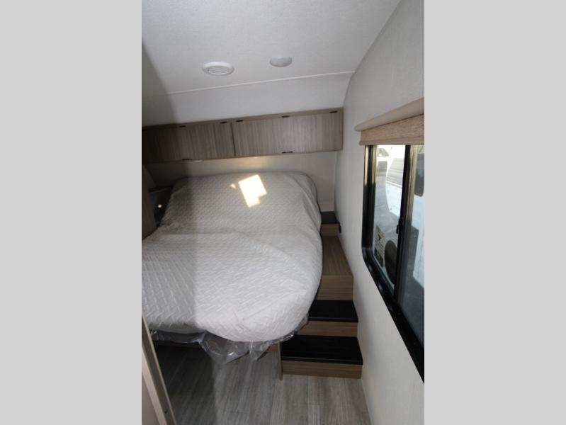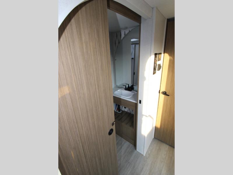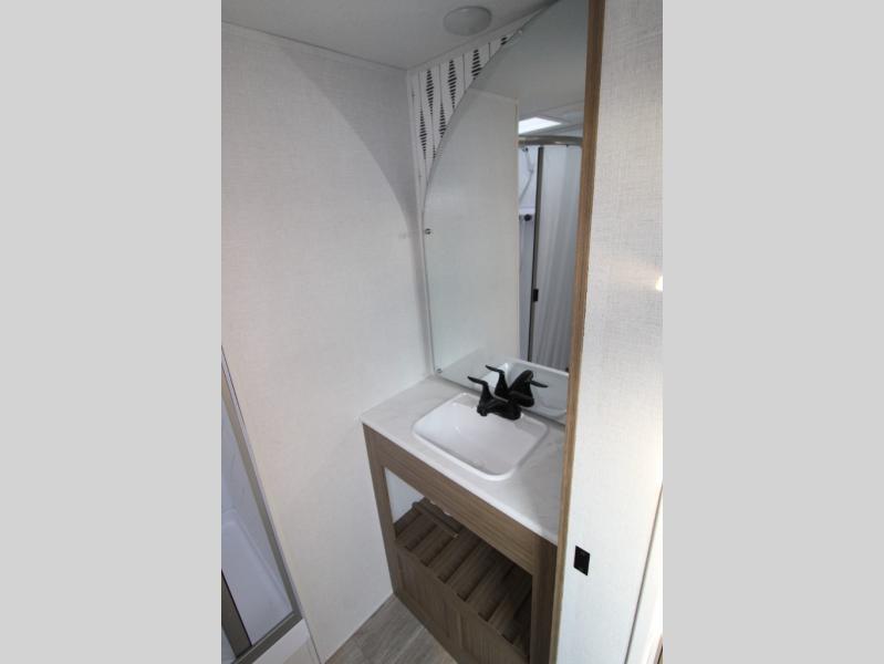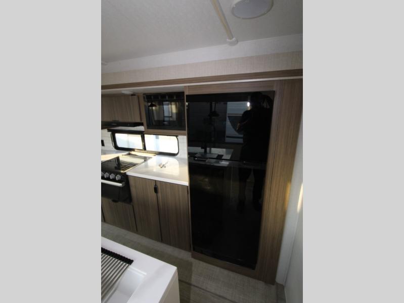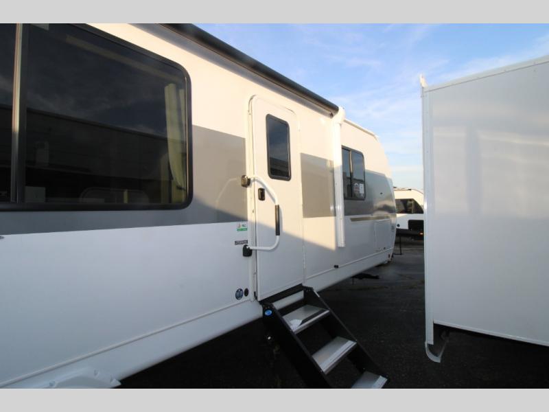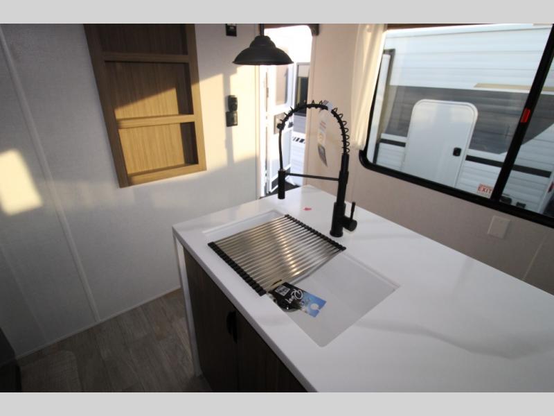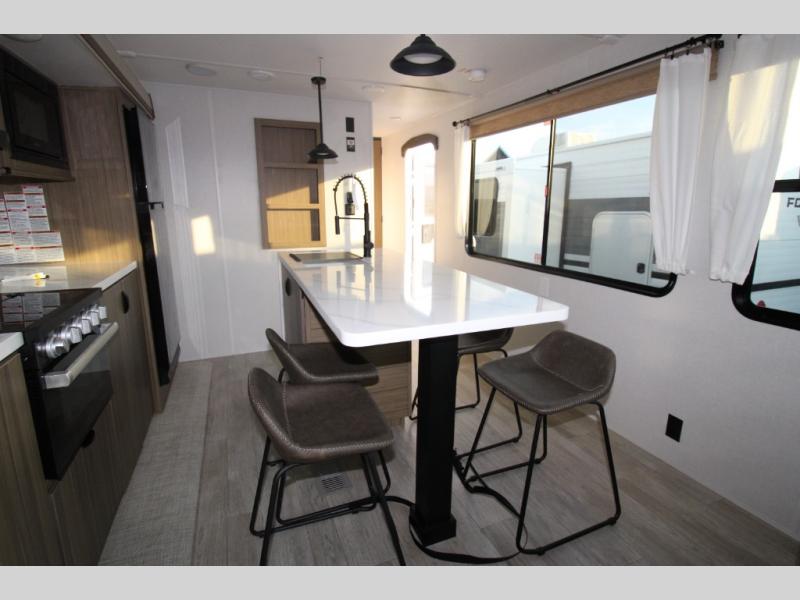 The perfect couple's coach with a view! This Wildwood View features a 7' kitchen island and five bar stools for dining and prep space. The island also houses a double kitchen sink for easy clean-up. Thanks to the island, you will enjoy 15 linear feet of countertop space throughout. The view will be of your choosing thanks to 95.5 square feet of windows that will easily bring the outdoors inside. A sectional sofa across the back of the unit provides ample seating to relax and enjoy a good book or the entertainment center. Behind the entertainment center, you will find hidden storage space with shelves so everything can be tucked out of sight, and an oversized refrigerator will provide enough space for your perishables while you are on vacation as well. A full bath is conveniently located near the main entry featuring StepAbove entry steps leading inside. The bath provides a walk-in shower, vanity with sink, toilet, and linen storage. In the private front bedroom, a Versa-Tilt custom king bed will allow you a relaxing and comfortable night's rest, and once again, a great view out the dual opposing windows. On the outside, a 23' awning offers additional living space protected from the elements, and a spacious pass-through storage compartment will allow you to stow away your camp chairs and outdoor equipment and games easily for transport.