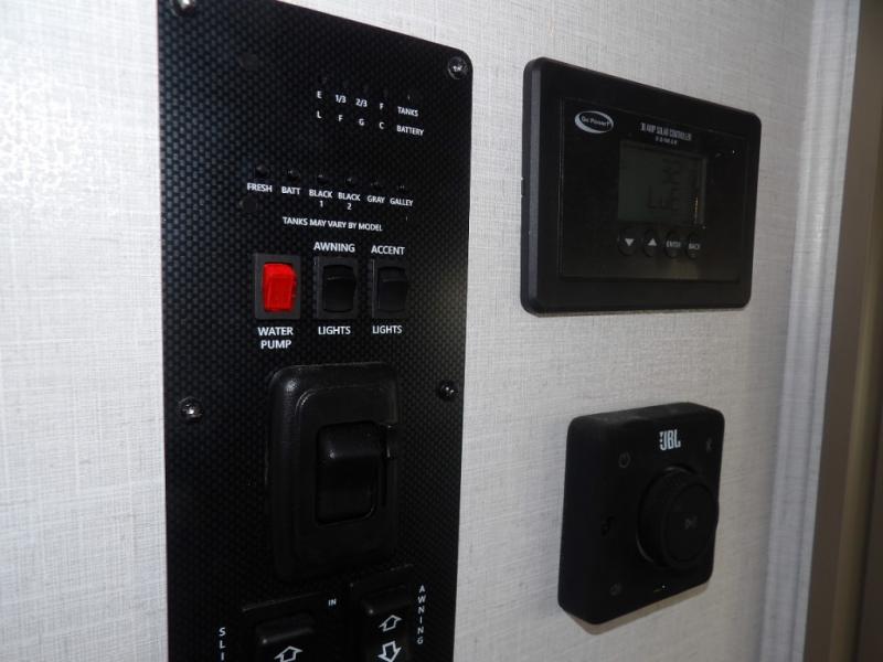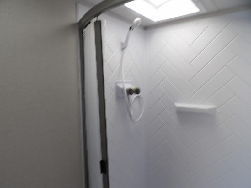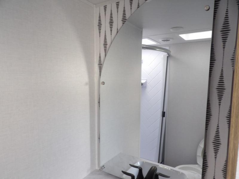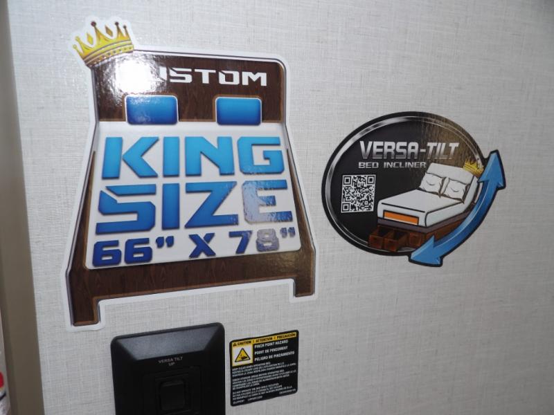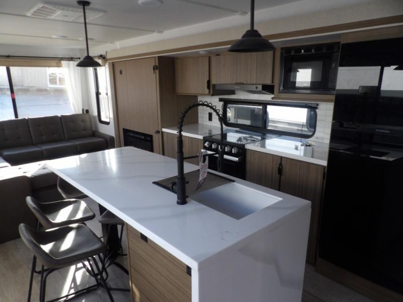 The perfect couple's coach with a view! This Wildwood View features a 7' kitchen island and five bar stools for dining and prep space. The island also houses a double kitchen sink for easy clean-up. Thanks to the island, you will enjoy 15 linear feet of countertop space throughout. The view will be of your choosing thanks to 95.5 square feet of windows that will easily bring the outdoors inside. A sectional sofa across the back of the unit provides ample seating to relax and enjoy a good book or the entertainment center. Behind the entertainment center, you will find hidden storage space with shelves so everything can be tucked out of sight, and an oversized refrigerator will provide enough space for your perishables while you are on vacation as well. A full bath is conveniently located near the main entry featuring StepAbove entry steps leading inside. The bath provides a walk-in shower, vanity with sink, toilet, and linen storage. In the private front bedroom, a Versa-Tilt custom king bed will allow you a relaxing and comfortable night's rest, and once again, a great view out the dual opposing windows. On the outside, a 23' awning offers additional living space protected from the elements, and a spacious pass-through storage compartment will allow you to stow away your camp chairs and outdoor equipment and games easily for transport.