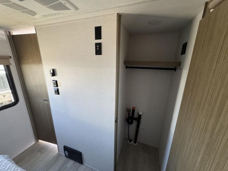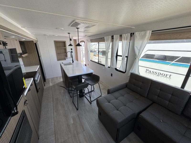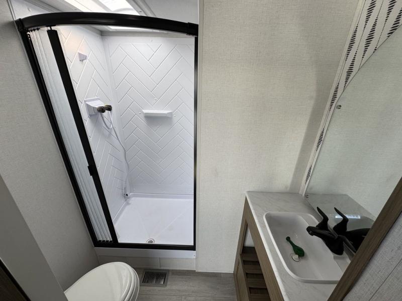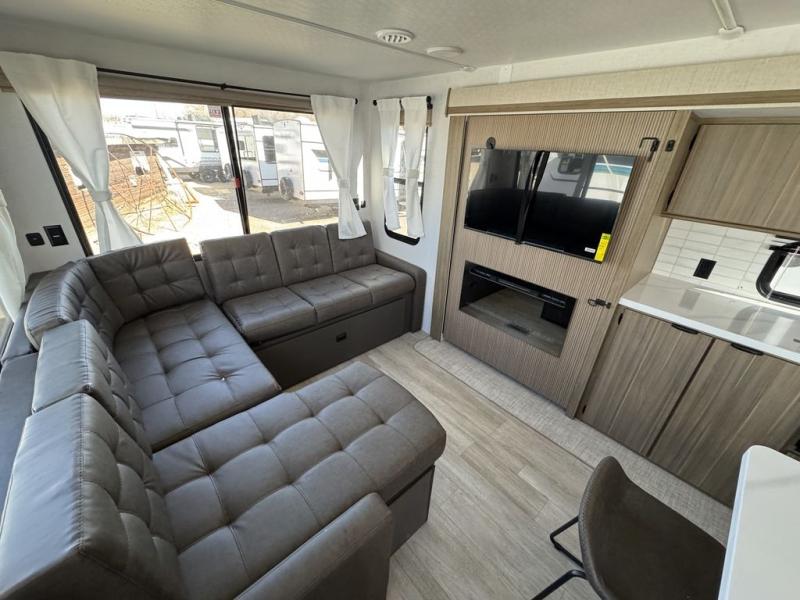 The perfect couple's coach with a view! This Wildwood View features a kitchen island and five bar stools for dining and prep space. A sectional sofa across the back of the unit provides ample seating to relax and enjoy a good book or the entertainment center. Behind the entertainment center, you will find hidden storage space with shelves so everything can be tucked out of sight, and an oversized refrigerator will provide enough space for your perishables while you are on vacation as well. A full bath is conveniently located near the main entry featuring StepAbove entry steps leading inside. The bath provides a walk-in shower, vanity with sink, toilet, and linen storage. In the private front bedroom, a Versa-Tilt custom king bed will allow you a relaxing and comfortable night's rest, and once again, a great view out the dual opposing windows. On the outside, an awning offers additional living space protected from the elements, and a spacious pass-through storage compartment will allow you to stow away your camp chairs and outdoor equipment and games easily for transport.
