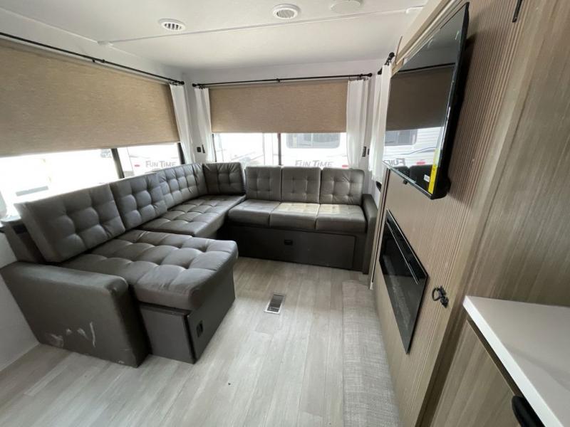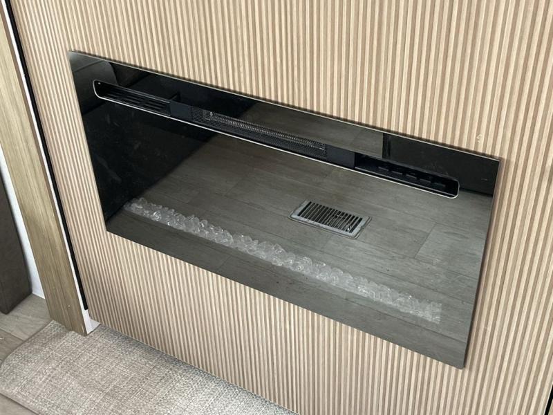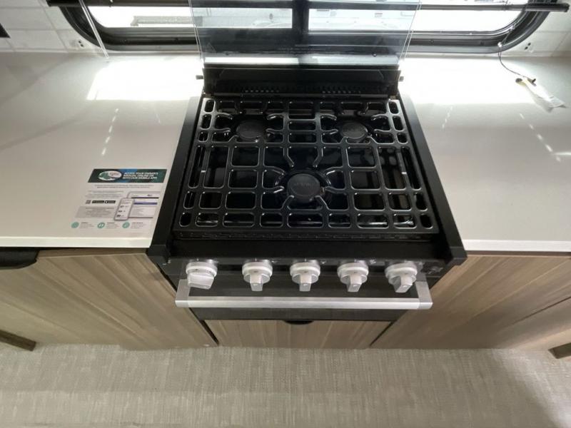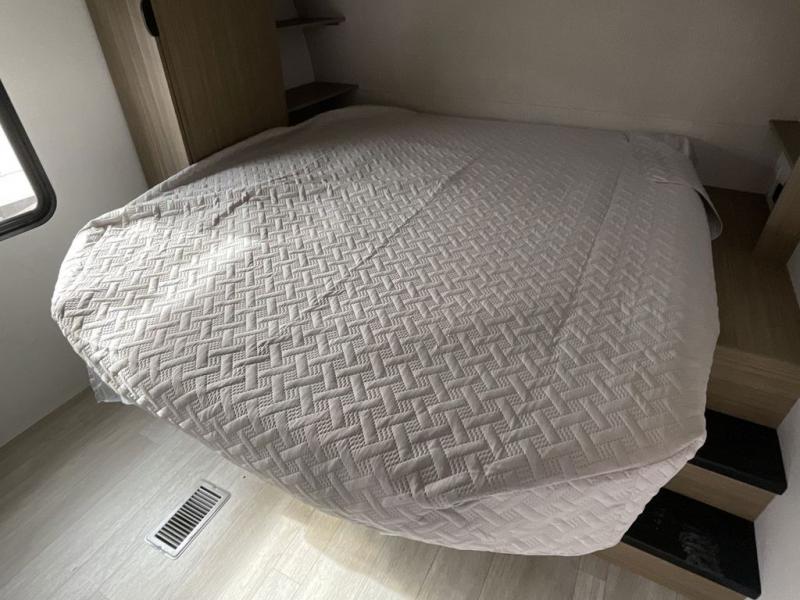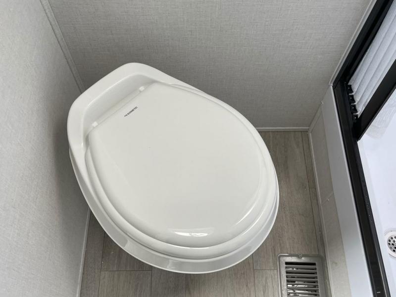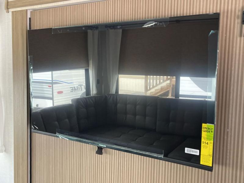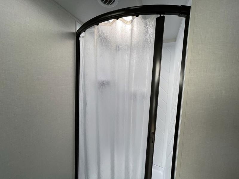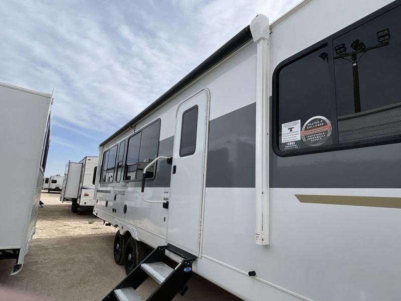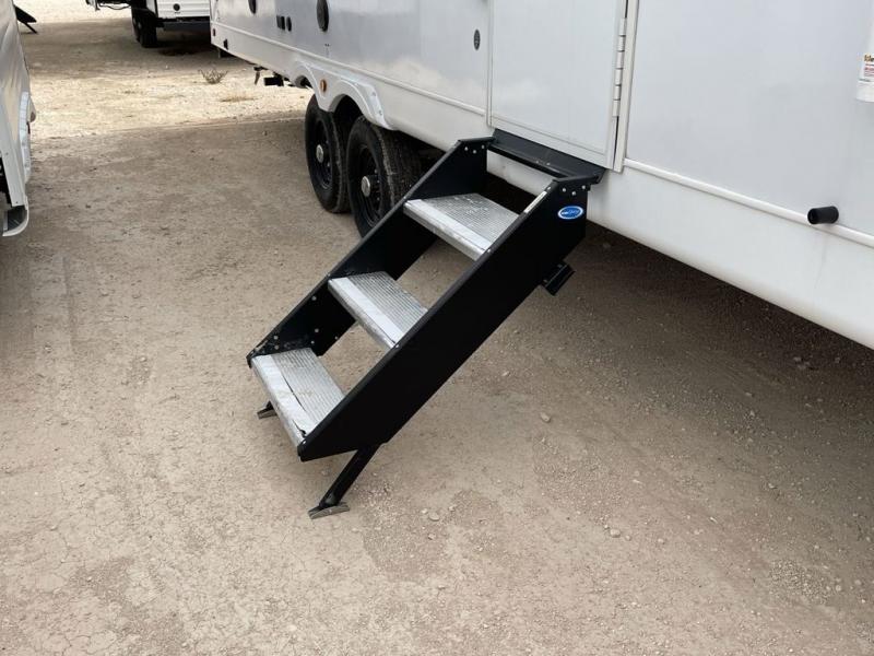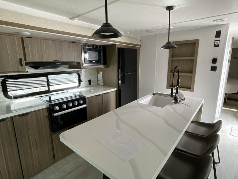 The perfect couple's coach with a view! This Wildwood View features a kitchen island and five bar stools for dining and prep space. A sectional sofa across the back of the unit provides ample seating to relax and enjoy a good book or the entertainment center. Behind the entertainment center, you will find hidden storage space with shelves so everything can be tucked out of sight, and an oversized refrigerator will provide enough space for your perishables while you are on vacation as well. A full bath is conveniently located near the main entry featuring StepAbove entry steps leading inside. The bath provides a walk-in shower, vanity with sink, toilet, and linen storage. In the private front bedroom, a Versa-Tilt custom king bed will allow you a relaxing and comfortable night's rest, and once again, a great view out the dual opposing windows. On the outside, an awning offers additional living space protected from the elements, and a spacious pass-through storage compartment will allow you to stow away your camp chairs and outdoor equipment and games easily for transport.