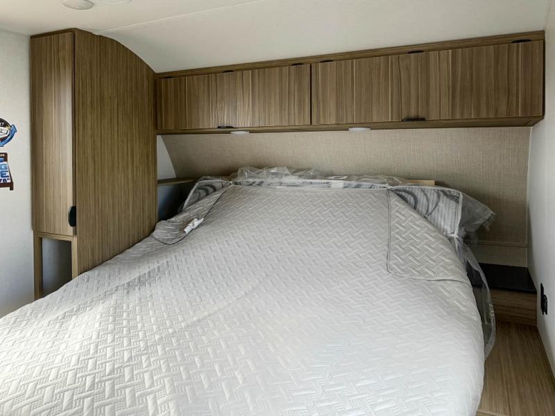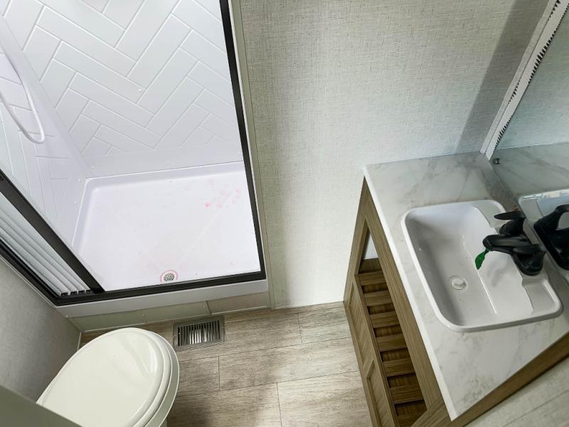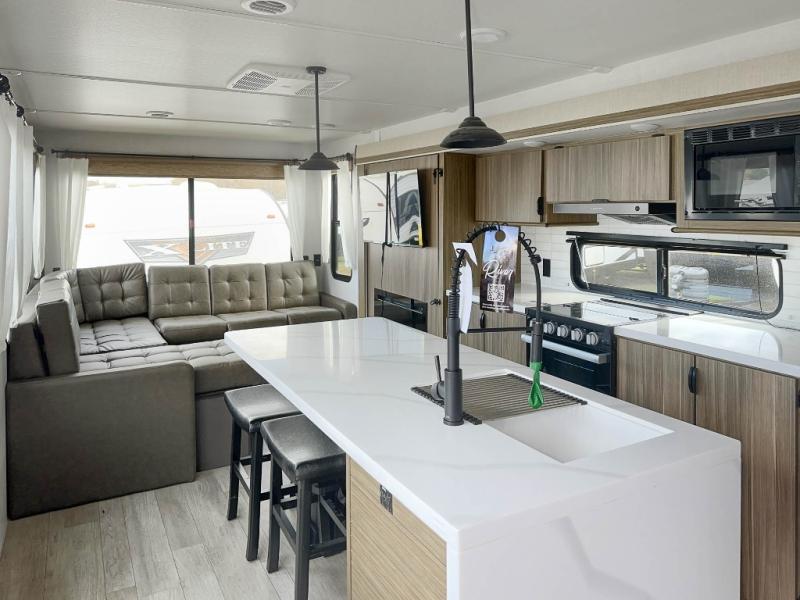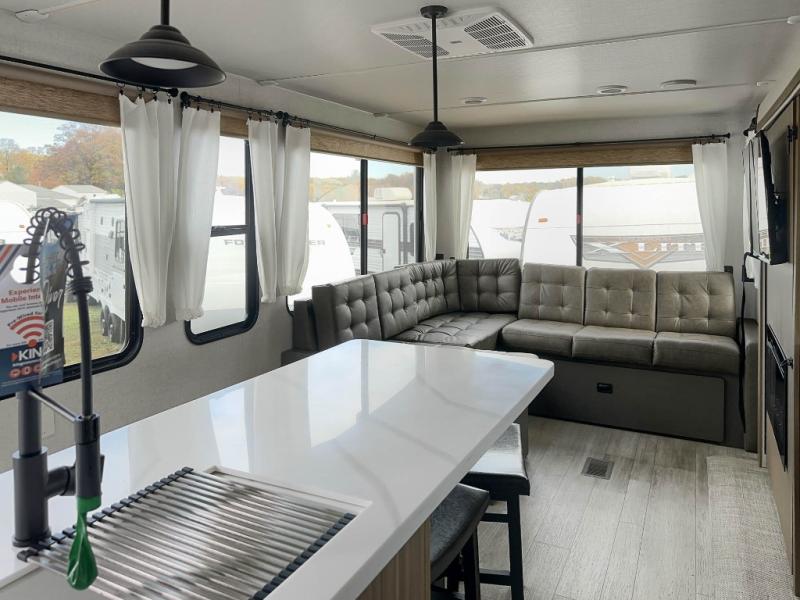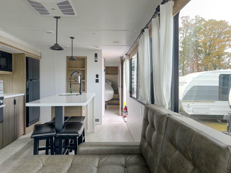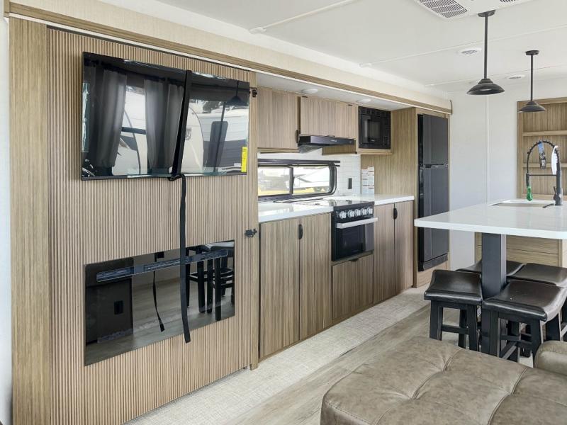 The perfect couple's coach with a view! This Wildwood View features a kitchen island and five bar stools for dining and prep space. A sectional sofa across the back of the unit provides ample seating to relax and enjoy a good book or the entertainment center. Behind the entertainment center, you will find hidden storage space with shelves so everything can be tucked out of sight, and an oversized refrigerator will provide enough space for your perishables while you are on vacation as well. A full bath is conveniently located near the main entry featuring StepAbove entry steps leading inside. The bath provides a walk-in shower, vanity with sink, toilet, and linen storage. In the private front bedroom, a Versa-Tilt custom king bed will allow you a relaxing and comfortable night's rest, and once again, a great view out the dual opposing windows. On the outside, an awning offers additional living space protected from the elements, and a spacious pass-through storage compartment will allow you to stow away your camp chairs and outdoor equipment and games easily for transport.