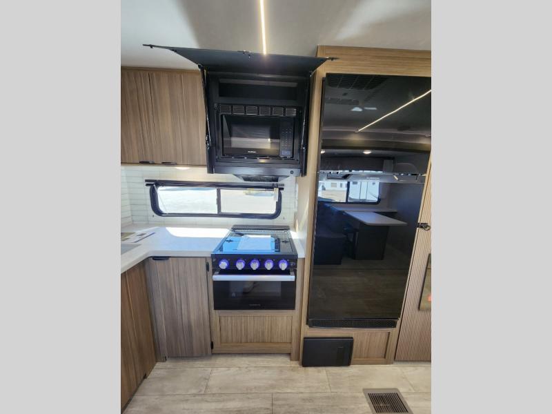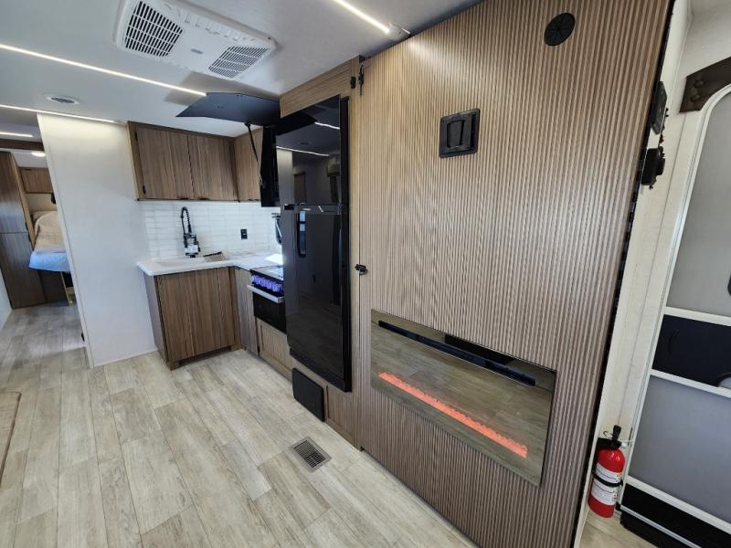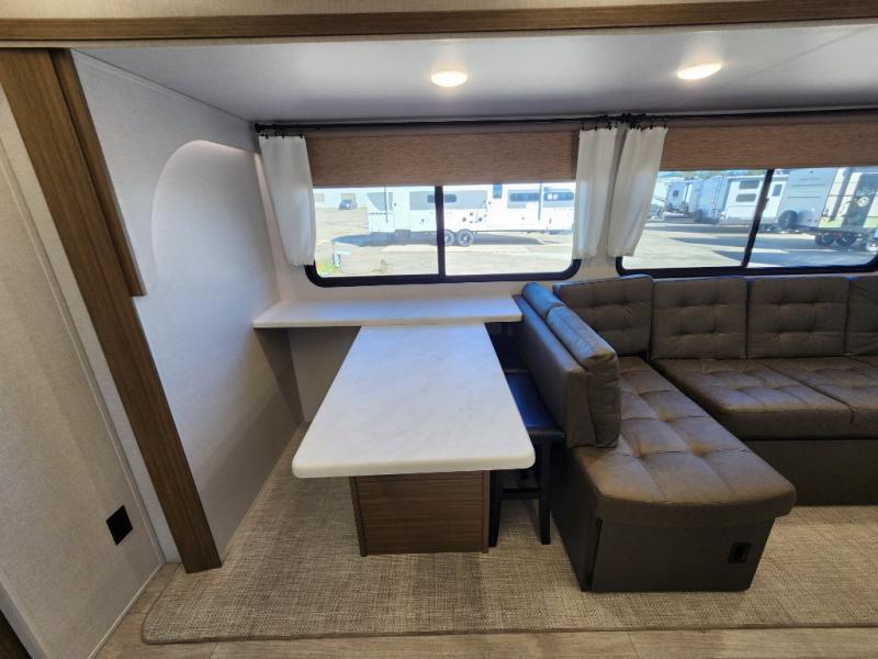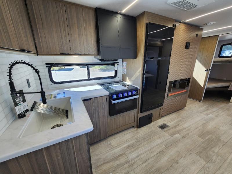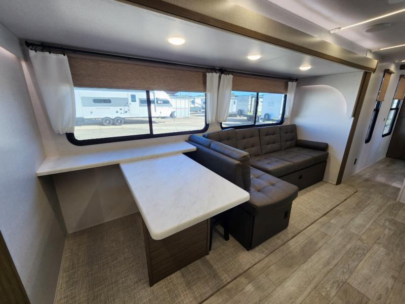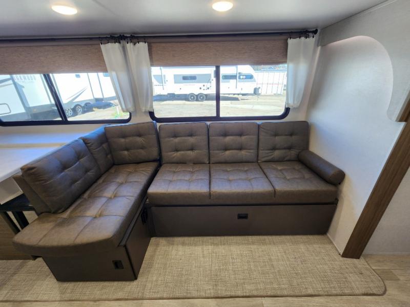 When you're ready to upgrade your RV to a unit with more sleeping space and comfort, choose this Wildwood travel trailer, and you'll never look back. After setting up camp, put out the large slide and prepare lunch indoors or outside at the outdoor kitchen, and the 20' power awning will shade you from the sun. The kids will find all their snacks in the hidden pantry behind the entertainment center, and their drinks in the oversized fridge. The U-shaped dinette is a part of the Versa Lounge, and it will provide comfortable seating space. This model features a rear private bunkhouse with a set of double bed bunks, a desk and a half bath. You will also love the front private bedroom that includes a custom king bed with Versa-Tilt and dual bedside closets with nightstands below.