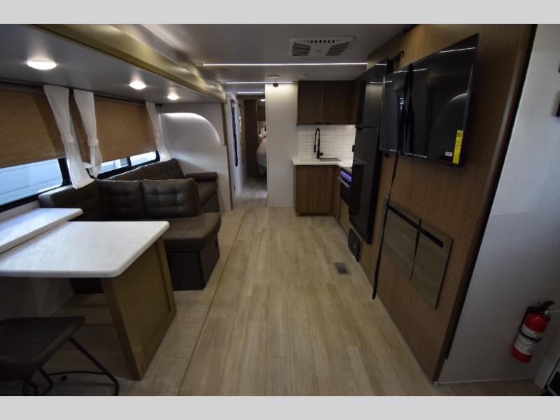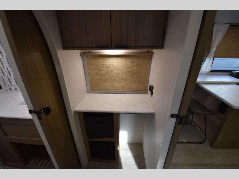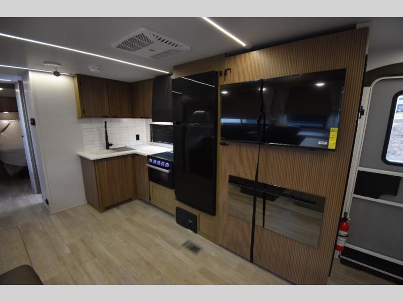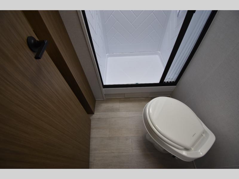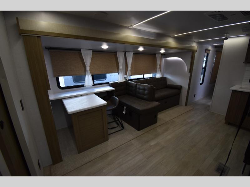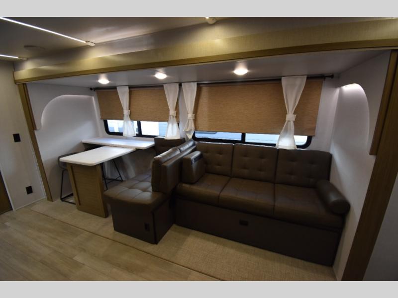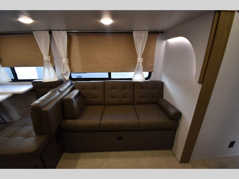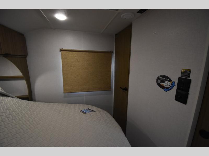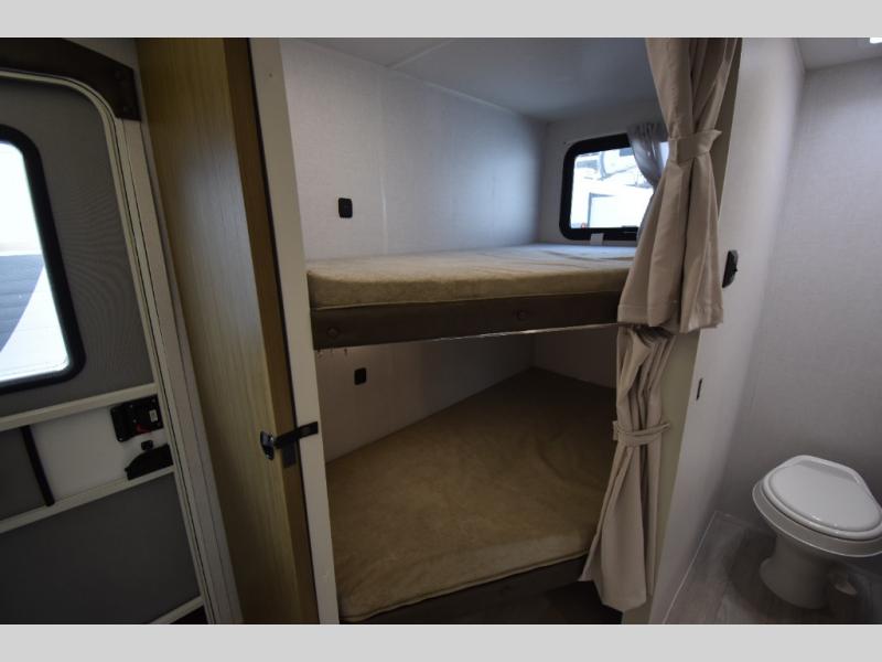When you're ready to upgrade your RV to a unit with more sleeping space and comfort, choose this Wildwood travel trailer, and you'll never look back. After setting up camp, put out the large slide and prepare lunch indoors or outside at the outdoor kitchen, and the 20' power awning will shade you from the sun. The kids will find all their snacks in the hidden pantry behind the entertainment center, and their drinks in the oversized fridge. There is a Versa-Lounge to relax on and a Versa Flex table where you can dine and work from home. This model features a rear private bunkhouse with a set of double bed bunks, a desk and a half bath. You will also love the front private bedroom that includes a custom king bed with Versa-Tilt and dual bedside closets with nightstands below.