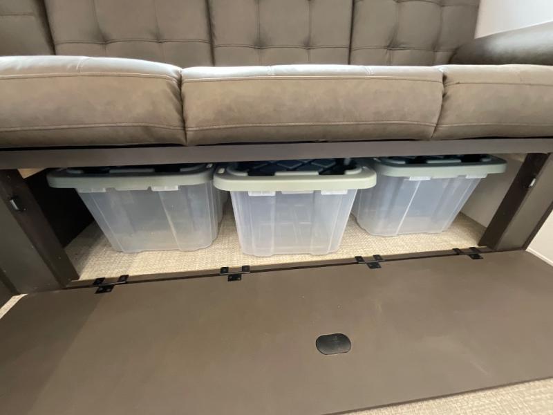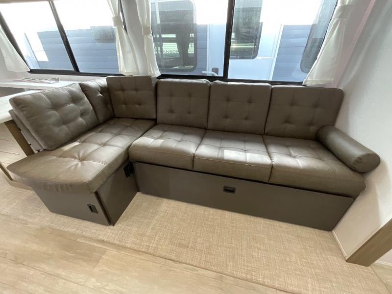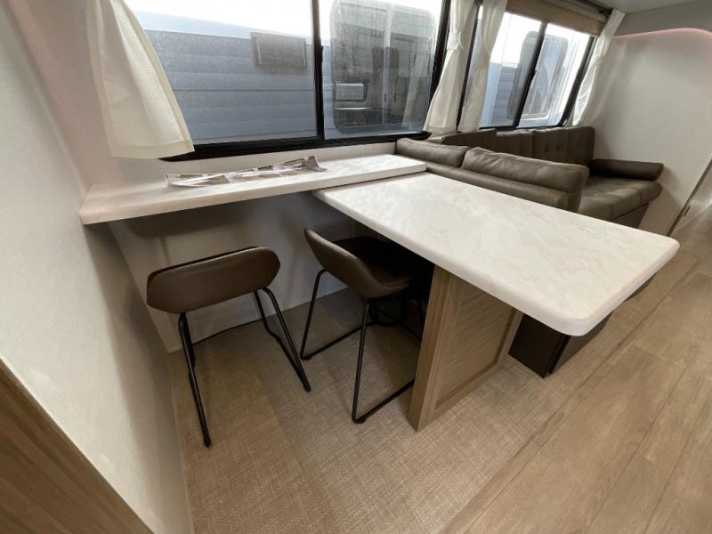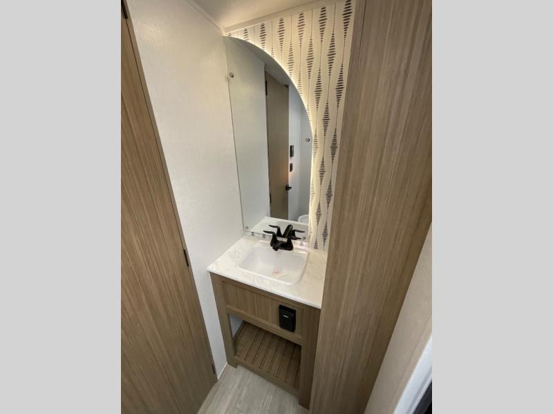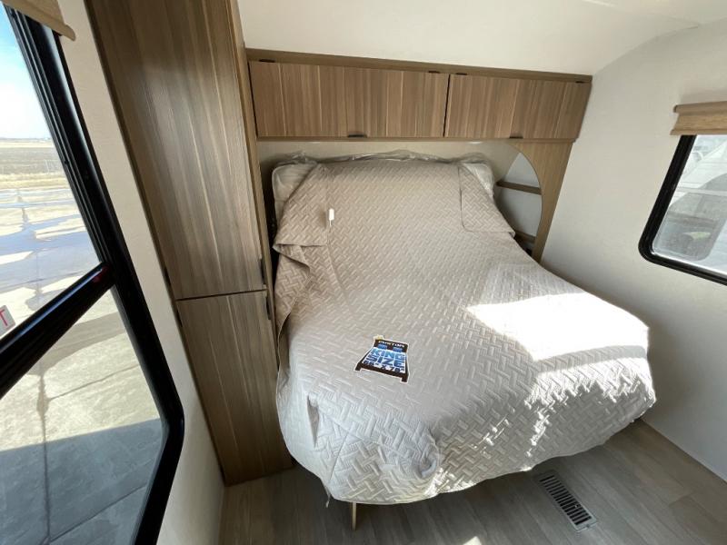 When you're ready to upgrade your RV to a unit with more sleeping space and comfort, choose this Wildwood travel trailer, and you'll never look back. After setting up camp, put out the large slide and prepare lunch indoors or outside at the outdoor kitchen, and the 20' power awning will shade you from the sun. The kids will find all their snacks in the hidden pantry behind the entertainment center, and their drinks in the oversized fridge. There is a Versa-Lounge to relax on and a Versa Flex table where you can dine and work from home. This model features a rear private bunkhouse with a set of double bed bunks, a desk and a half bath. You will also love the front private bedroom that includes a custom king bed with Versa-Tilt and dual bedside closets with nightstands below.