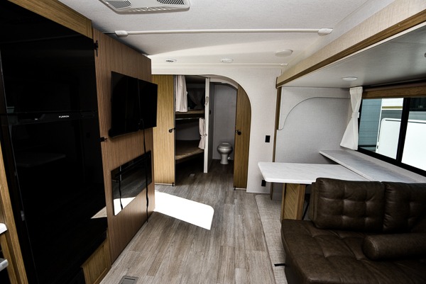 When you're ready to upgrade your RV to a unit with more sleeping space and comfort, choose this Wildwood travel trailer, and you'll never look back. After setting up camp, put out the large slide and prepare lunch indoors or outside at the outdoor kitchen, and the 20' power awning will shade you from the sun. The kids will find all their snacks in the hidden pantry behind the entertainment center, and their drinks in the oversized fridge. There is a Versa-Lounge to relax on and a Versa Flex table where you can dine and work from home. This model features a rear private bunkhouse with a set of double bed bunks, a desk and a half bath. You will also love the front private bedroom that includes a custom king bed with Versa-Tilt and dual bedside closets with nightstands below.