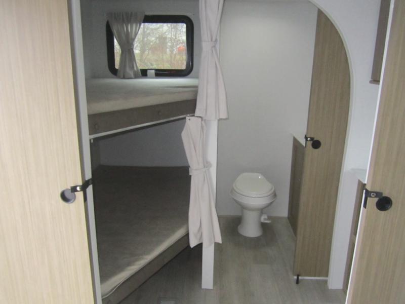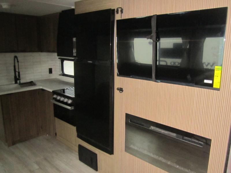 When you're ready to upgrade your RV to a unit with more sleeping space and comfort, choose this Wildwood travel trailer, and you'll never look back. After setting up camp, put out the large slide and prepare lunch indoors or outside at the outdoor kitchen, and the 20' power awning will shade you from the sun. The kids will find all their snacks in the hidden pantry behind the entertainment center, and their drinks in the oversized fridge. There is a Versa-Lounge to relax on and a Versa Flex table where you can dine and work from home. This model features a rear private bunkhouse with a set of double bed bunks, a desk and a half bath. You will also love the front private bedroom that includes a custom king bed with Versa-Tilt and dual bedside closets with nightstands below.