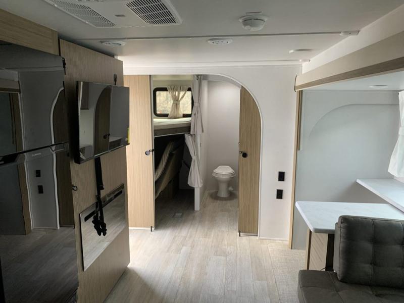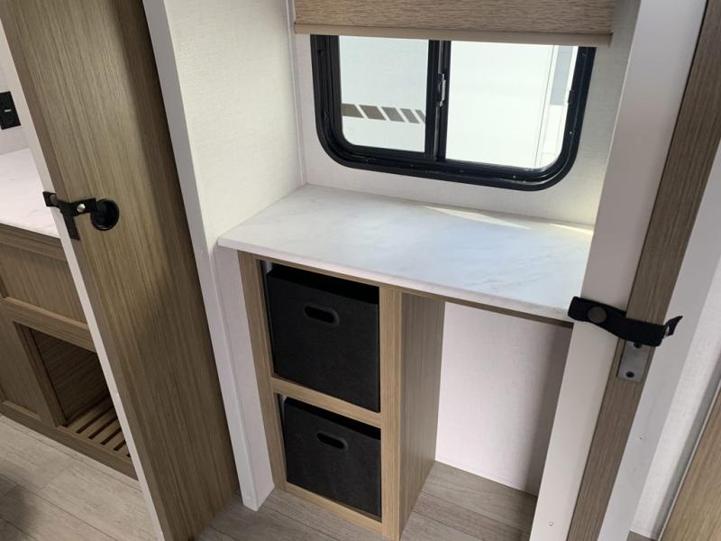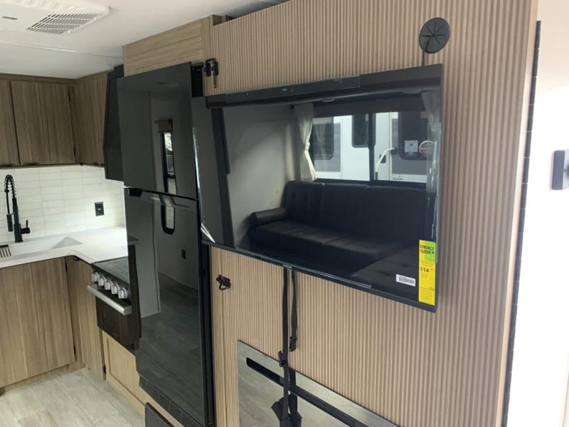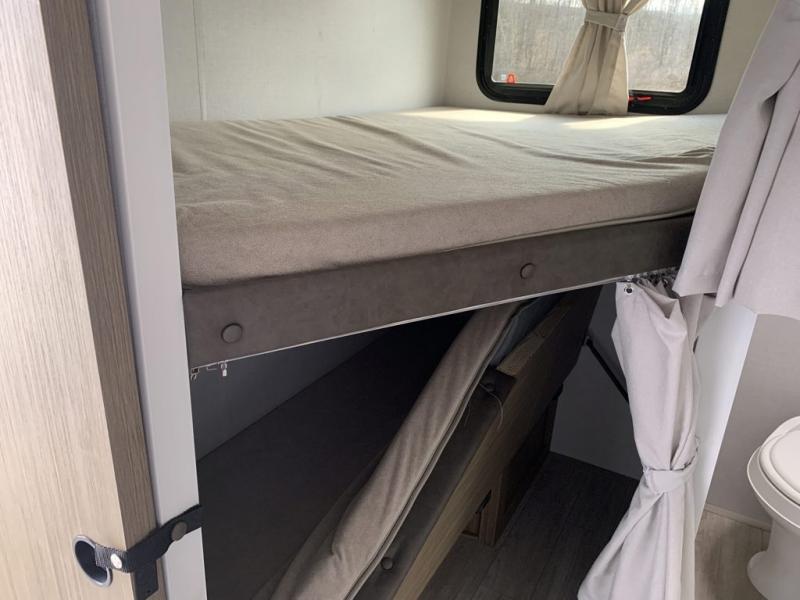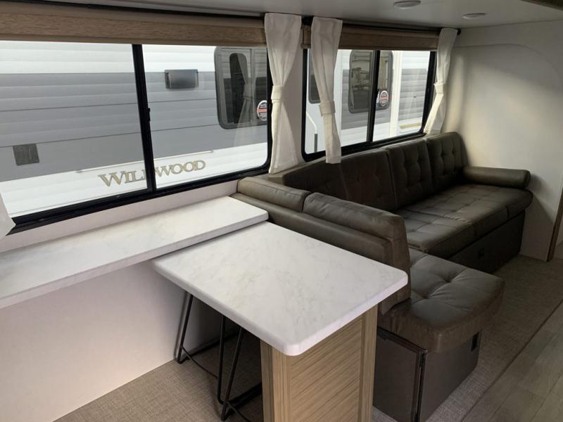 When you're ready to upgrade your RV to a unit with more sleeping space and comfort, choose this Wildwood travel trailer, and you'll never look back. After setting up camp, put out the large slide and prepare lunch indoors or outside at the outdoor kitchen, and the 20' power awning will shade you from the sun. The kids will find all their snacks in the hidden pantry behind the entertainment center, and their drinks in the oversized fridge. There is a Versa-Lounge to relax on and a Versa Flex table where you can dine and work from home. This model features a rear private bunkhouse with a set of double bed bunks, a desk and a half bath. You will also love the front private bedroom that includes a custom king bed with Versa-Tilt and dual bedside closets with nightstands below.