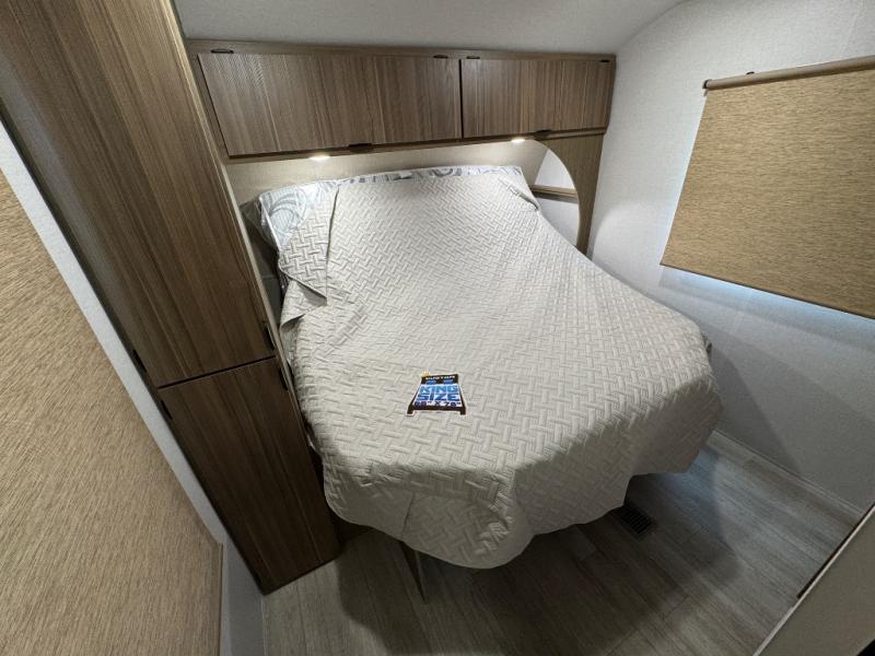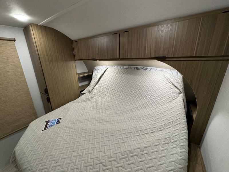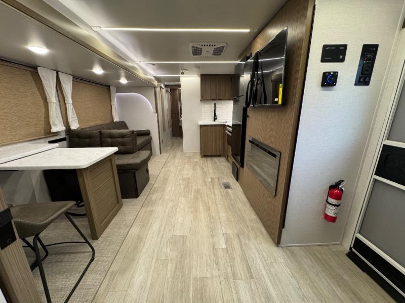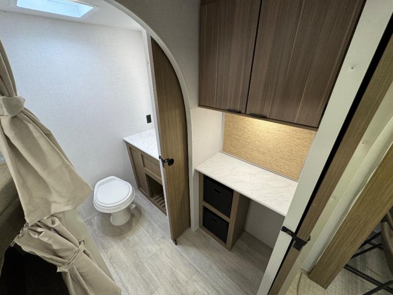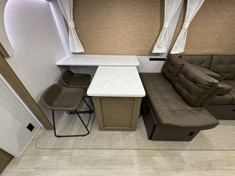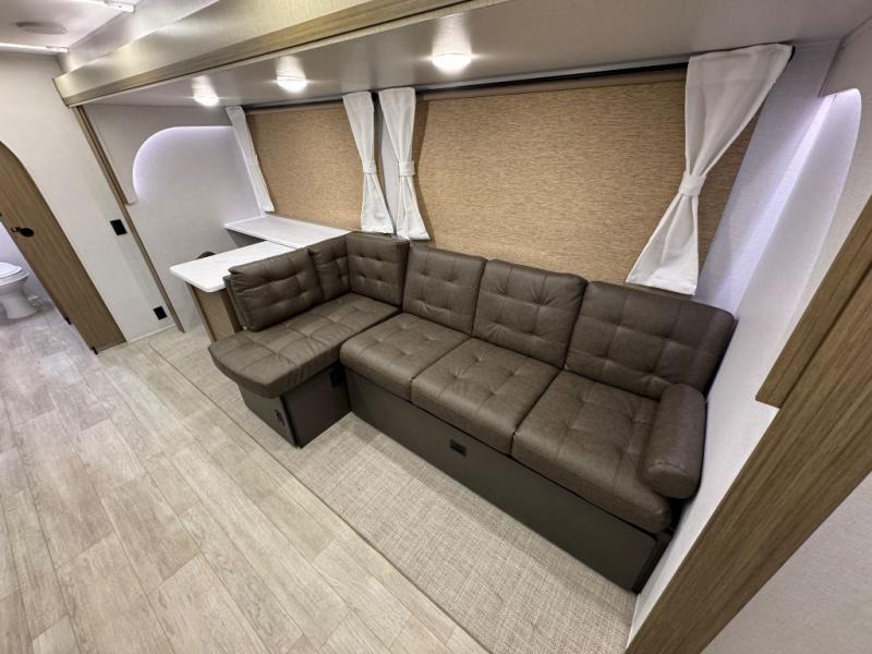 When you're ready to upgrade your RV to a unit with more sleeping space and comfort, choose this Wildwood travel trailer, and you'll never look back. After setting up camp, put out the large slide and prepare lunch indoors or outside at the outdoor kitchen, and the 20' power awning will shade you from the sun. The kids will find all their snacks in the hidden pantry behind the entertainment center, and their drinks in the oversized fridge. There is a Versa-Lounge to relax on and a Versa Flex table where you can dine and work from home. This model features a rear private bunkhouse with a set of double bed bunks, a desk and a half bath. You will also love the front private bedroom that includes a custom king bed with Versa-Tilt and dual bedside closets with nightstands below.