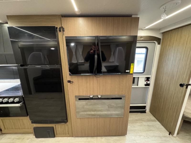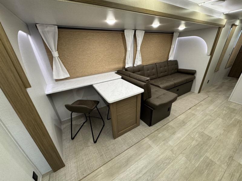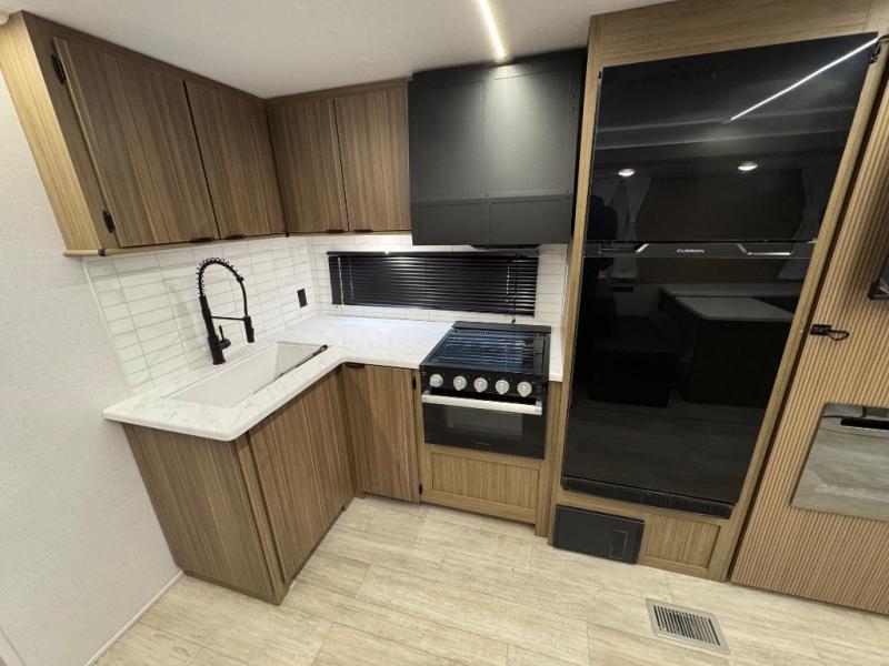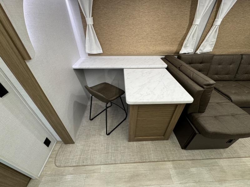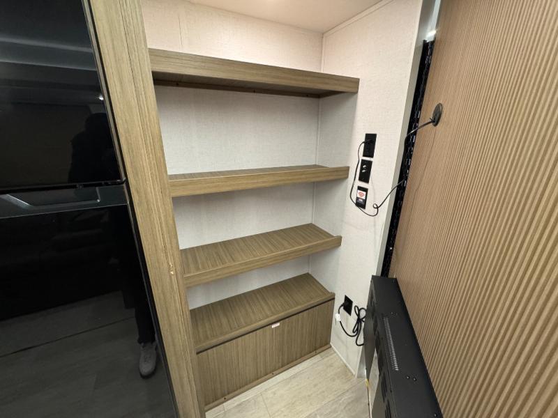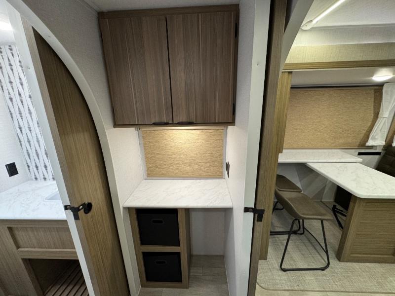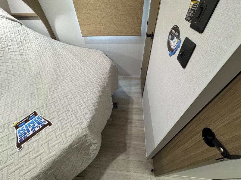 When you're ready to upgrade your RV to a unit with more sleeping space and comfort, choose this Wildwood travel trailer, and you'll never look back. After setting up camp, put out the large slide and prepare lunch indoors or outside at the outdoor kitchen, and the 20' power awning will shade you from the sun. The kids will find all their snacks in the hidden pantry behind the entertainment center, and their drinks in the oversized fridge. There is a Versa-Lounge to relax on and a Versa Flex table where you can dine and work from home. This model features a rear private bunkhouse with a set of double bed bunks, a desk and a half bath. You will also love the front private bedroom that includes a custom king bed with Versa-Tilt and dual bedside closets with nightstands below.