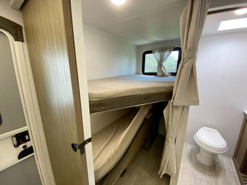 When you're ready to upgrade your RV to a unit with more sleeping space and comfort, choose this Wildwood Platinum travel trailer, and you'll never look back. After setting up camp, put out the large slide and prepare lunch indoors or outside at the outdoor kitchen, and the 20' power awning will shade you from the sun. The kids will find all their snacks in the hidden pantry behind the entertainment center, and their drinks in the oversized fridge. There is a Versa-Lounge to relax on and a Versa Flex table where you can dine and work from home. This model features a rear private bunkhouse with a set of double bed bunks, a desk and a half bath. You will also love the front private bedroom that includes a custom king bed and dual bedside closets with nightstands below.